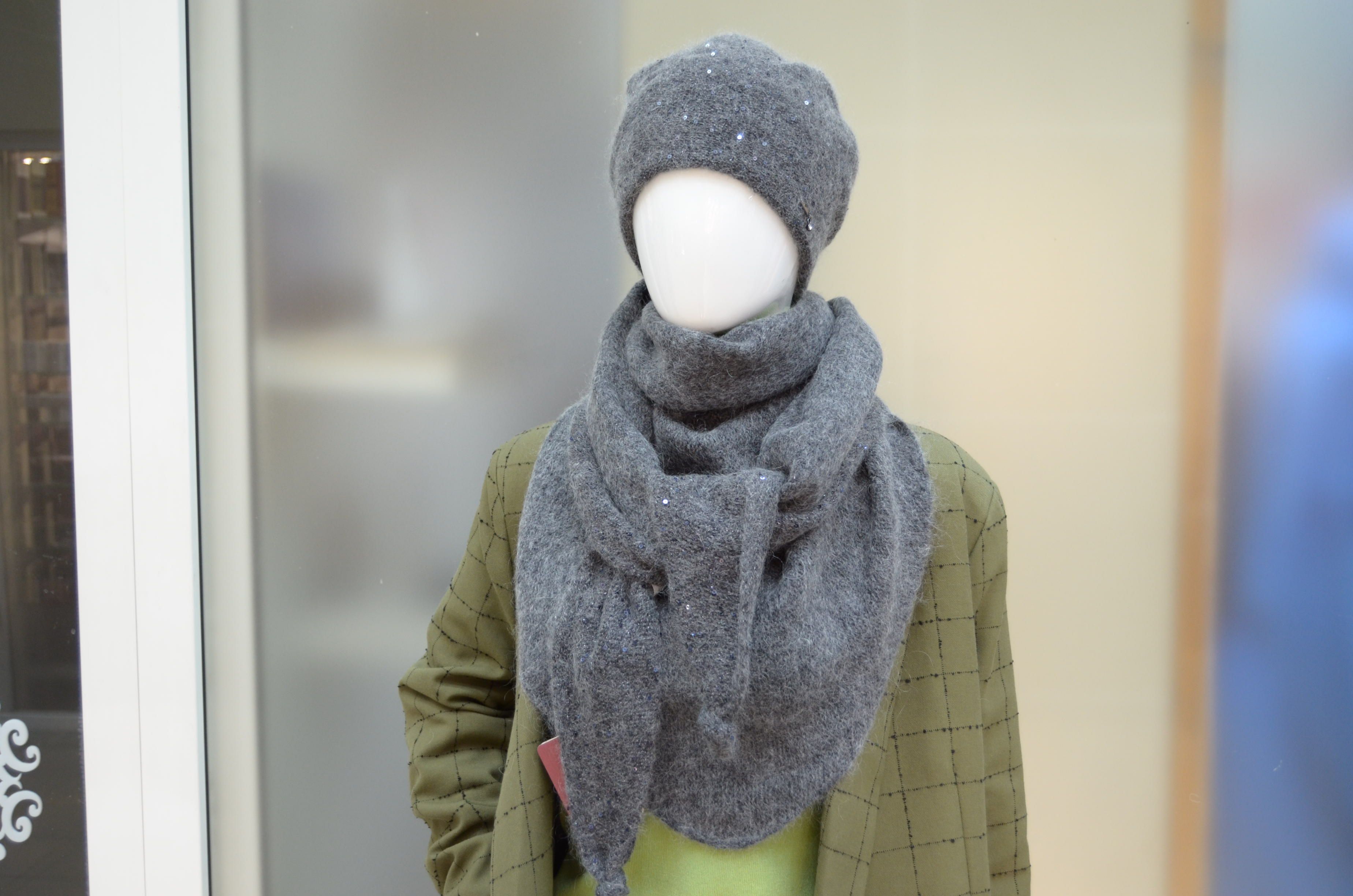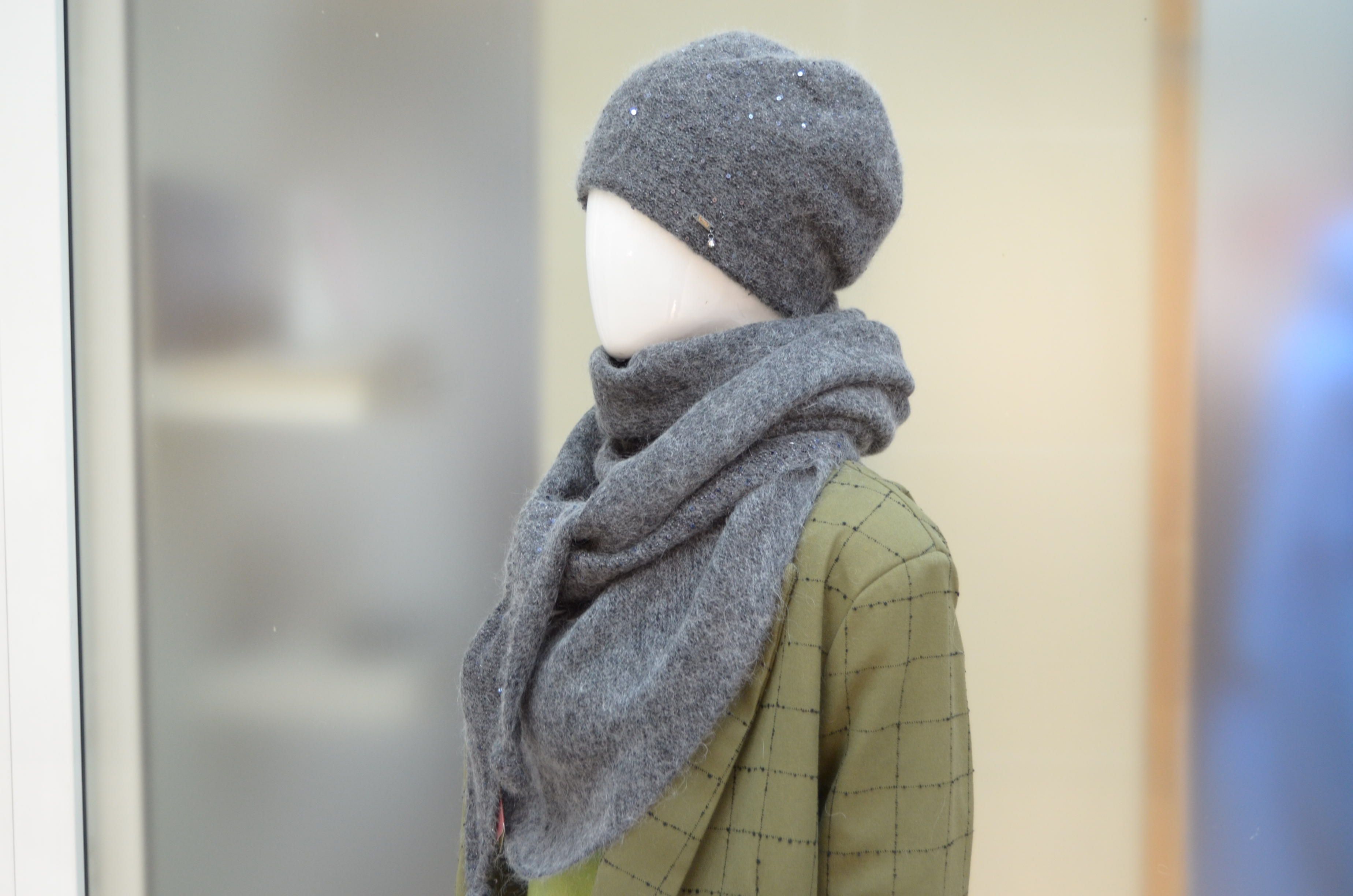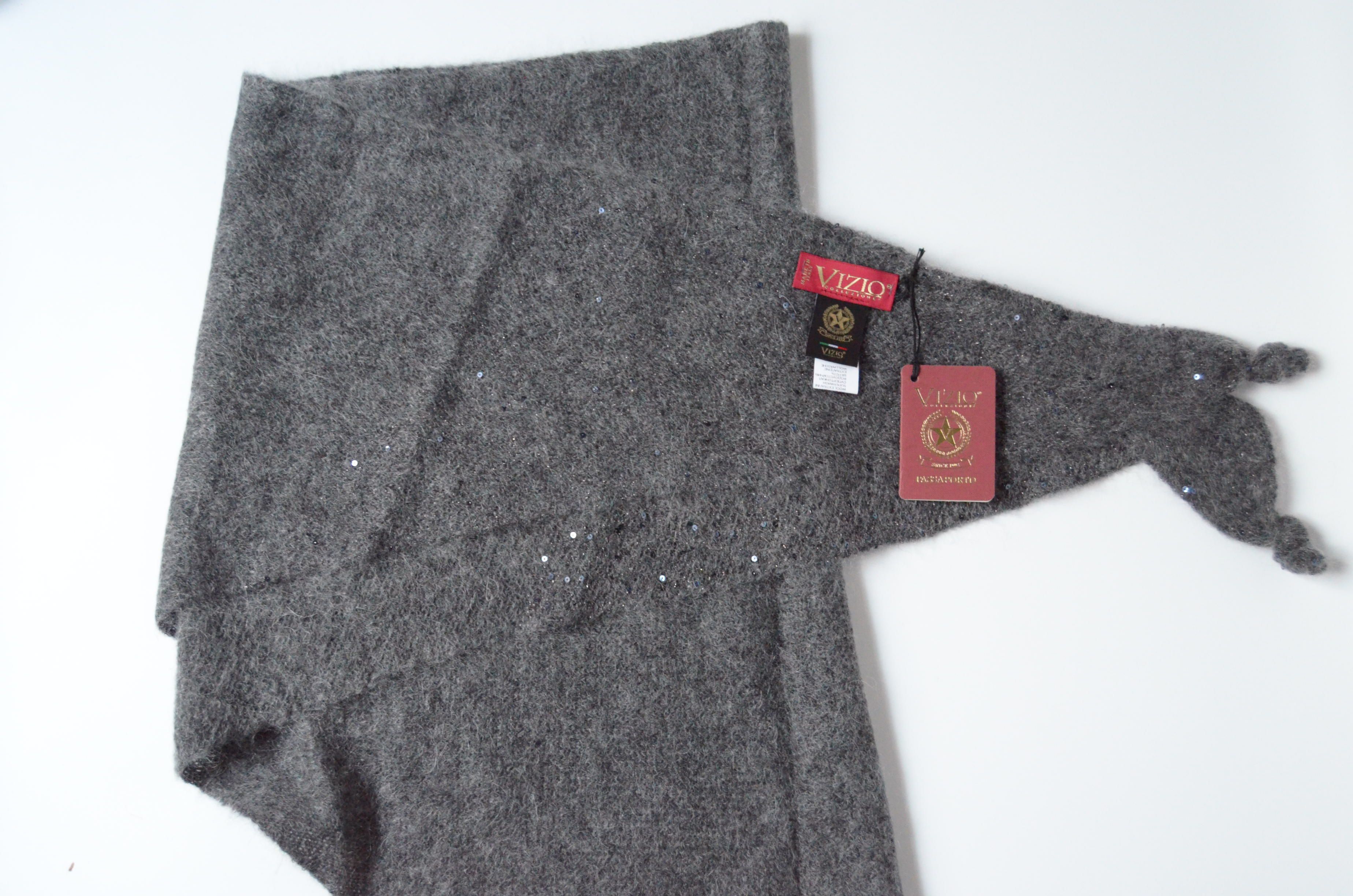 Итальянский шарф платок вязаный антрацитового цвета для женщин Vizio Италия 6943 ST ( в коллекции 2022 - 2023 это артикул 8067 ST ) под классические шапки, береты, шляпы и кепки Италии Визио с пайетками