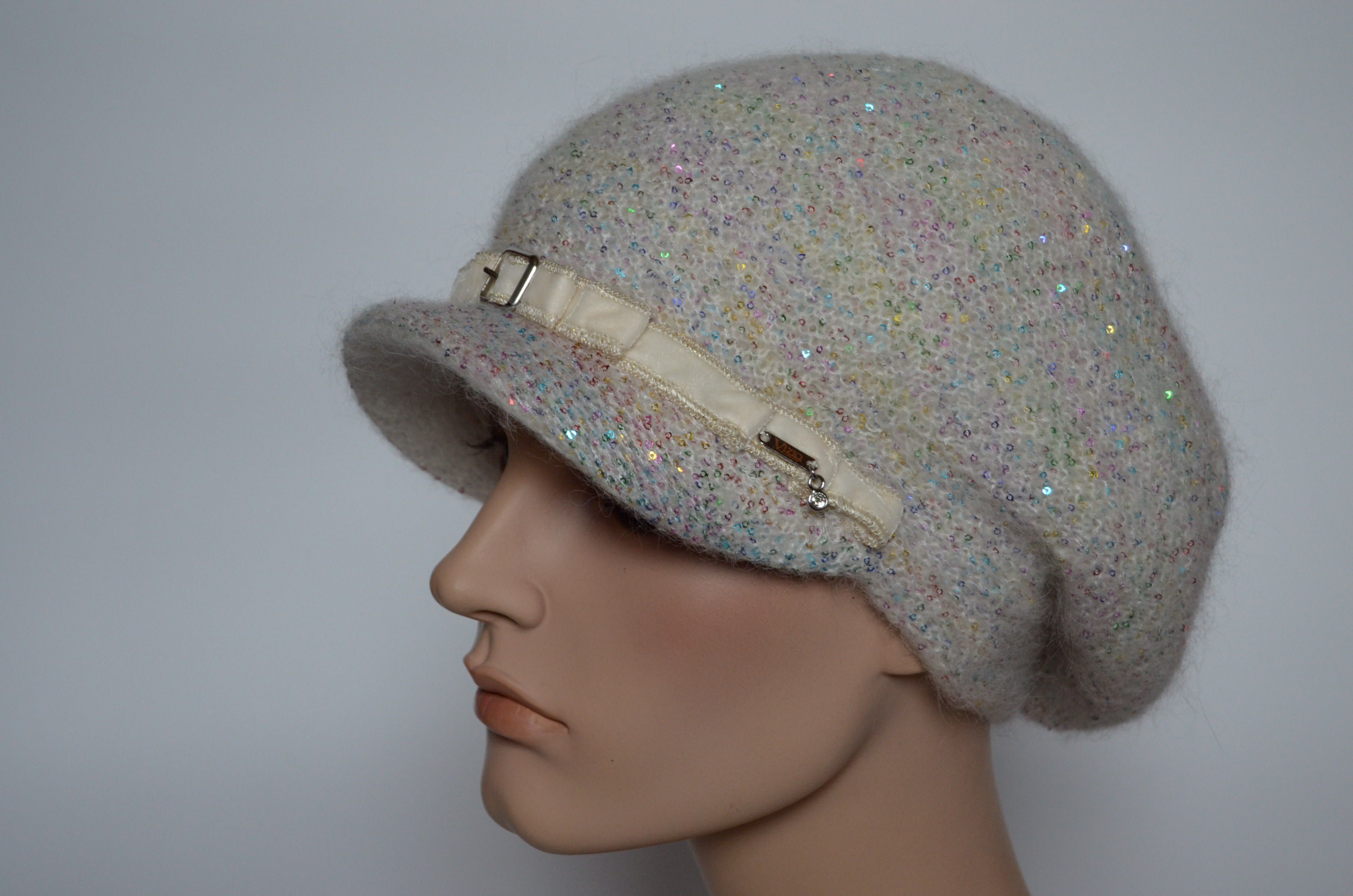 Женская кепка с козырьком вязаная осень - зима 2021 - 2022 Визио Vizio Италия 6997 белая с разноцветными пайетками коллекция итальянских зимних вязаных кепок для женщин Vizio Collezione