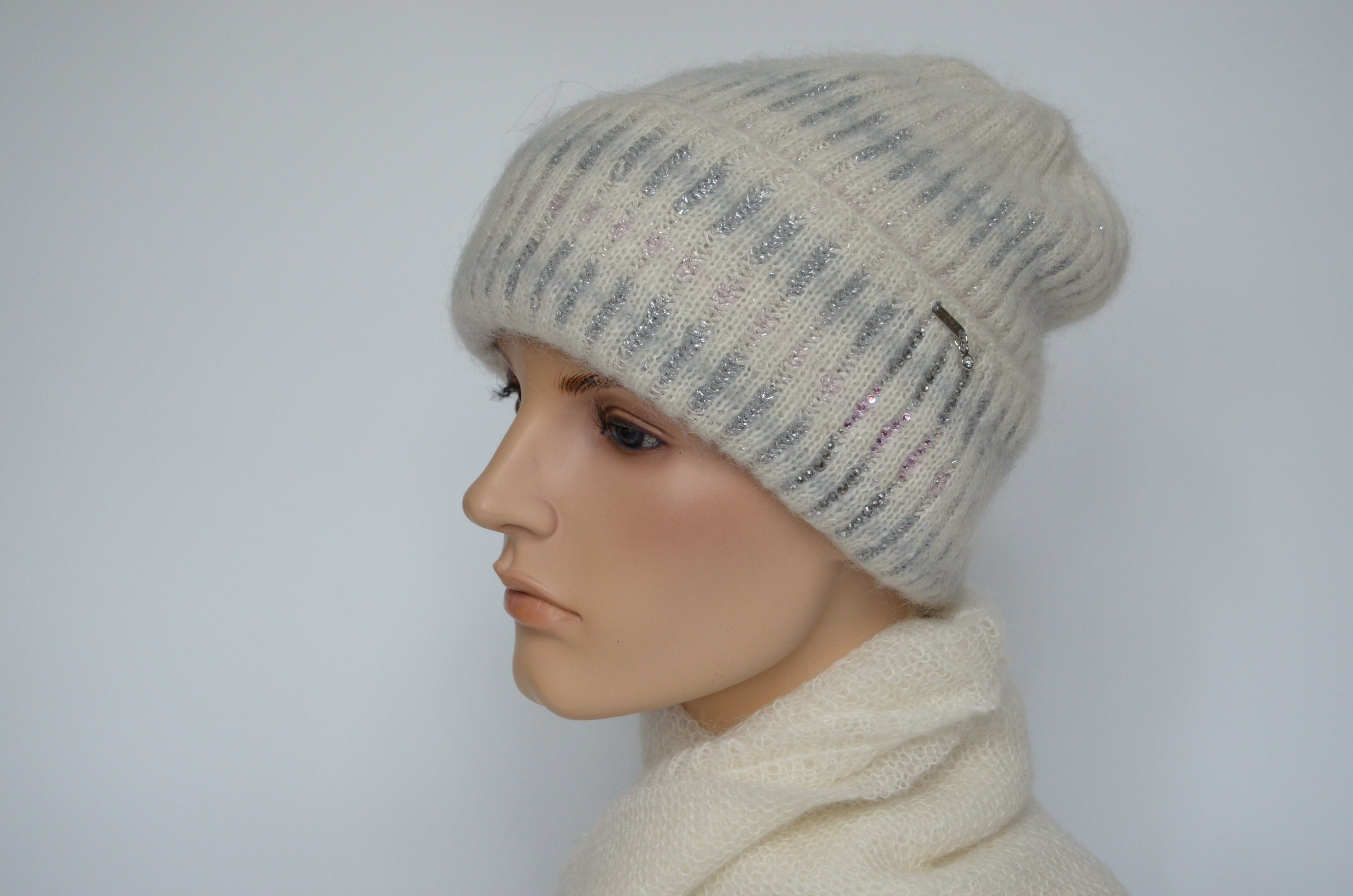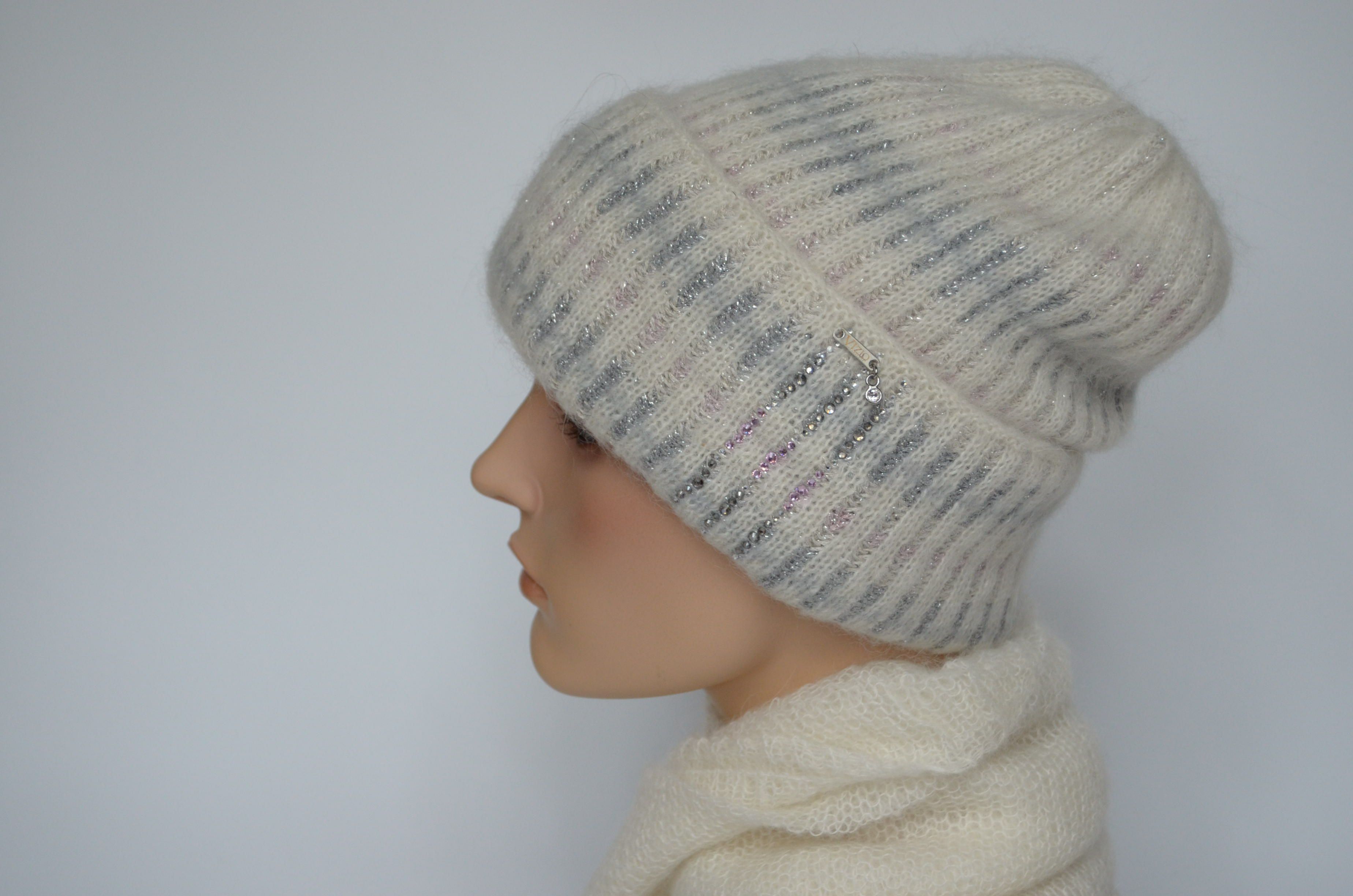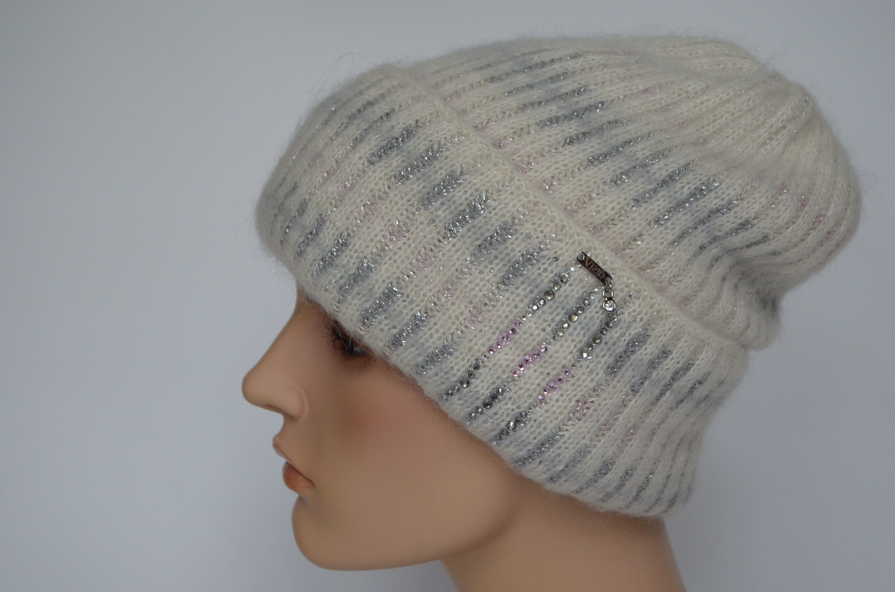 Итальянская белая вязаная шапка с отворотом и стразами Vizio Италия 8007 CRY зима 2022 - 2023 купить в Москве и России интернет магазин головных уборов Италии Визио