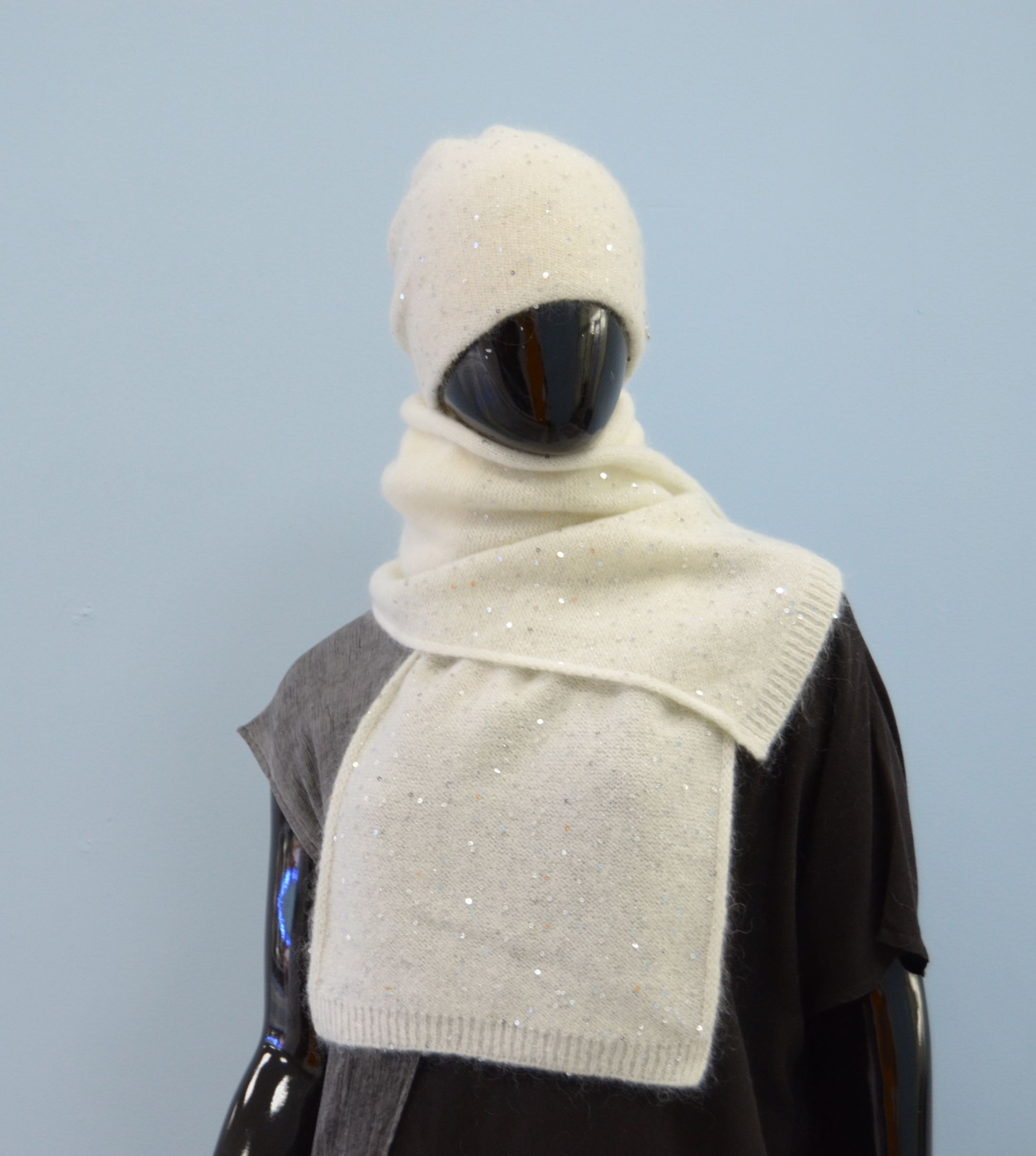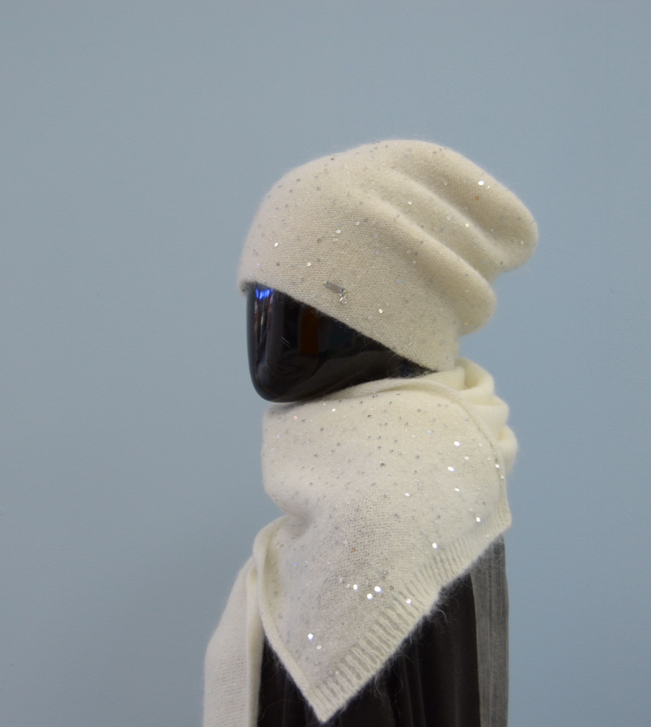 Состав шапки: мохер 35 %, полиамид 25 %, шерсть 32 %, пайетки, полиэстер 6 %, эластан 2 %