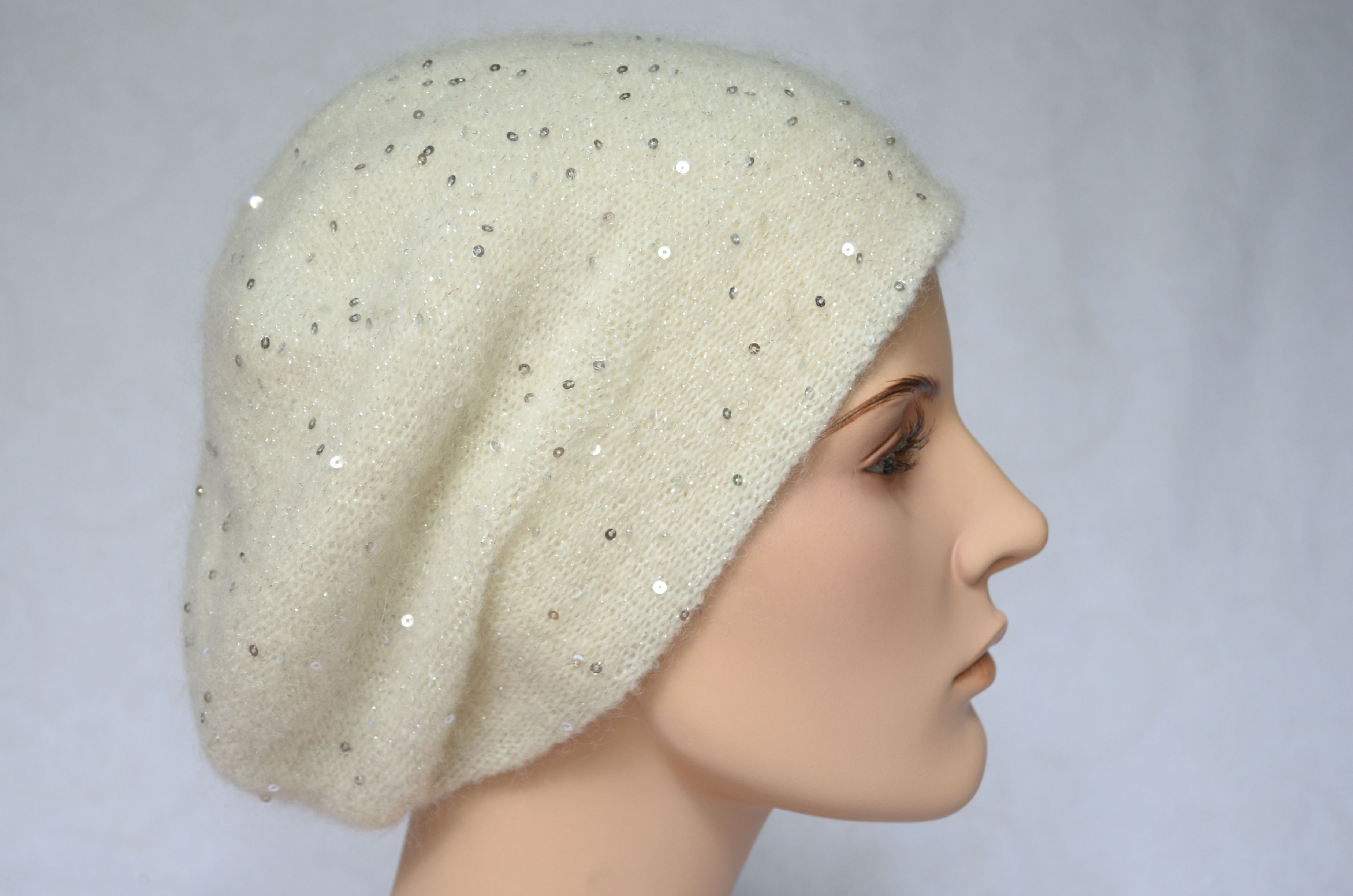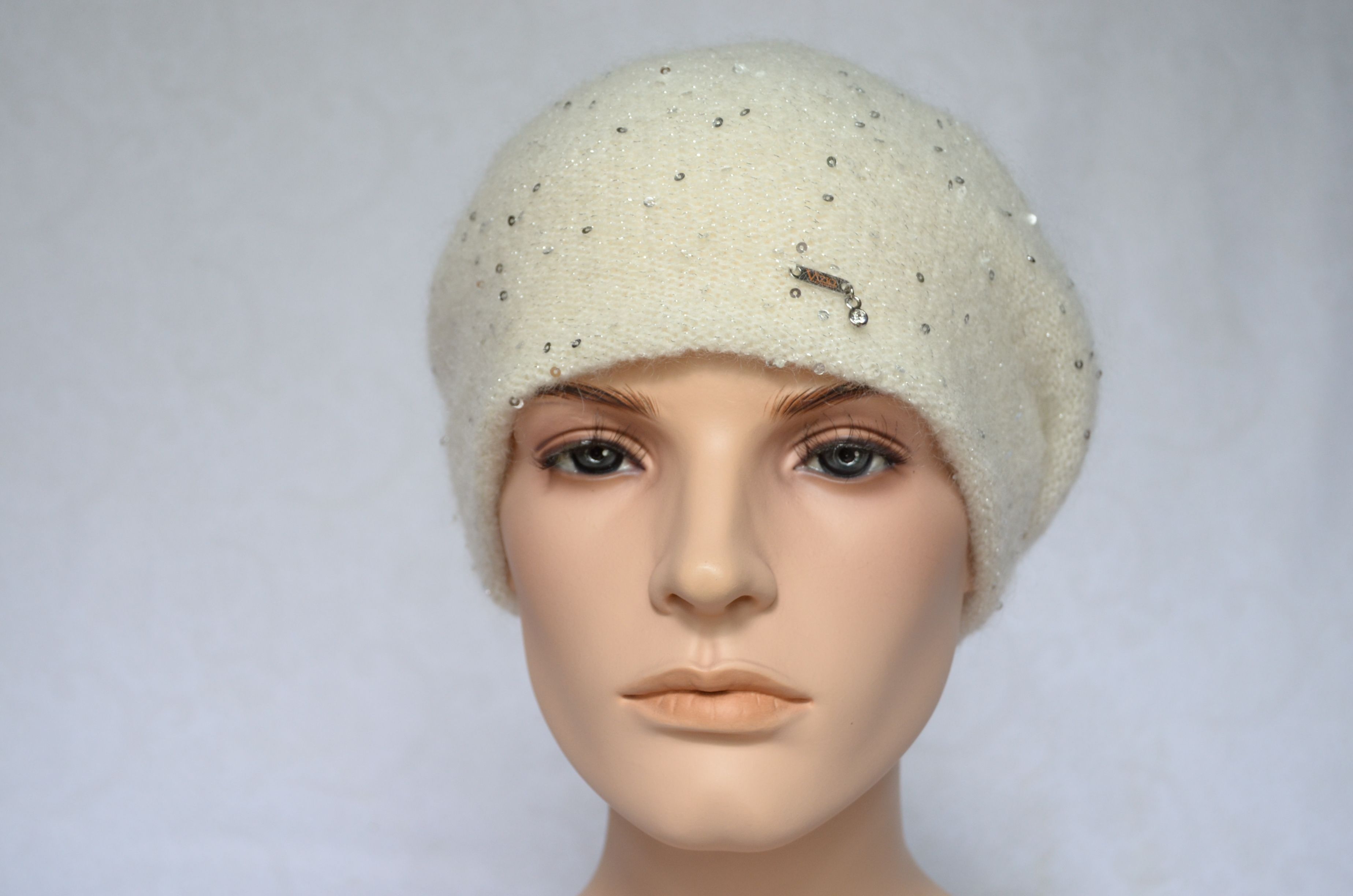 Белый женский берет с пайетками зимний с вязаным подкладом