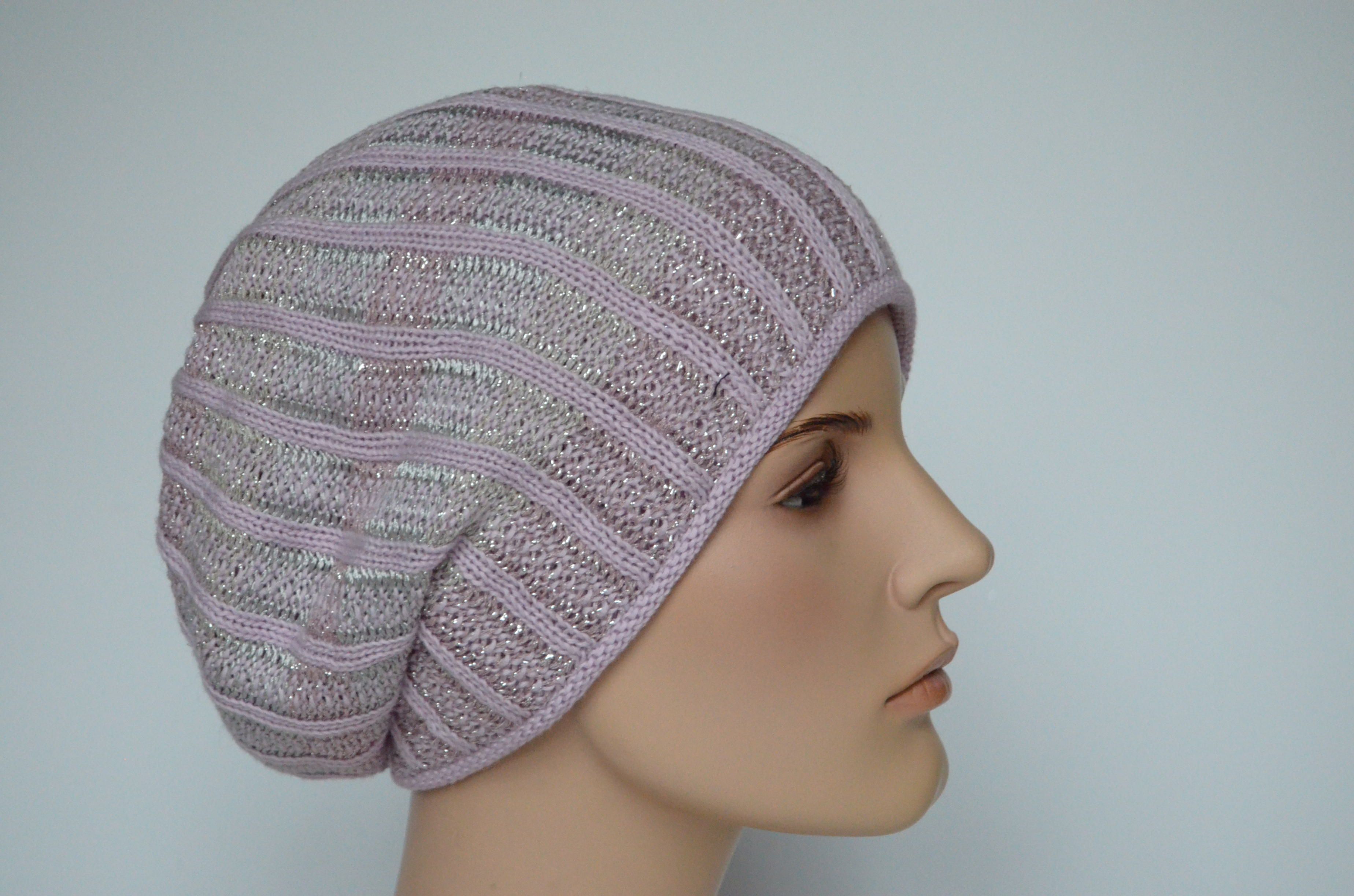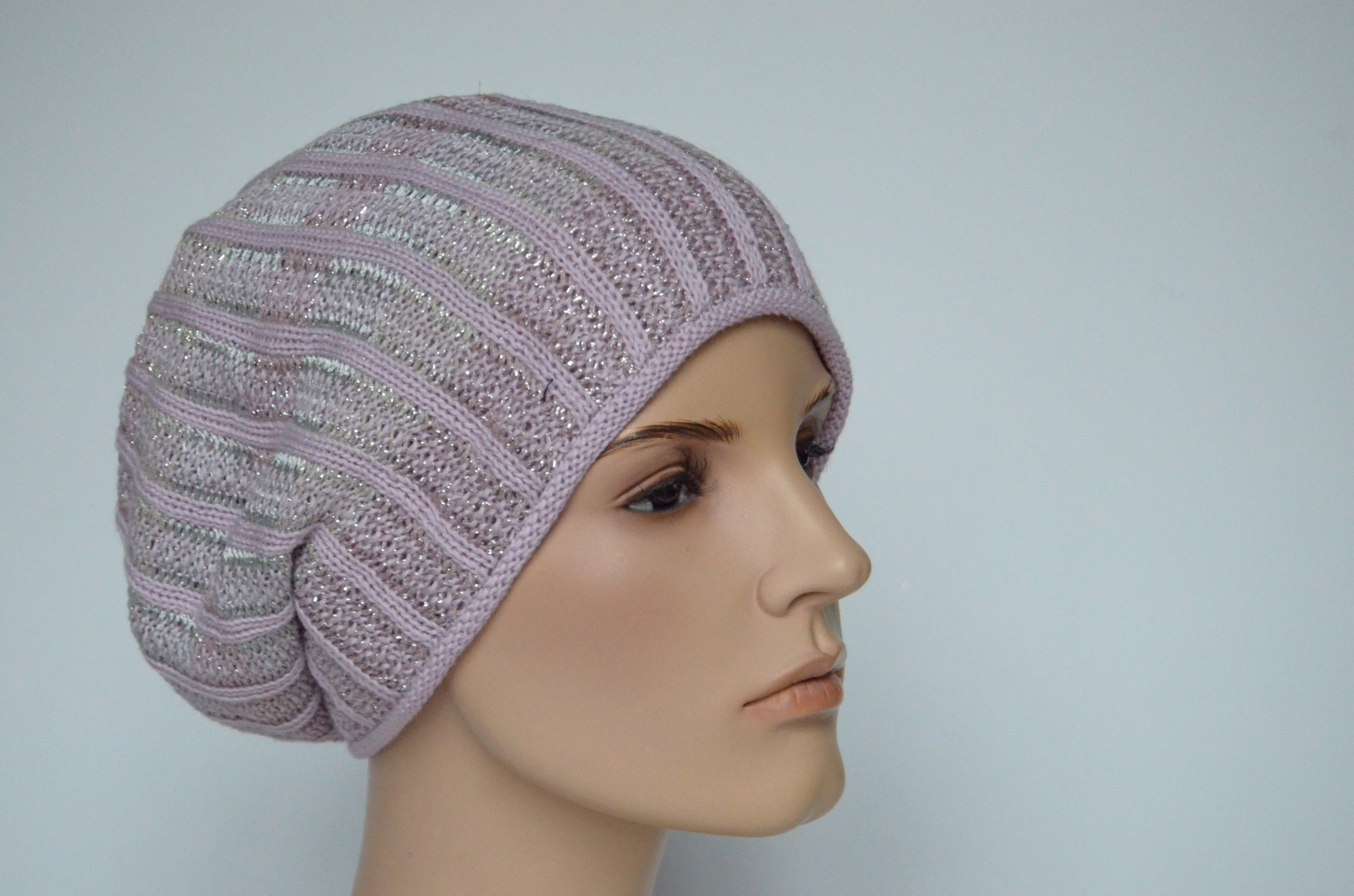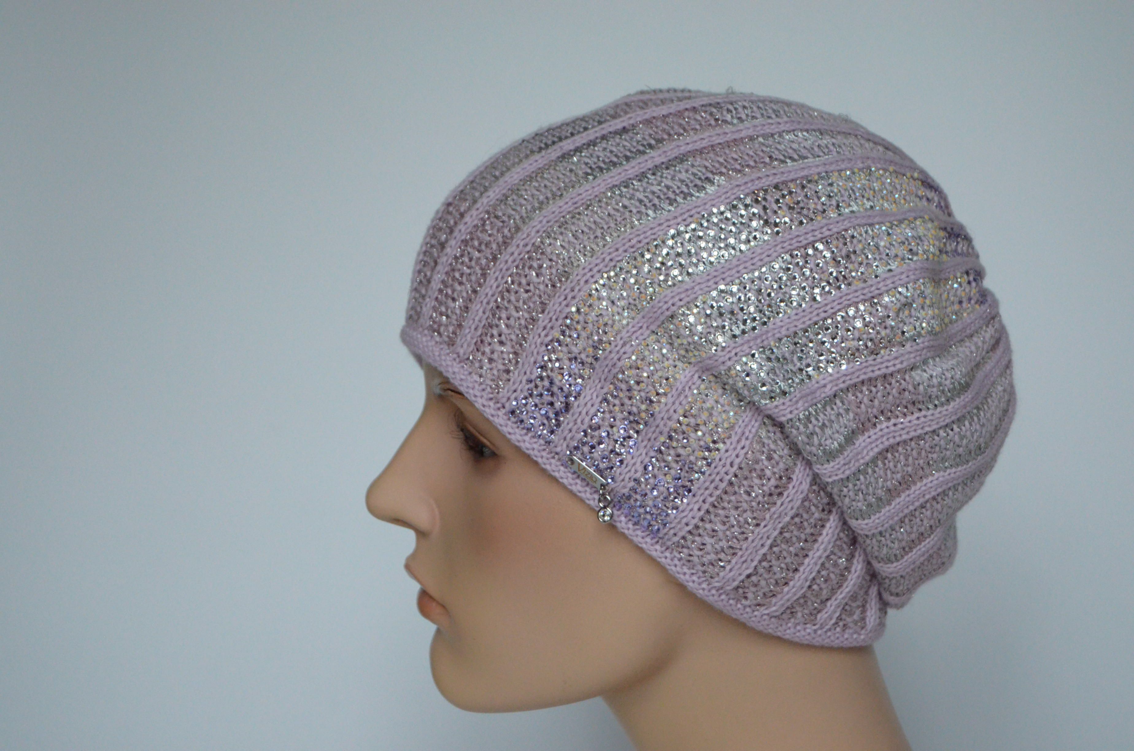Демисезонный берет для женщин вязаный из хлопка с тремя полосками украшений из страз Италия Vizio 7046 В лилового цвета из коллекции итальянских беретов весна - осень Вицио