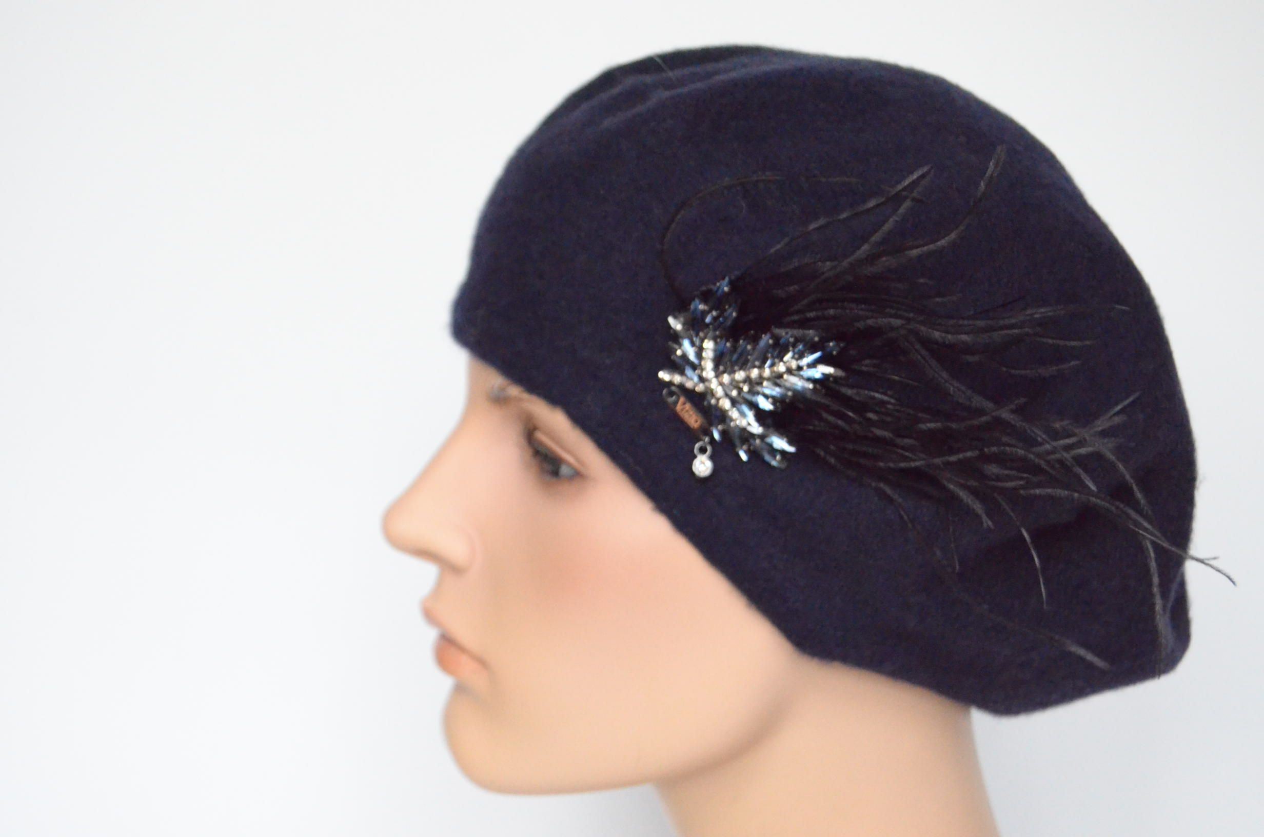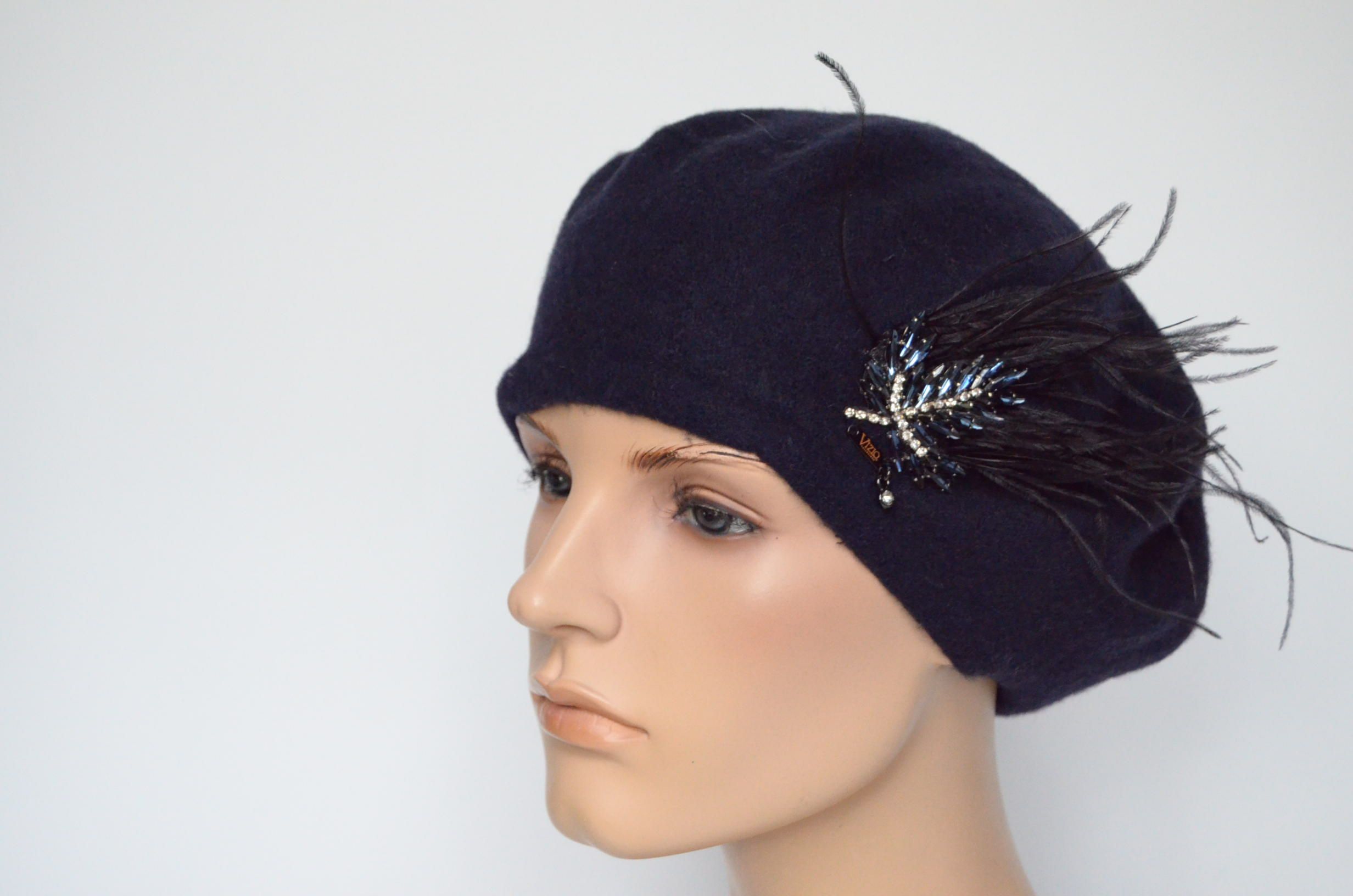 Женский темносиний ( черно - синий) фетровый берет с перьями Vizio Италия 1011 BL коллекция головных уборов с перьями Vizio Collezione 2023 - 2024
