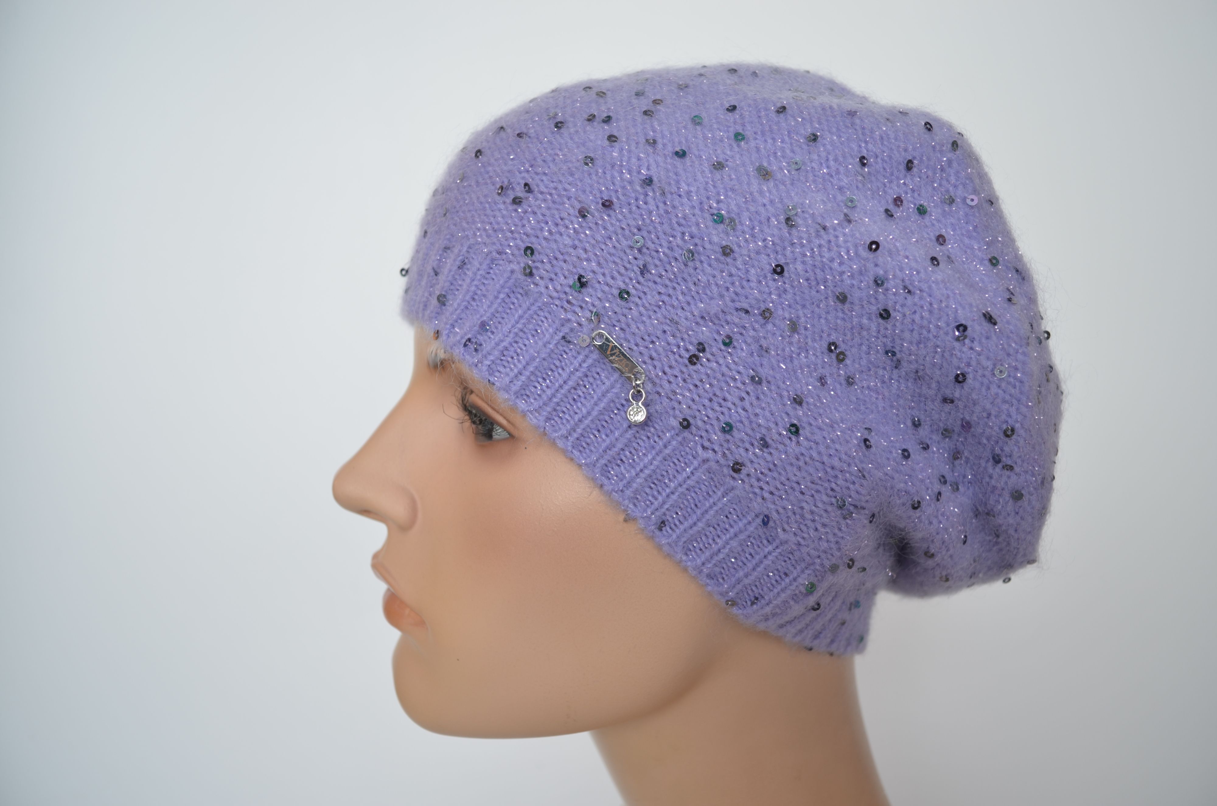 Фиолетовый одинарный женский берет вязаный с пайетками