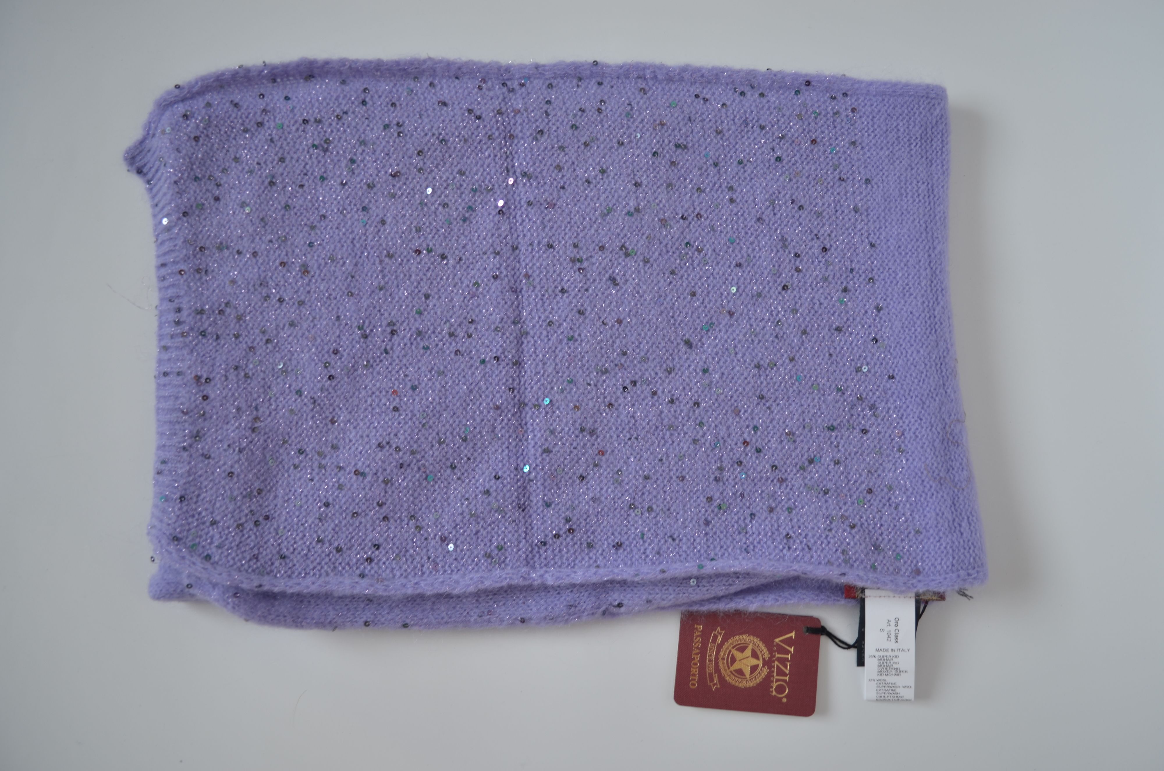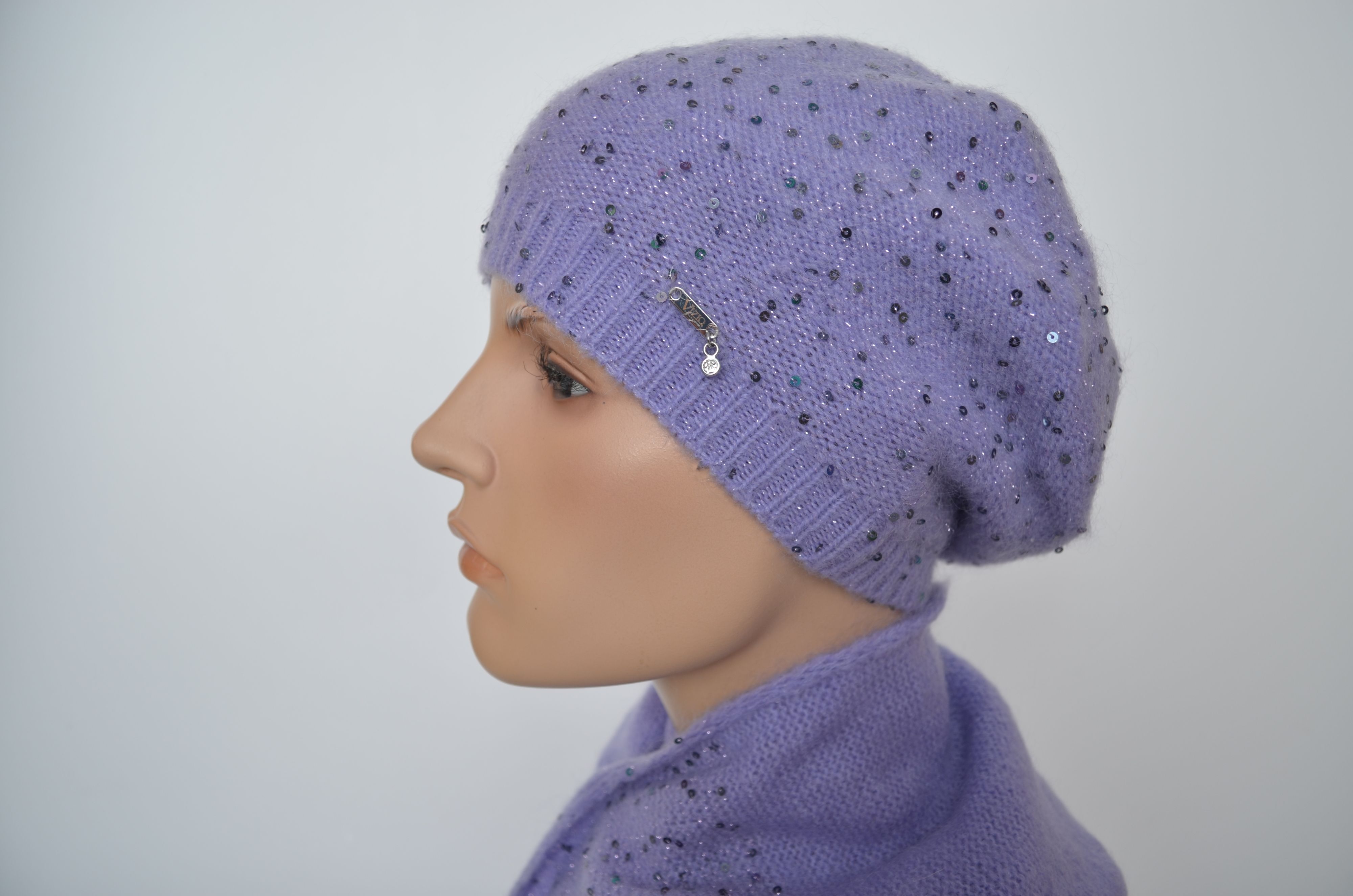 Состав берета и шарфа: мохер 35 %, полиамид 25 %, шерсть 32 %, пайетки, полиэстер 6 %, эластан 2 %