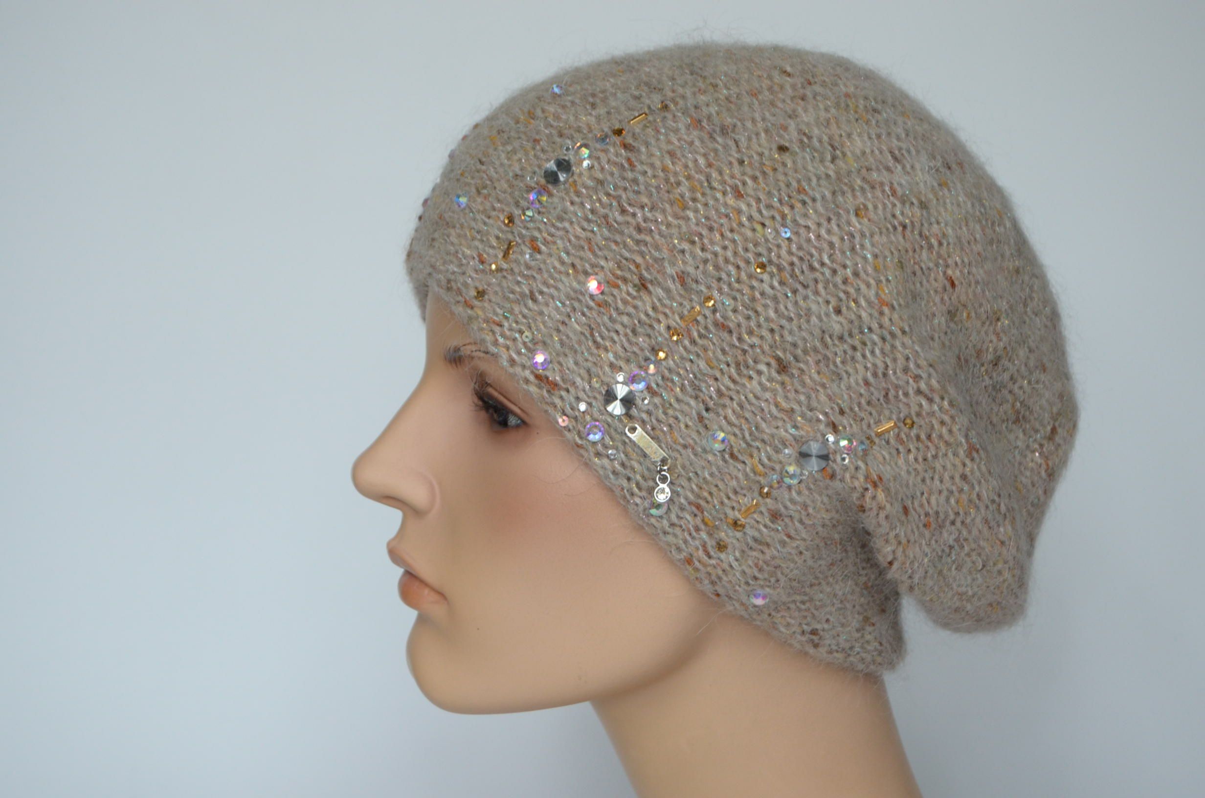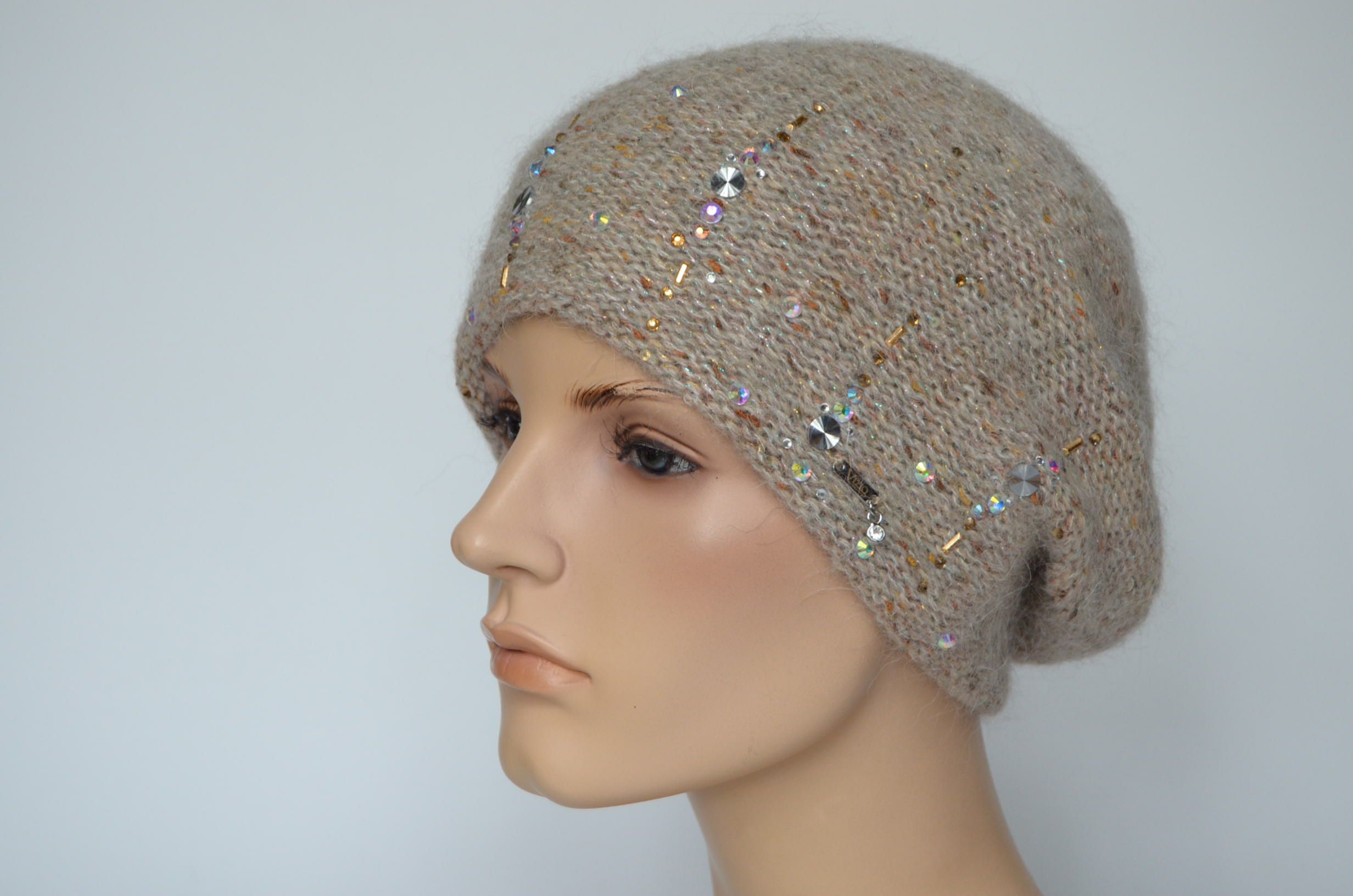 Меланжевый вязаный берет с украшениями Vizio Италия 1010 ( предыдущая модель 6926 и 8023) бежевый берет из новой коллекции итальянских беретов и шапок Визио зима 2023 - 2024 в магазине женских головных уборов Италии Vizio Collezione с доставкой по Москве и России