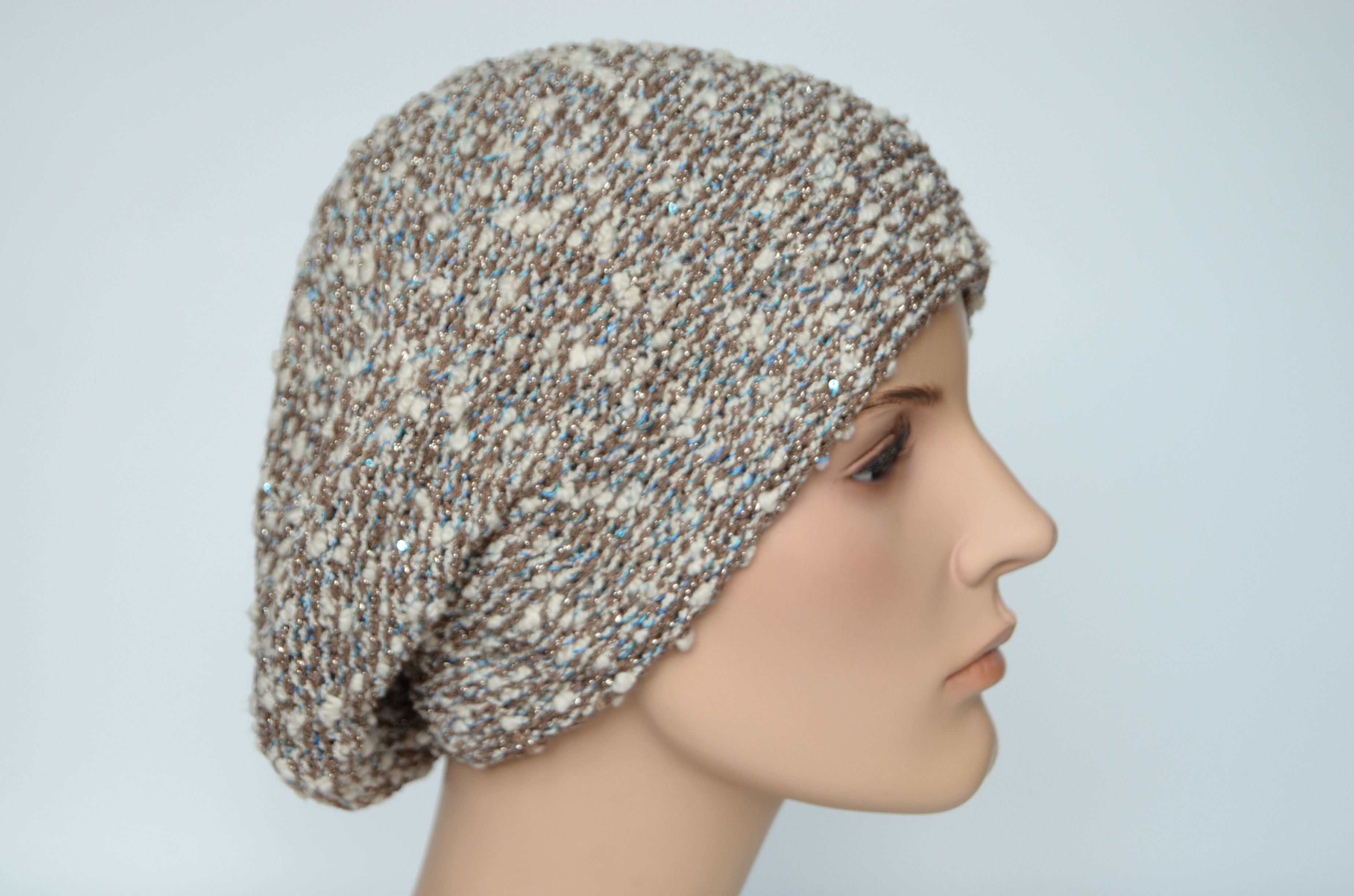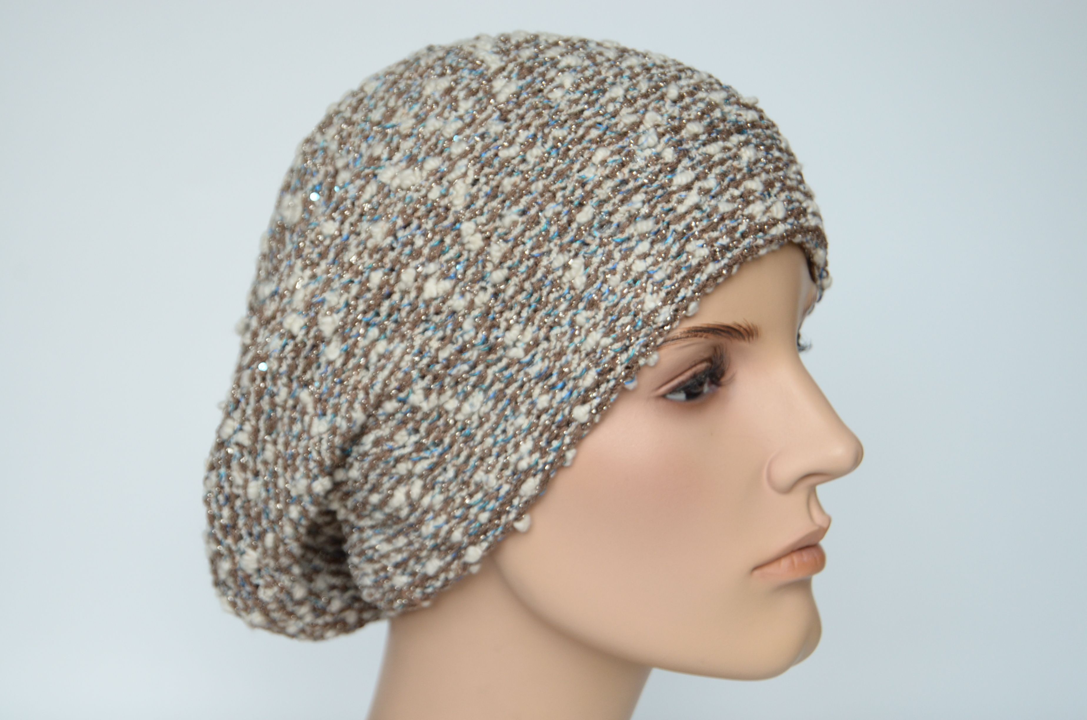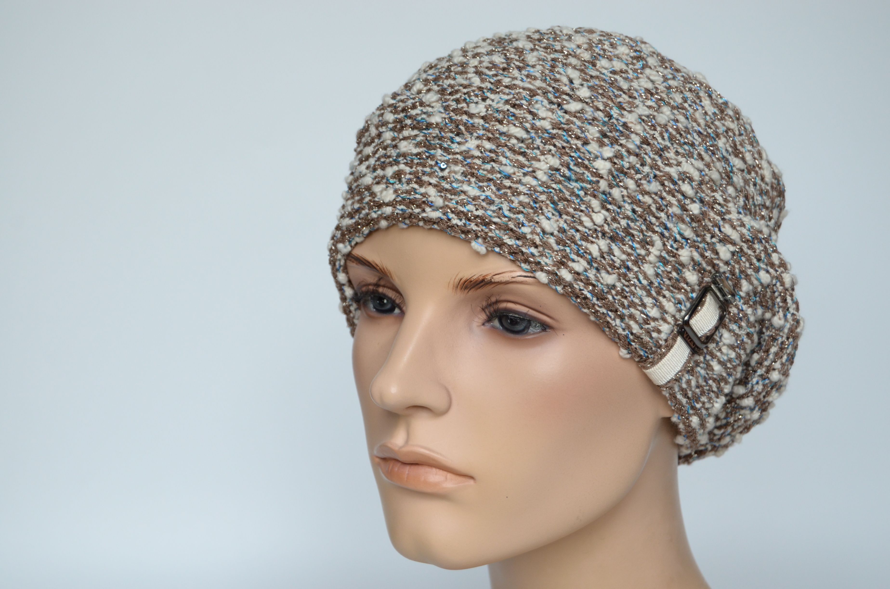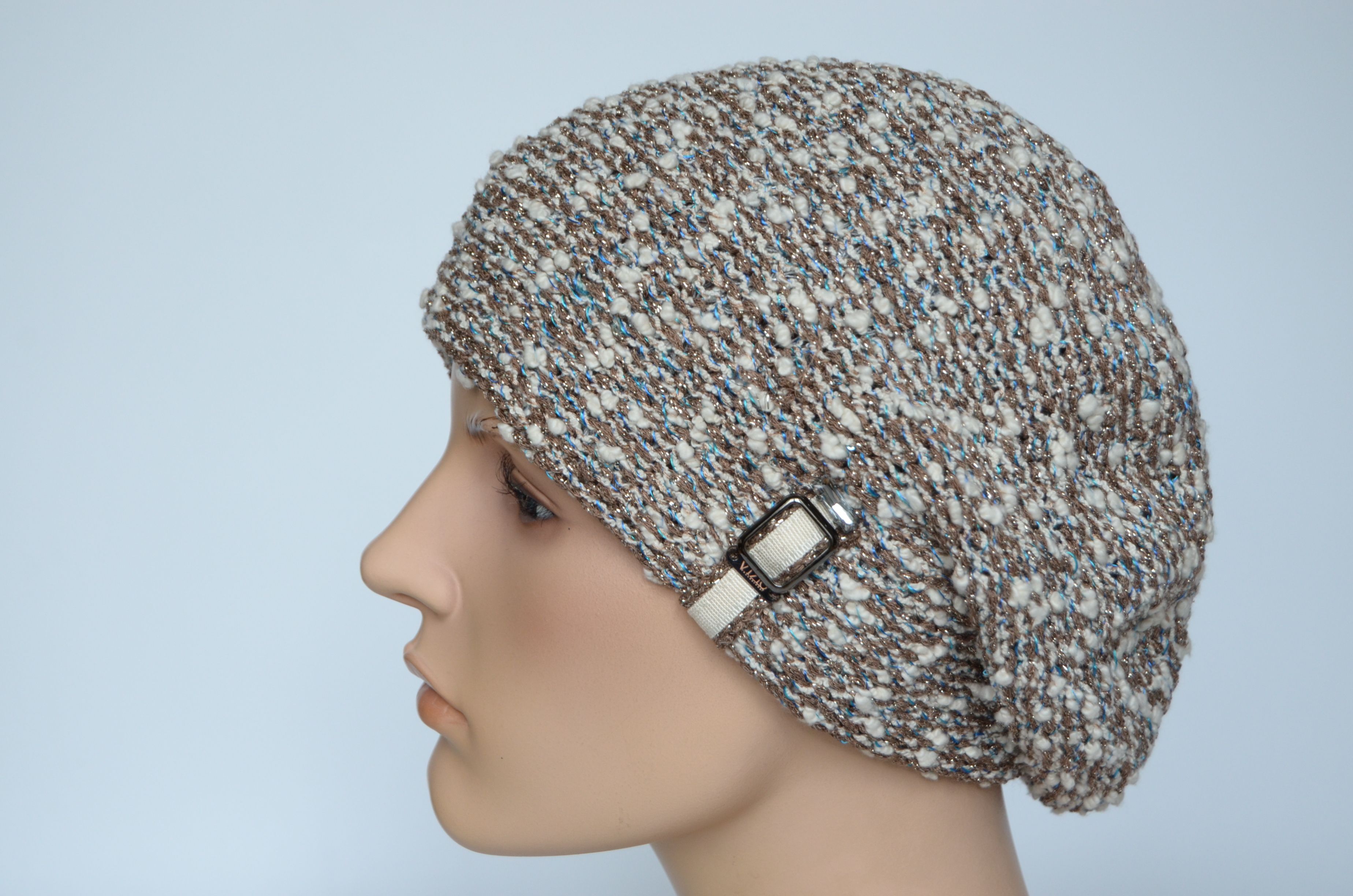Меланжевый берет двойной вязки женский белый с ореховыми и голубыми нитями Vizio Италия 1222 купить в интернет магазине итальянских головных уборов и одежды для женщин