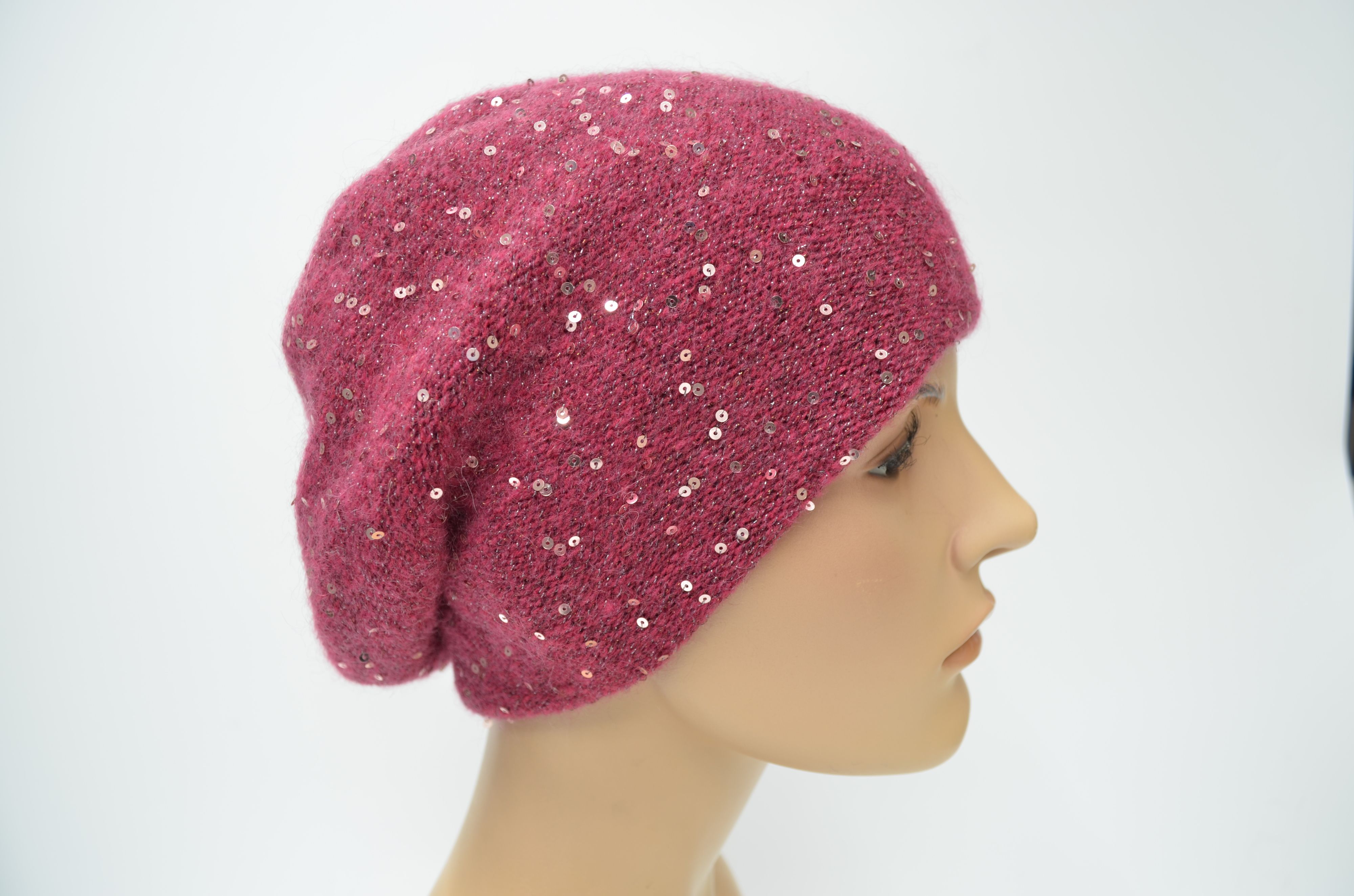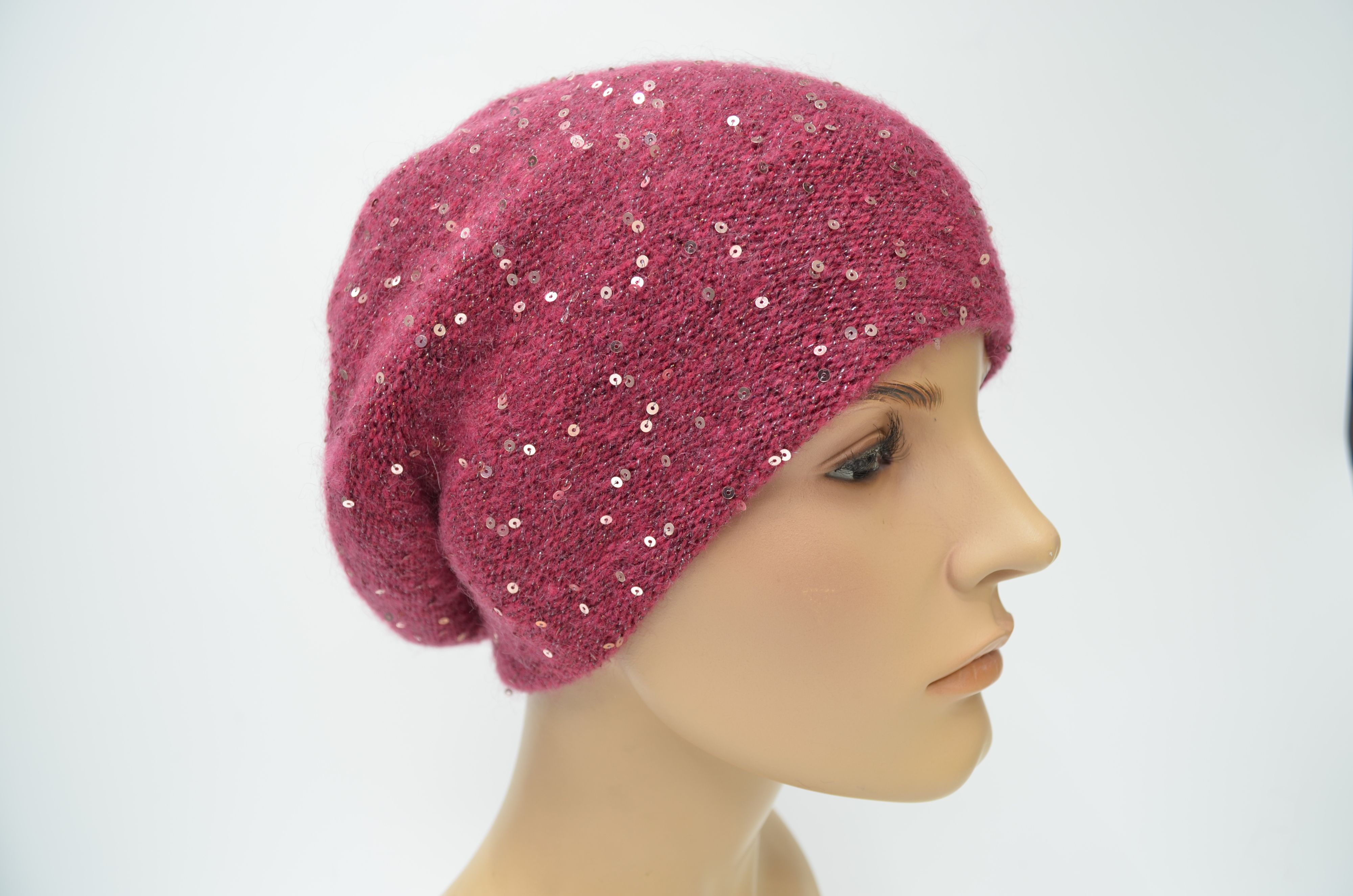 Женский зимний берет с пайетками вязаный из мохера с вязаным подкладом 2025 - 2026 цвета фуксия