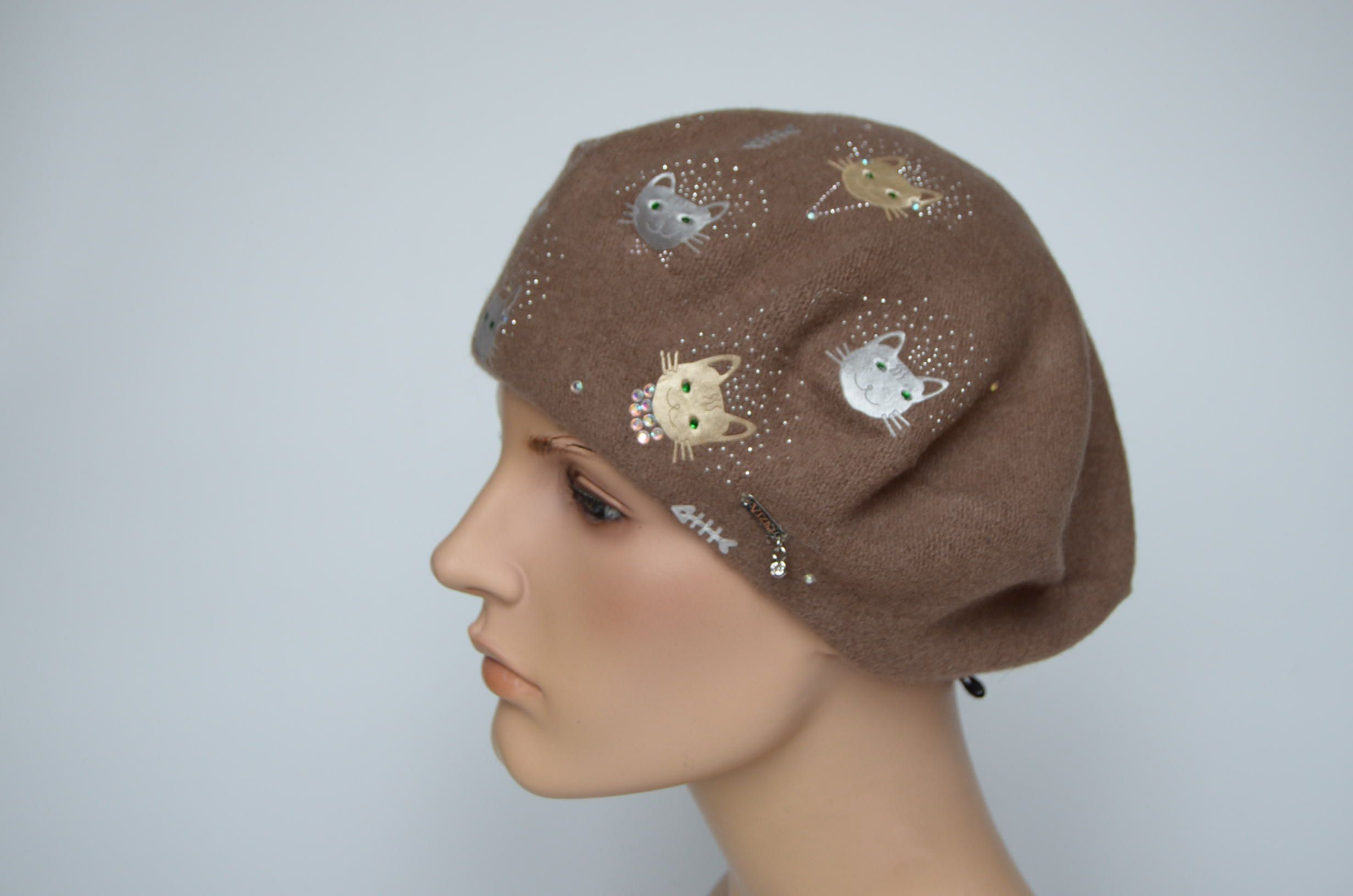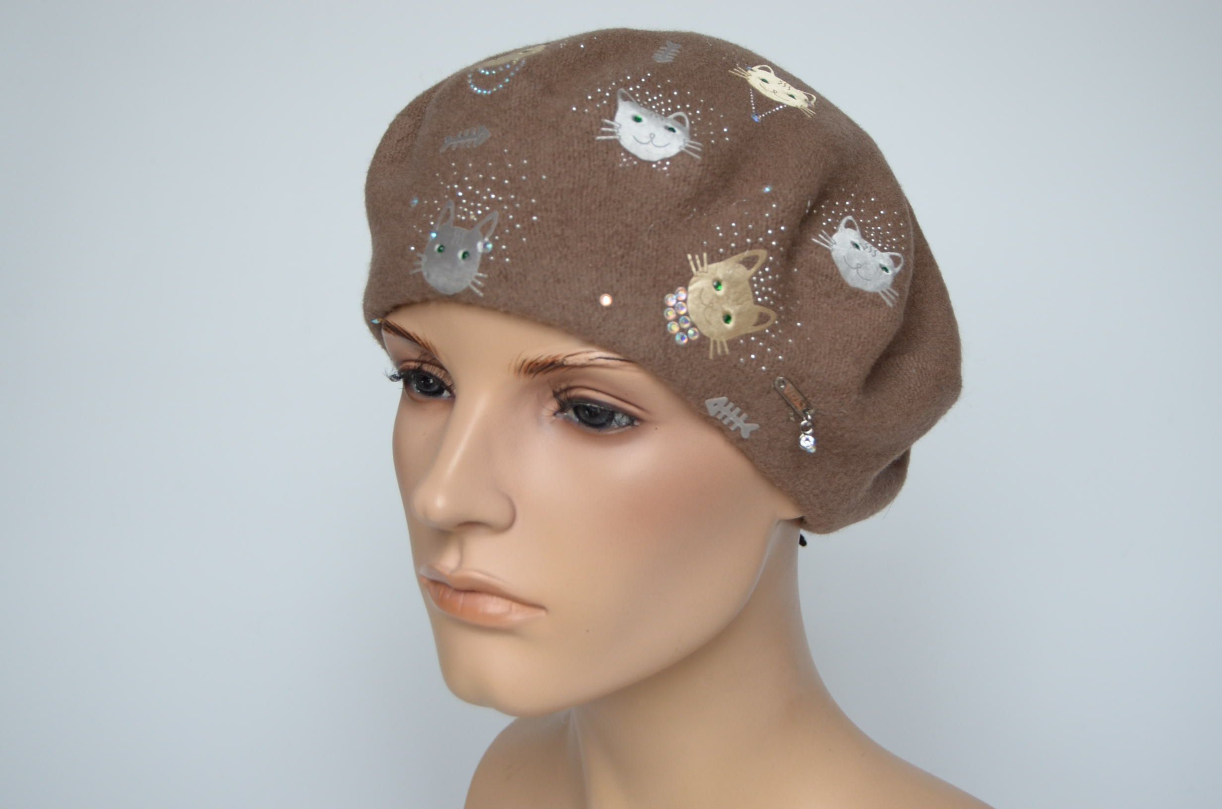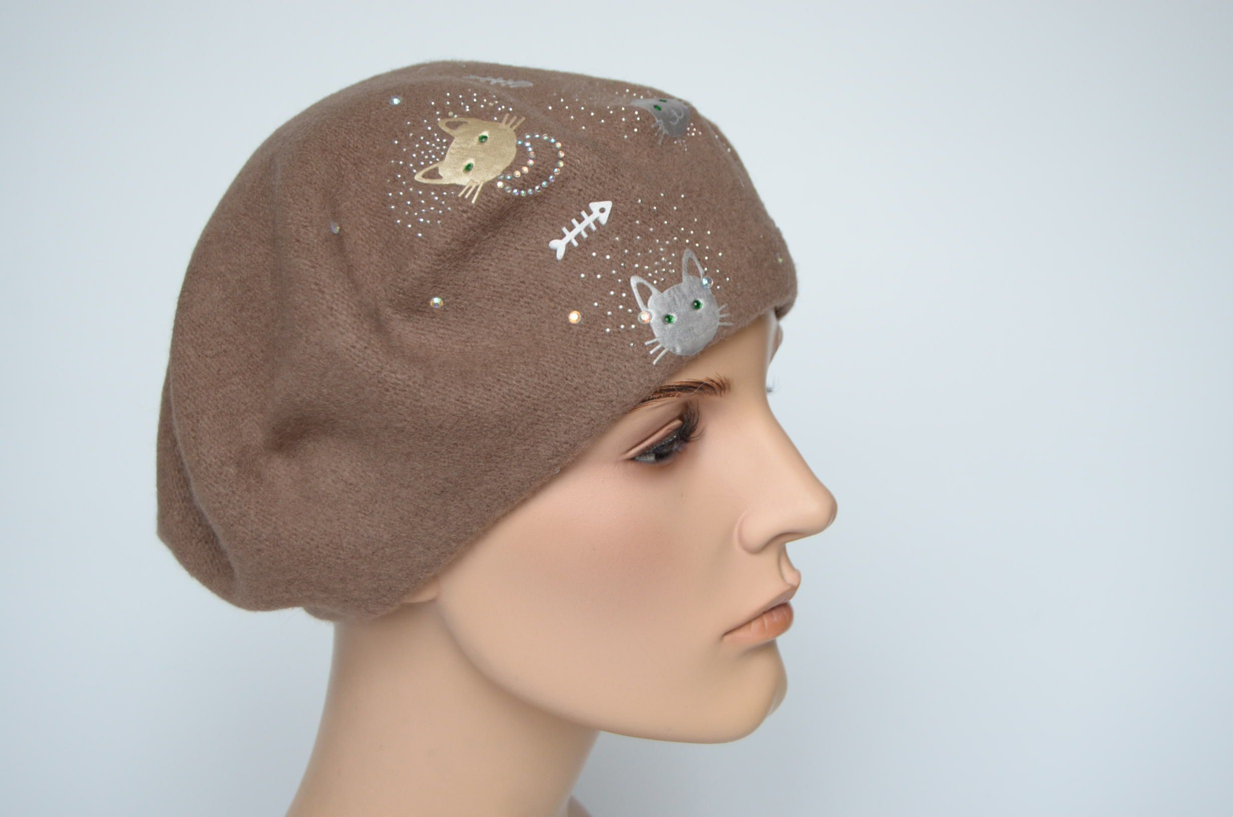 Коричневый берет фетровый с кошками для женщин