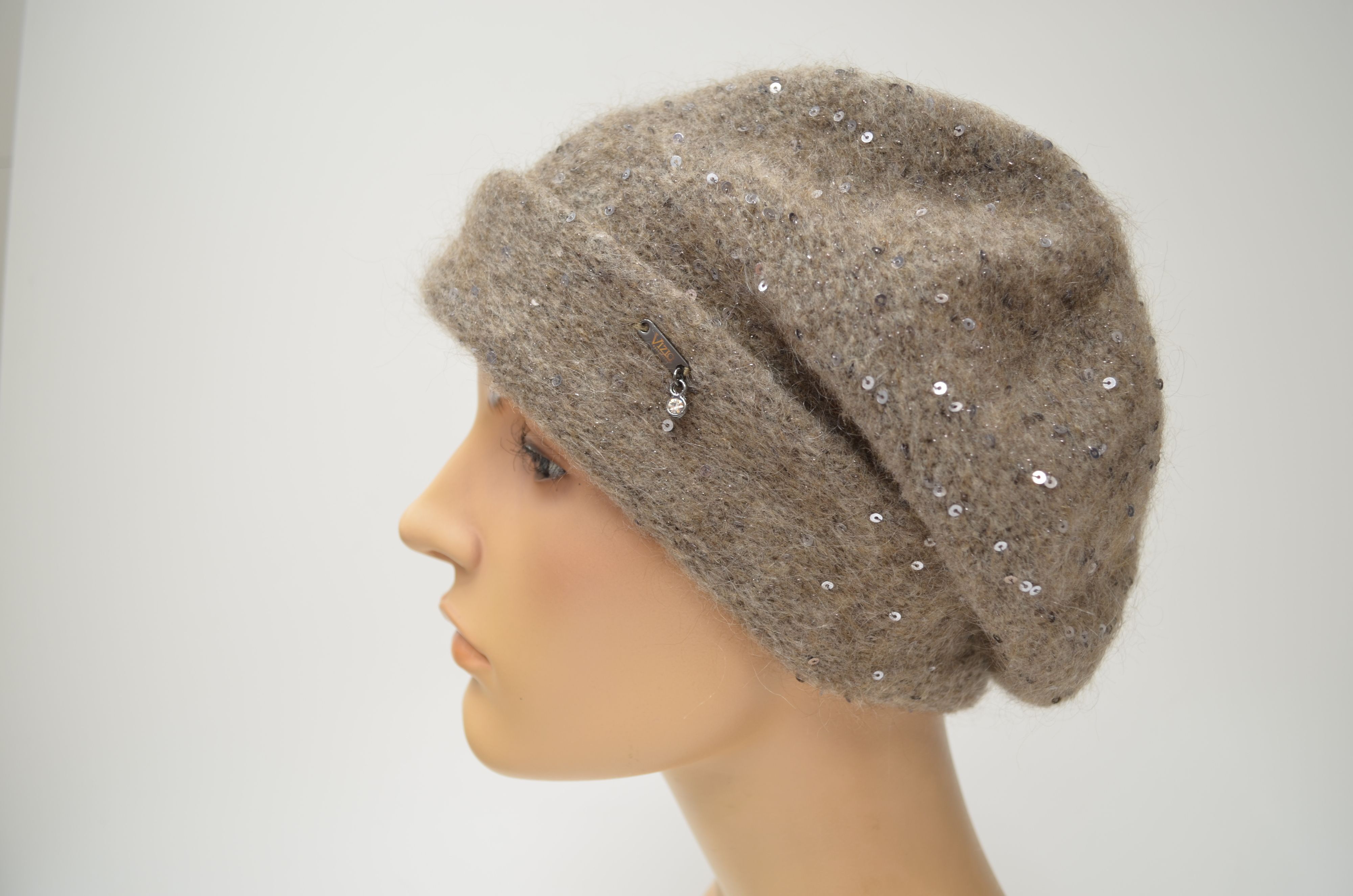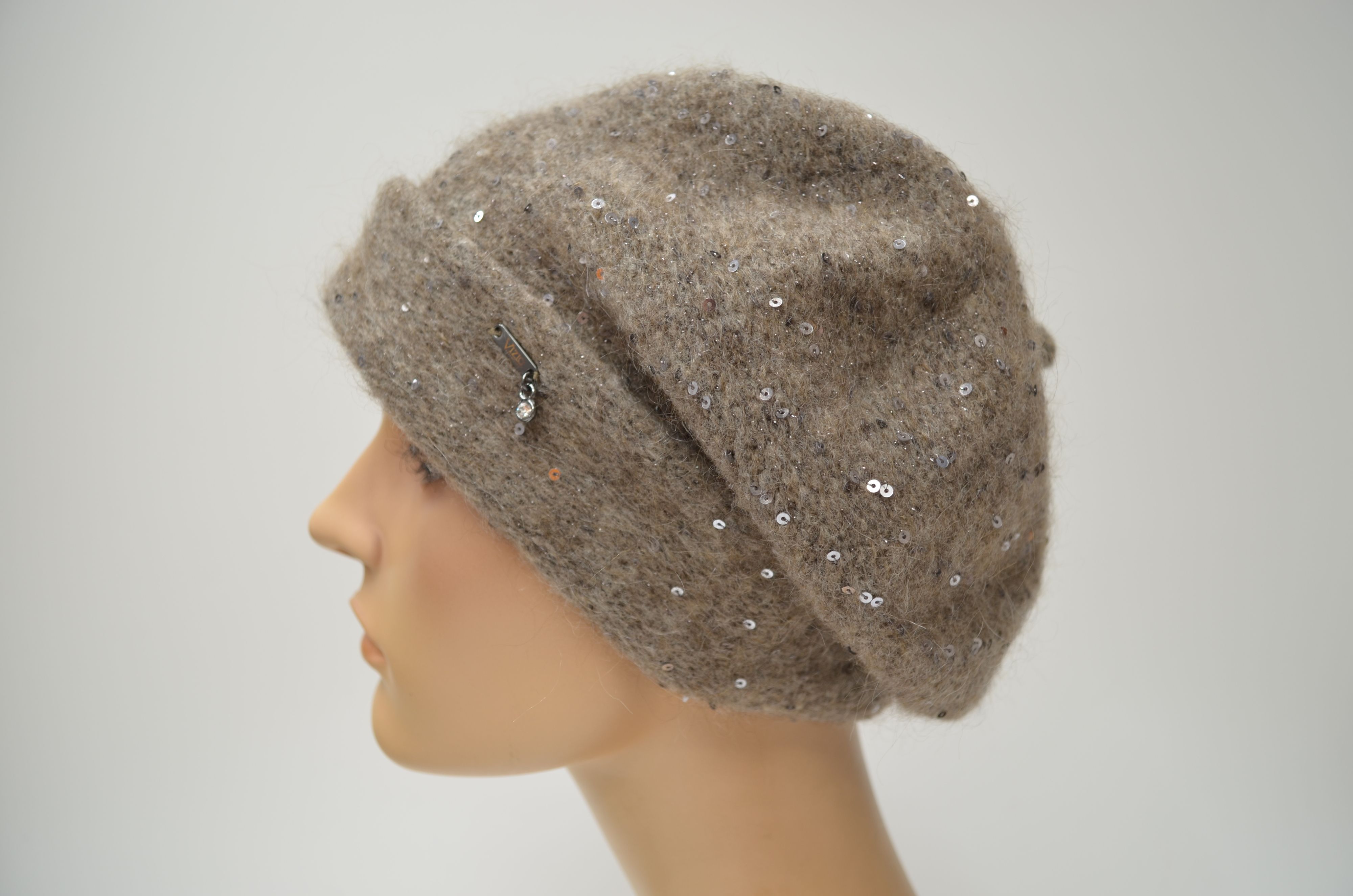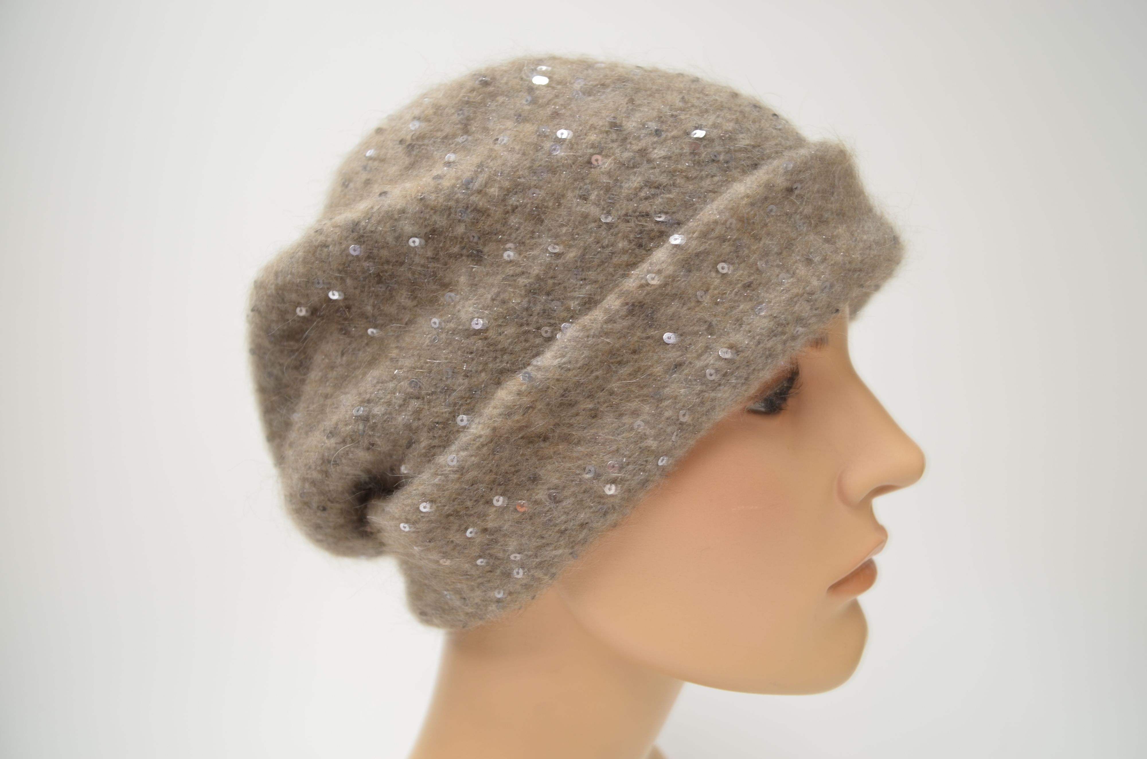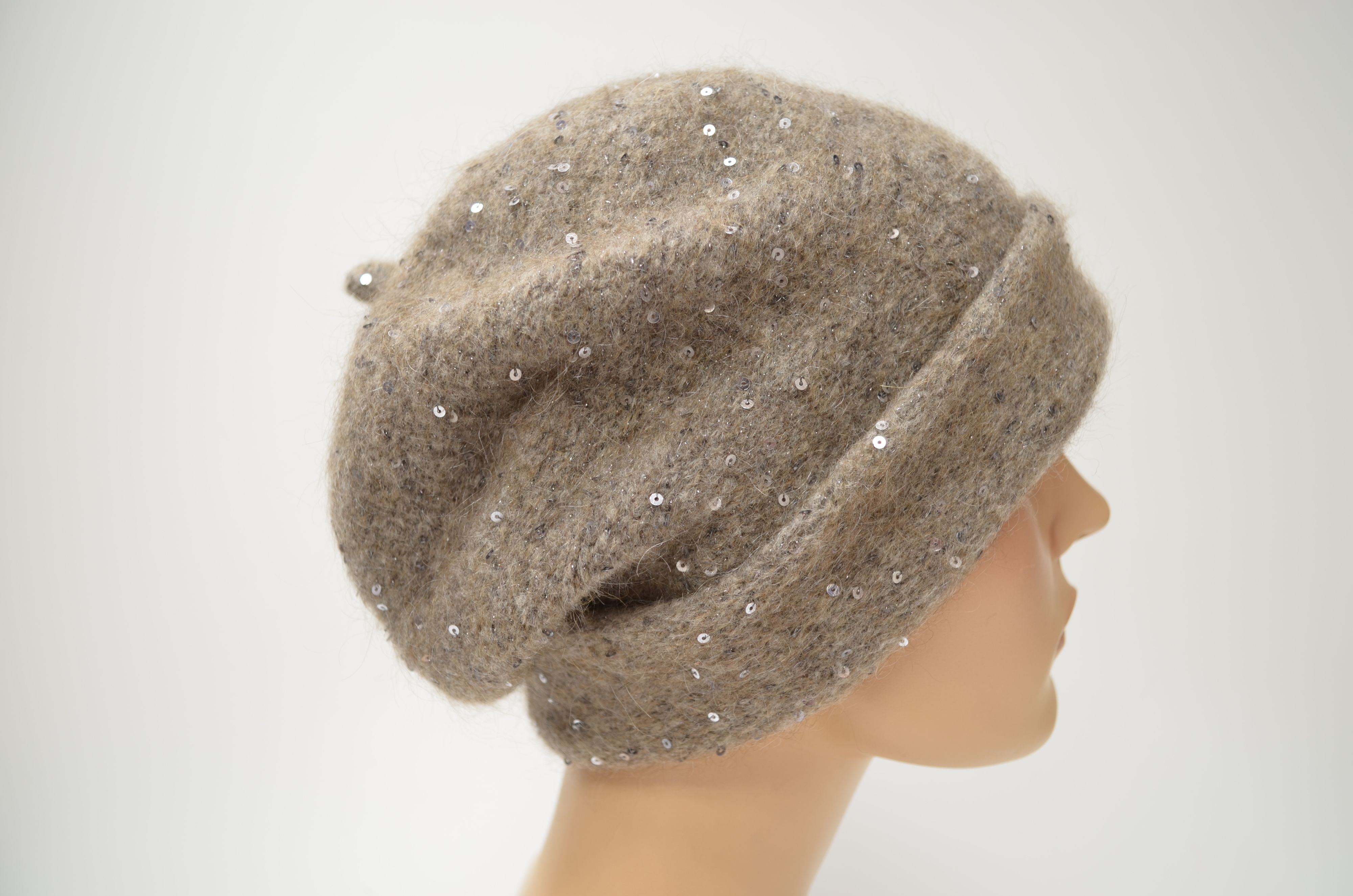 Одинарный женский зимний берет с отворотом вязаный из мохера и мериноса с пайетками осень зима 2025 2026
