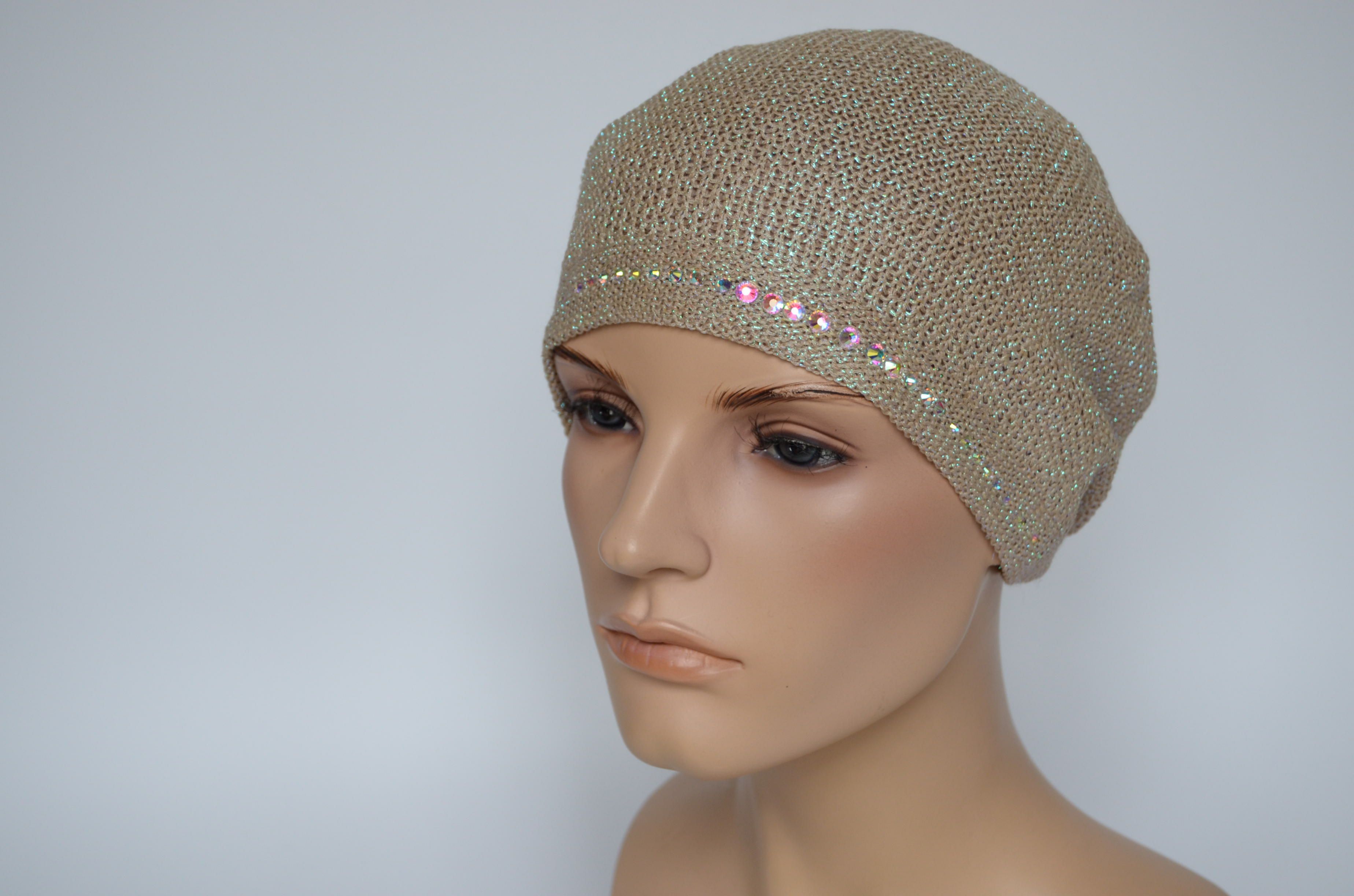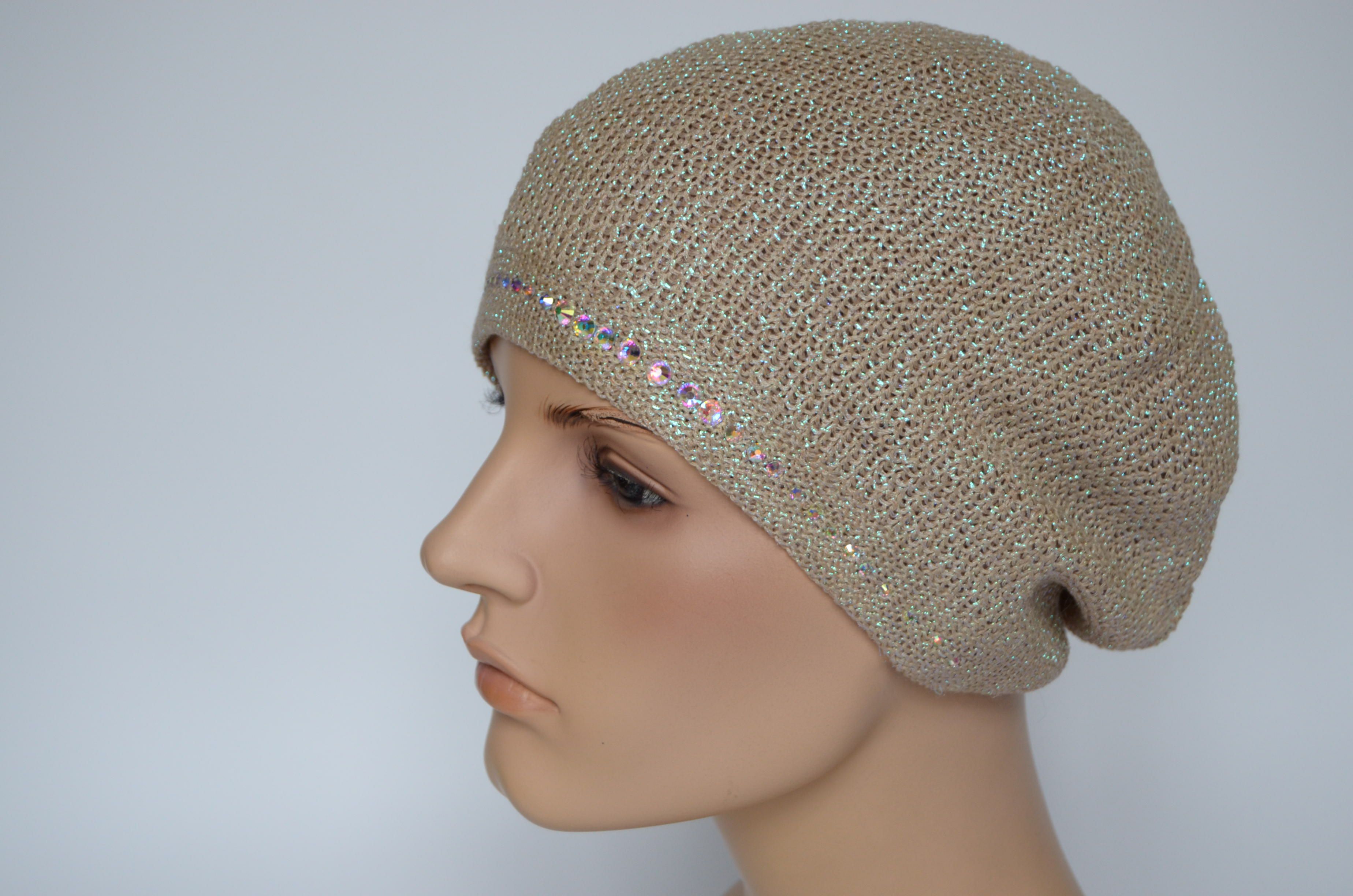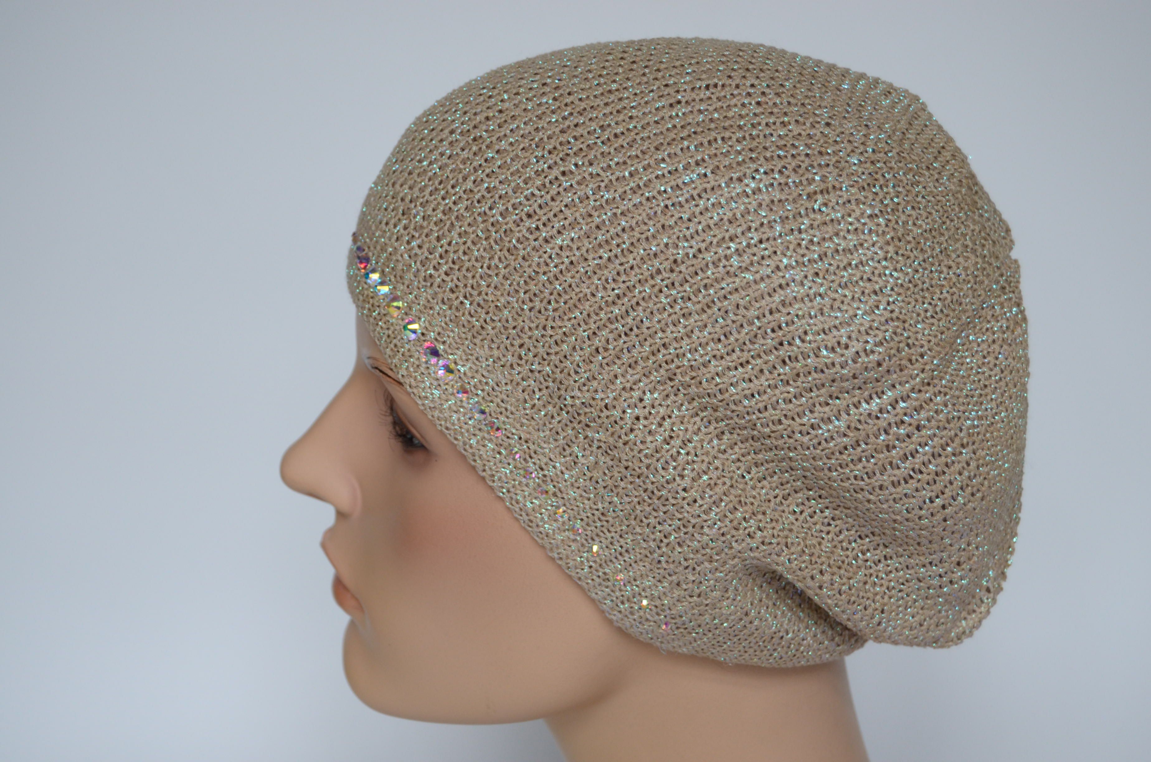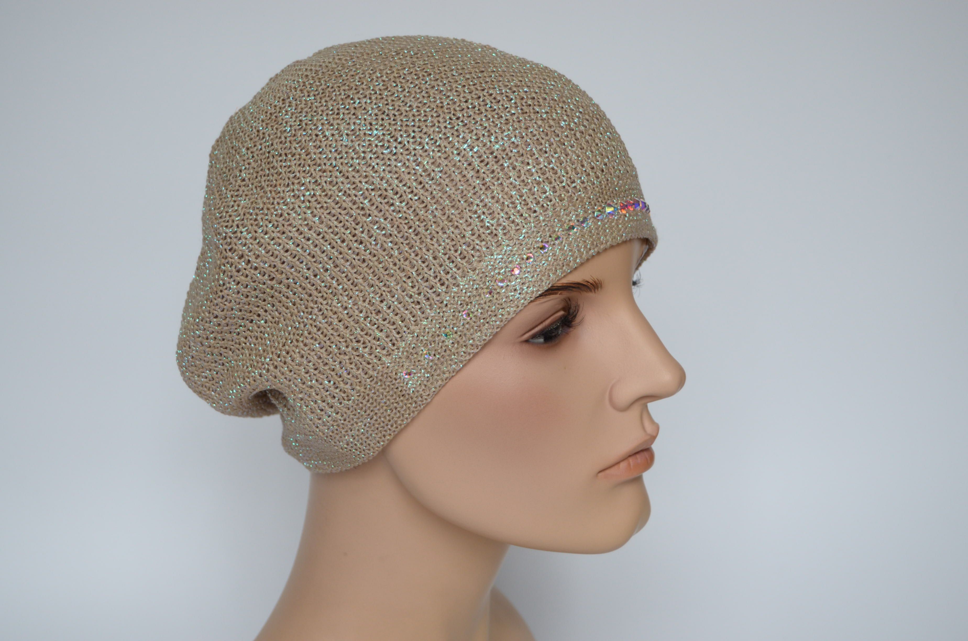 Модный берет женский вязаный со стразами весна - осень - лето Италия Vizio 7047 В бежево - золотистого цвета из коллекции итальянских беретов Вицио