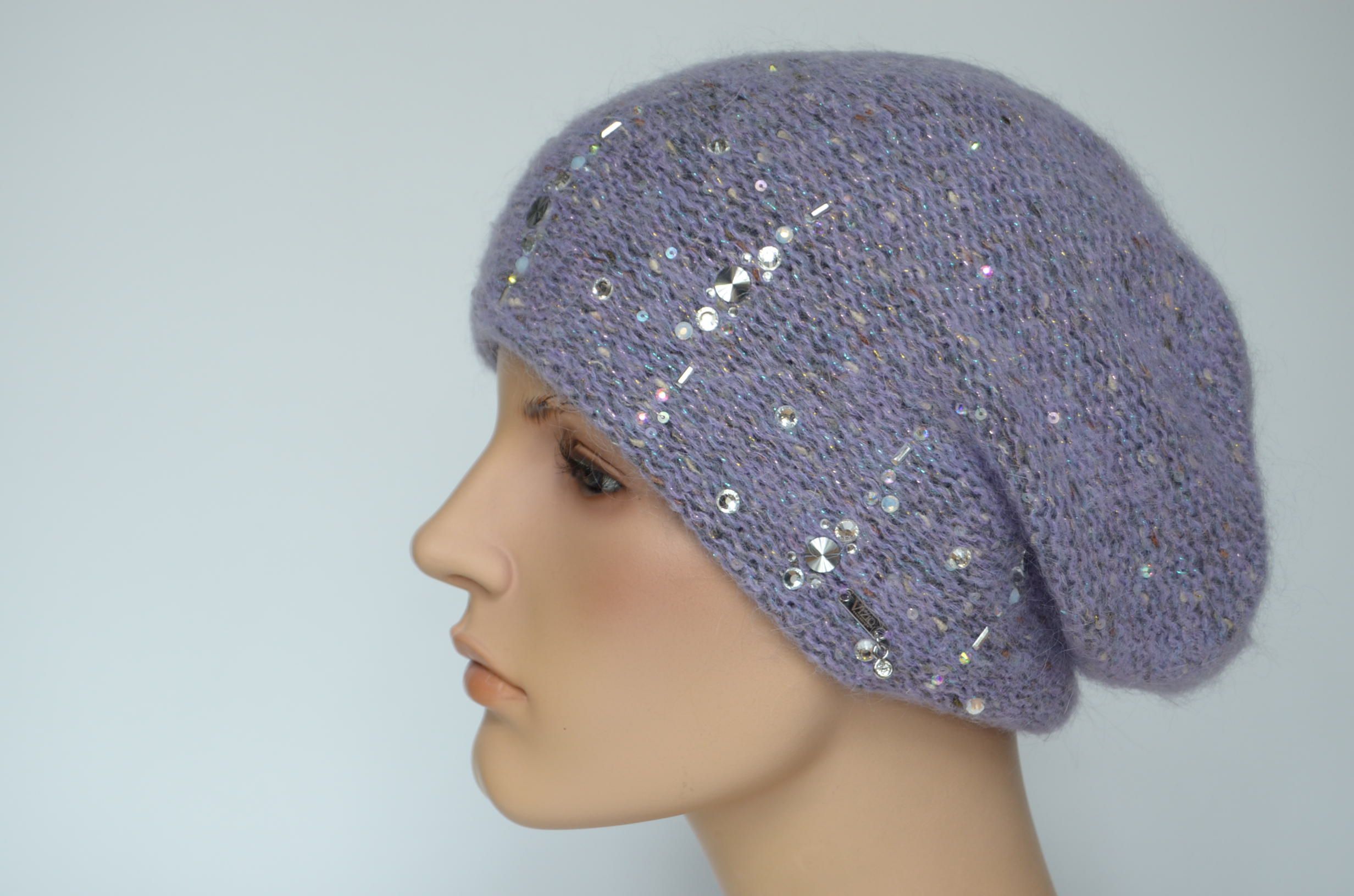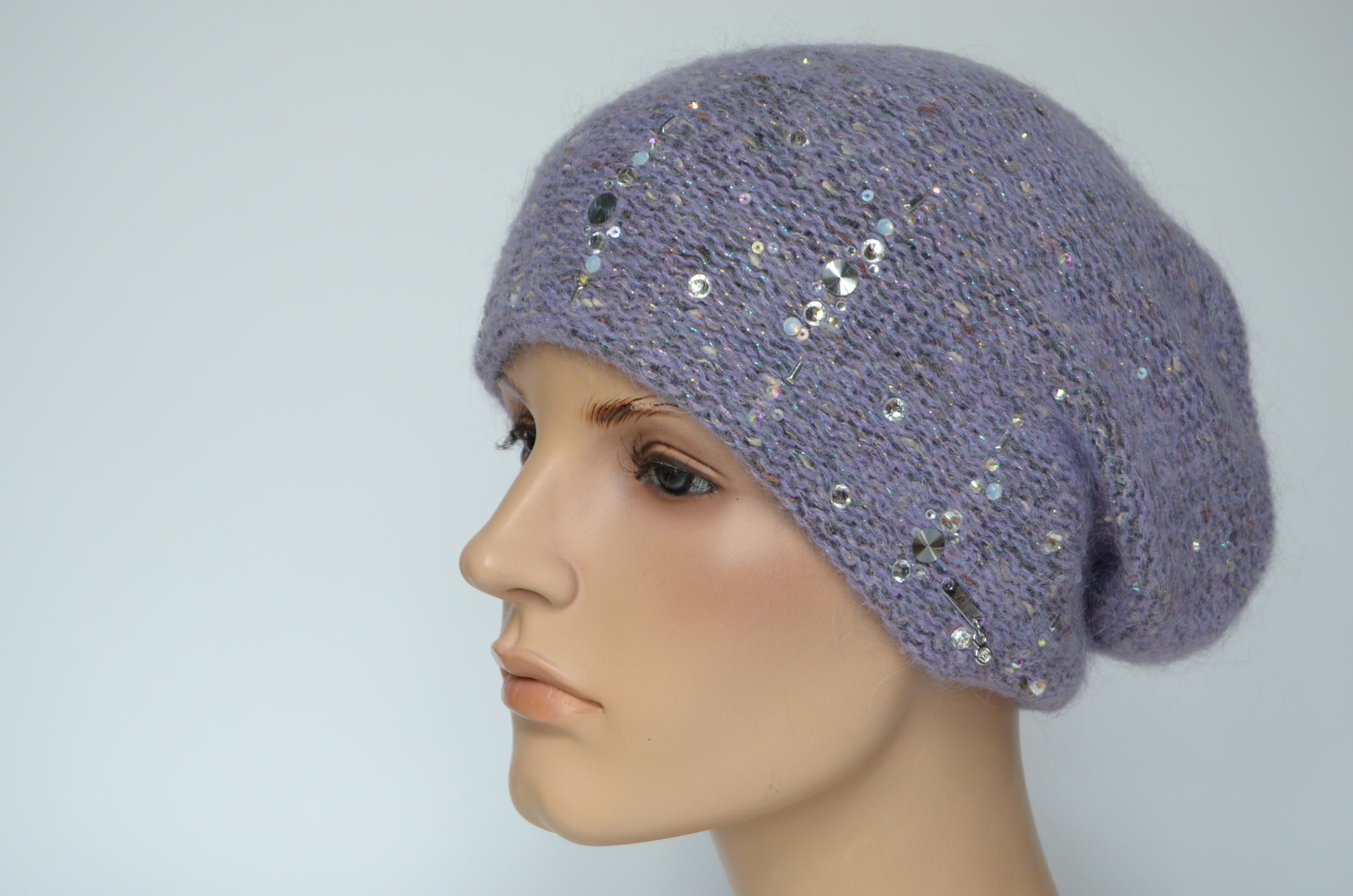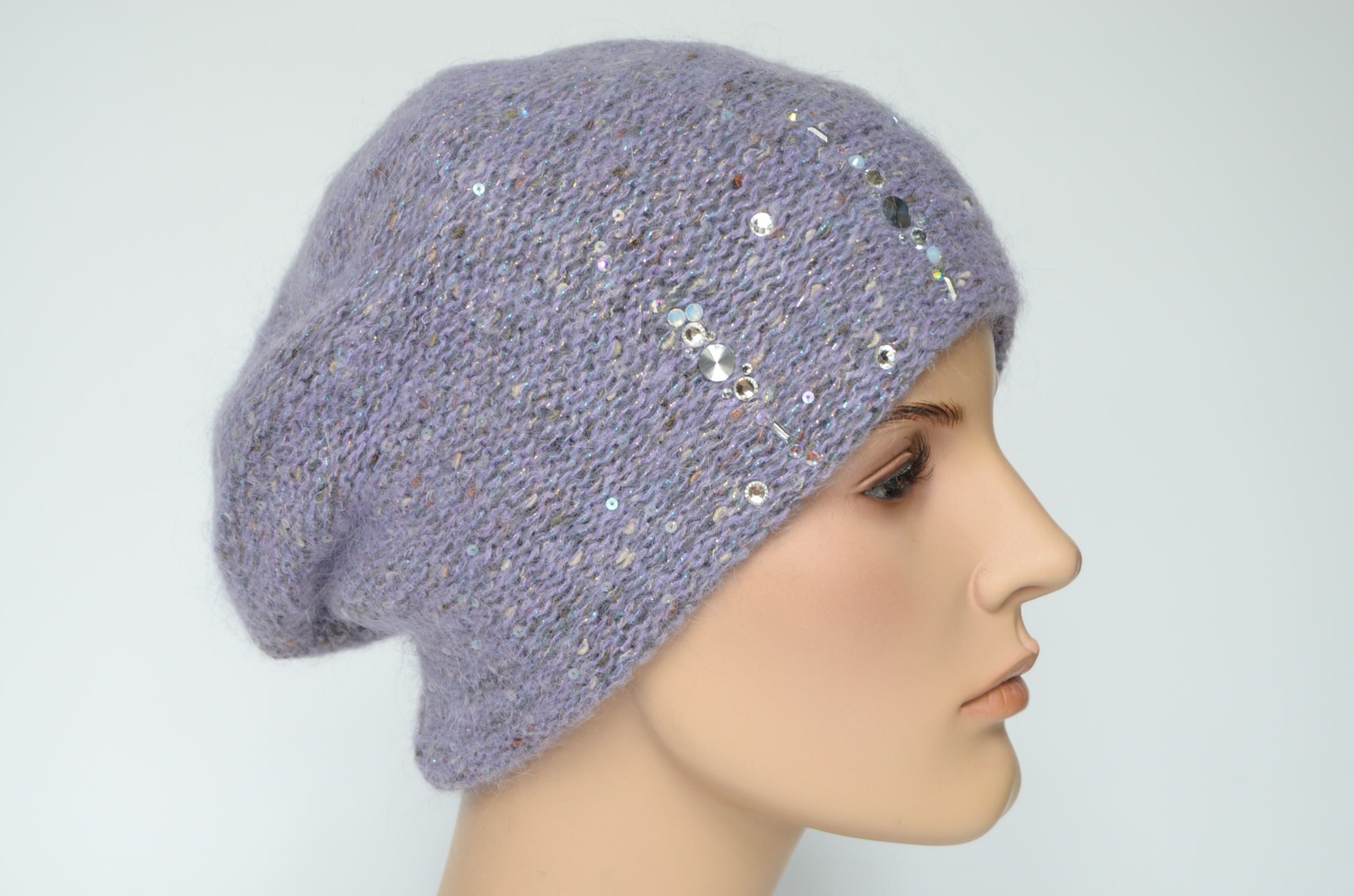 Вязаный берет лилового лавандового цвета зимний с украшениями стразами