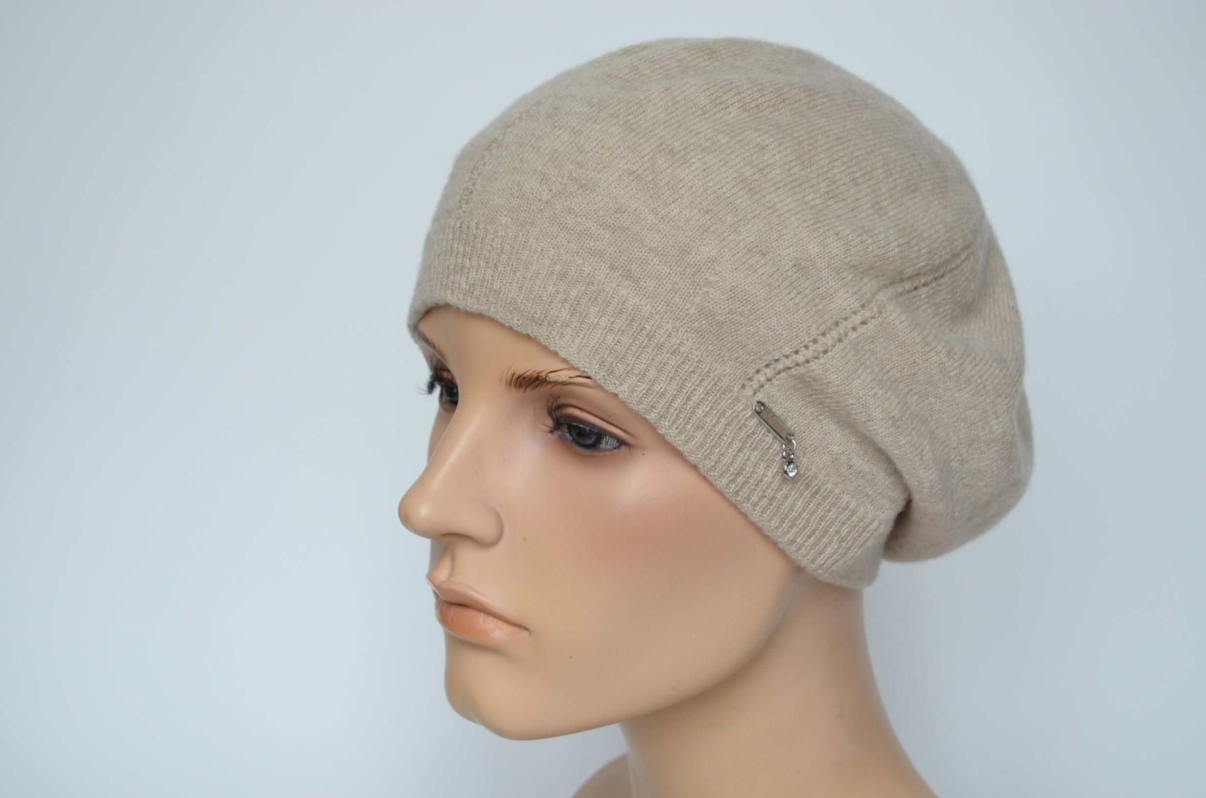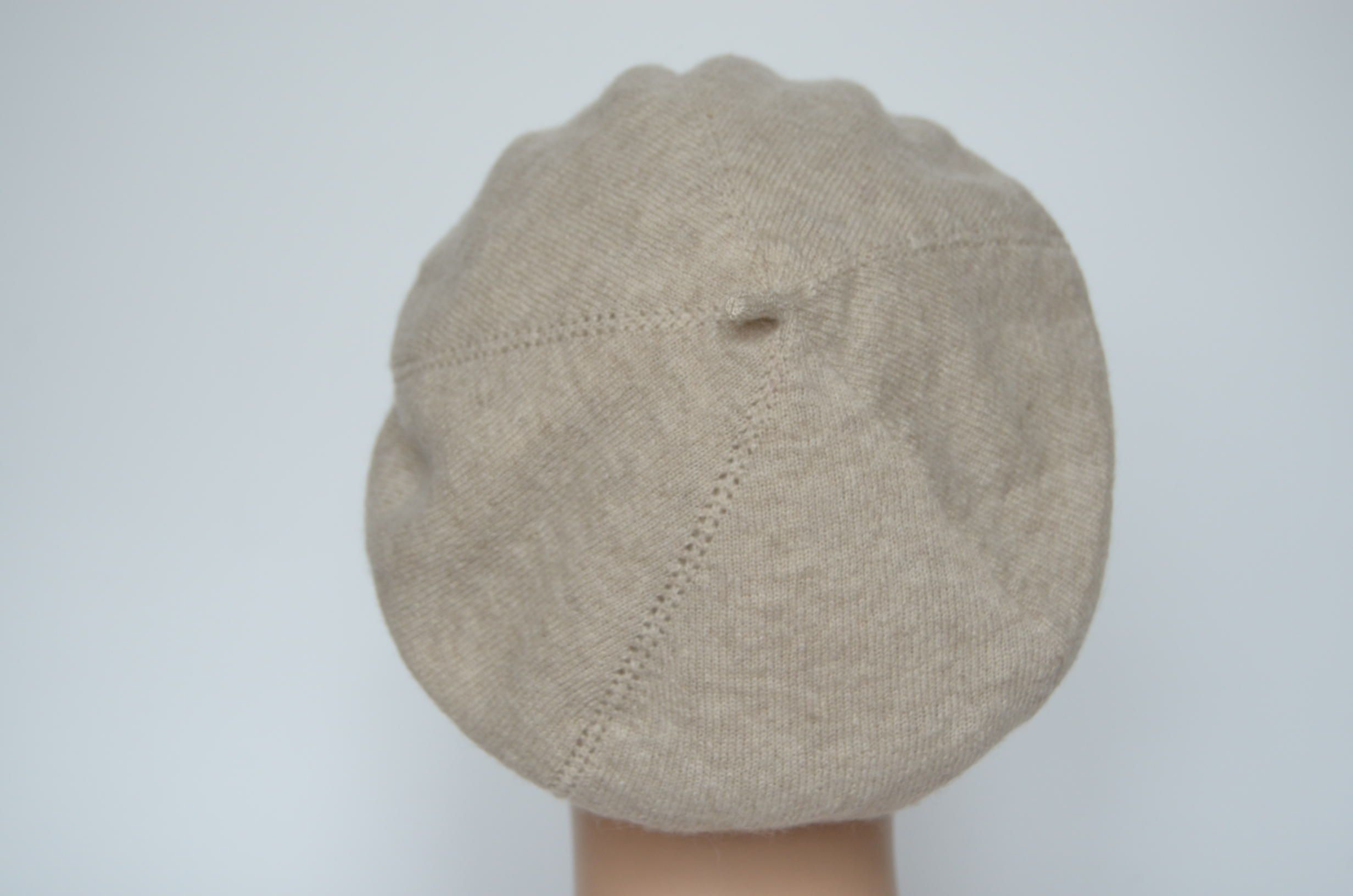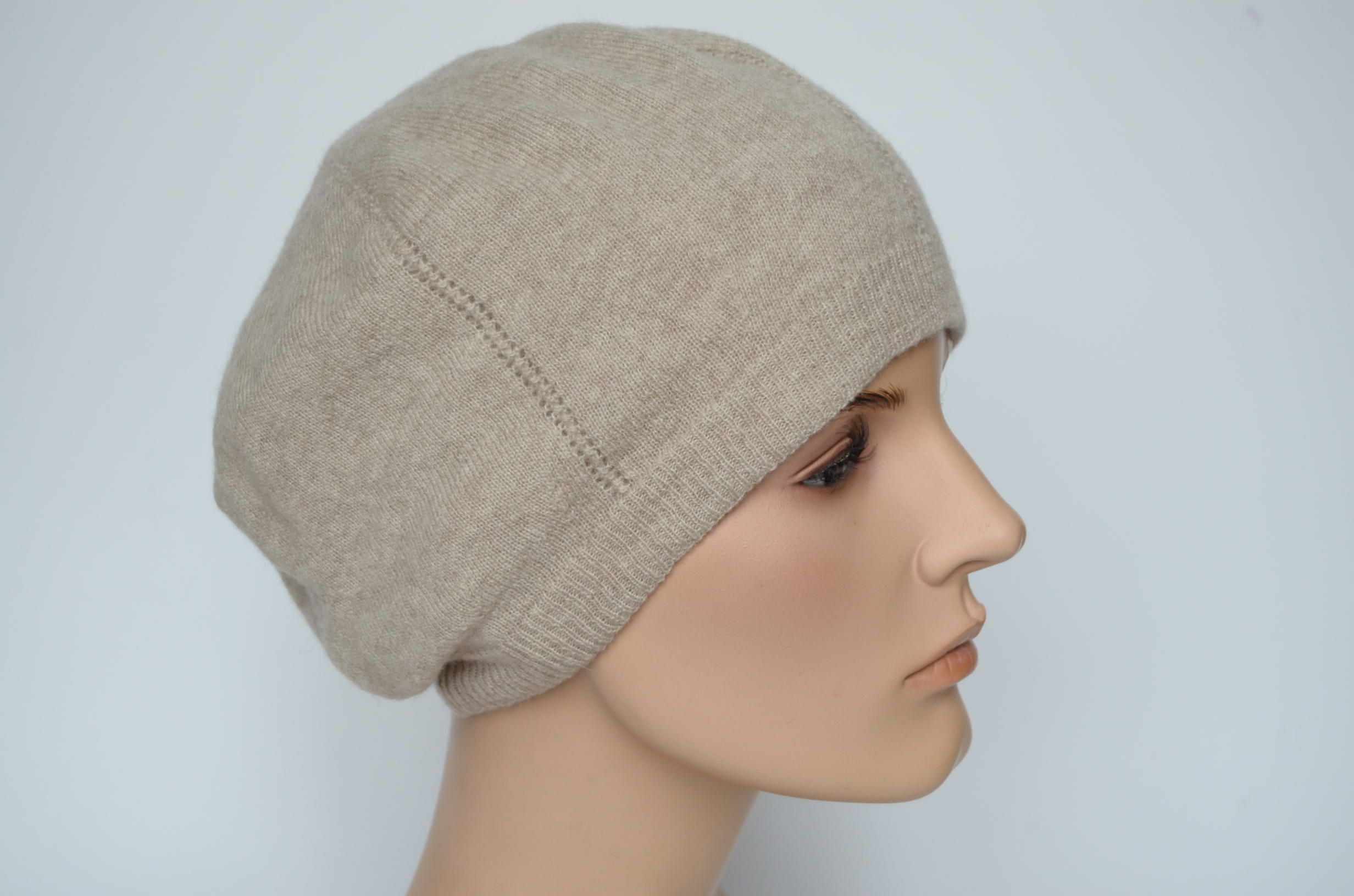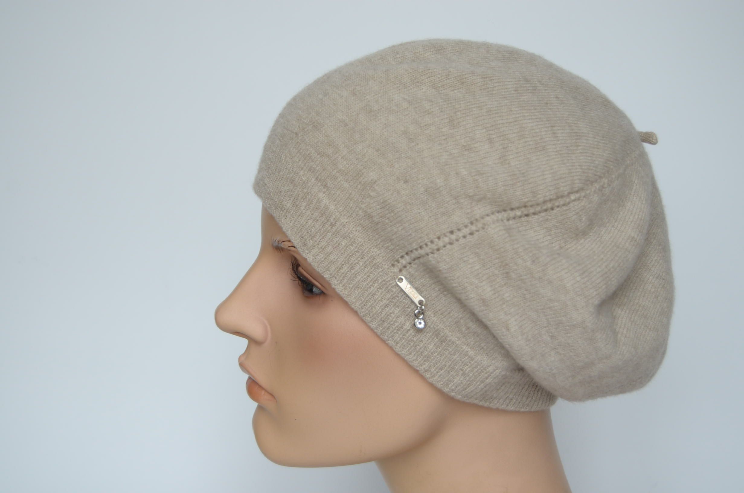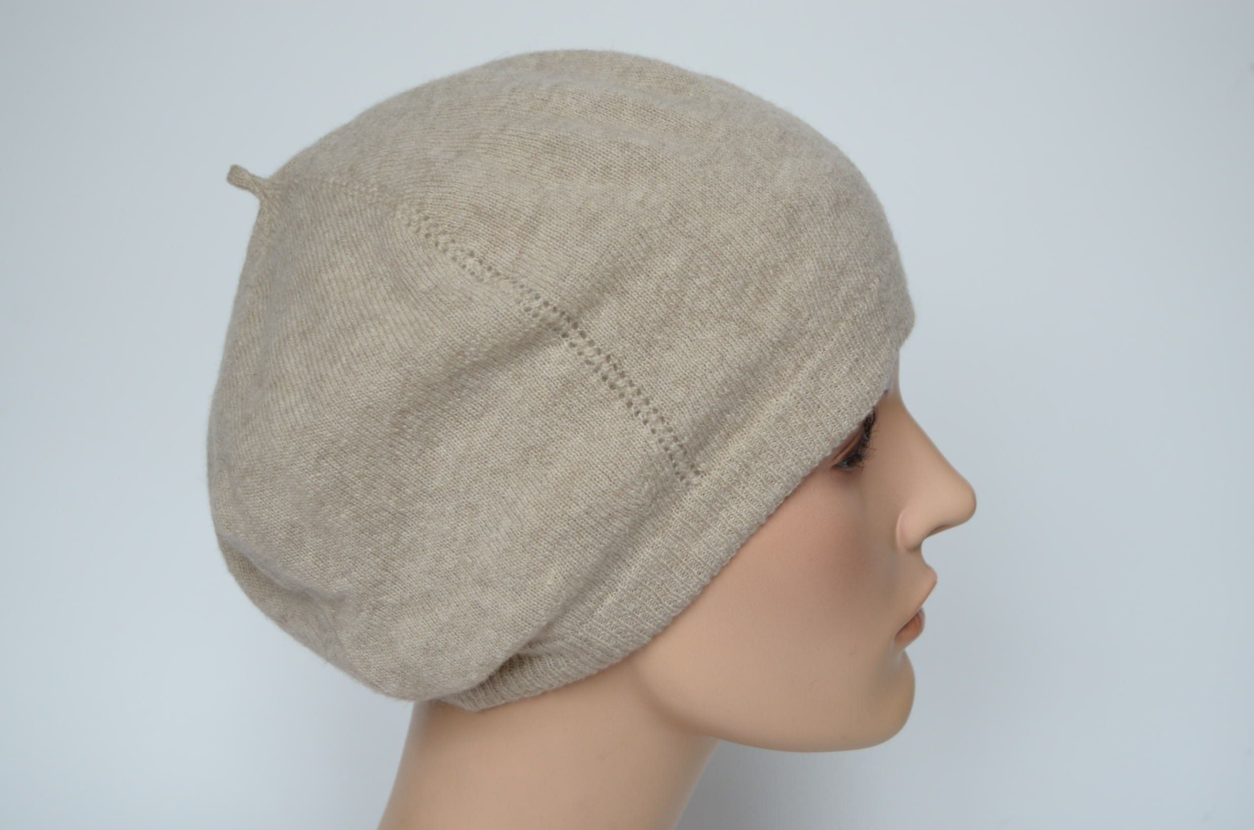 Кашемировый бежевый женский берет зимний с вязаным подкладом из кашемира
