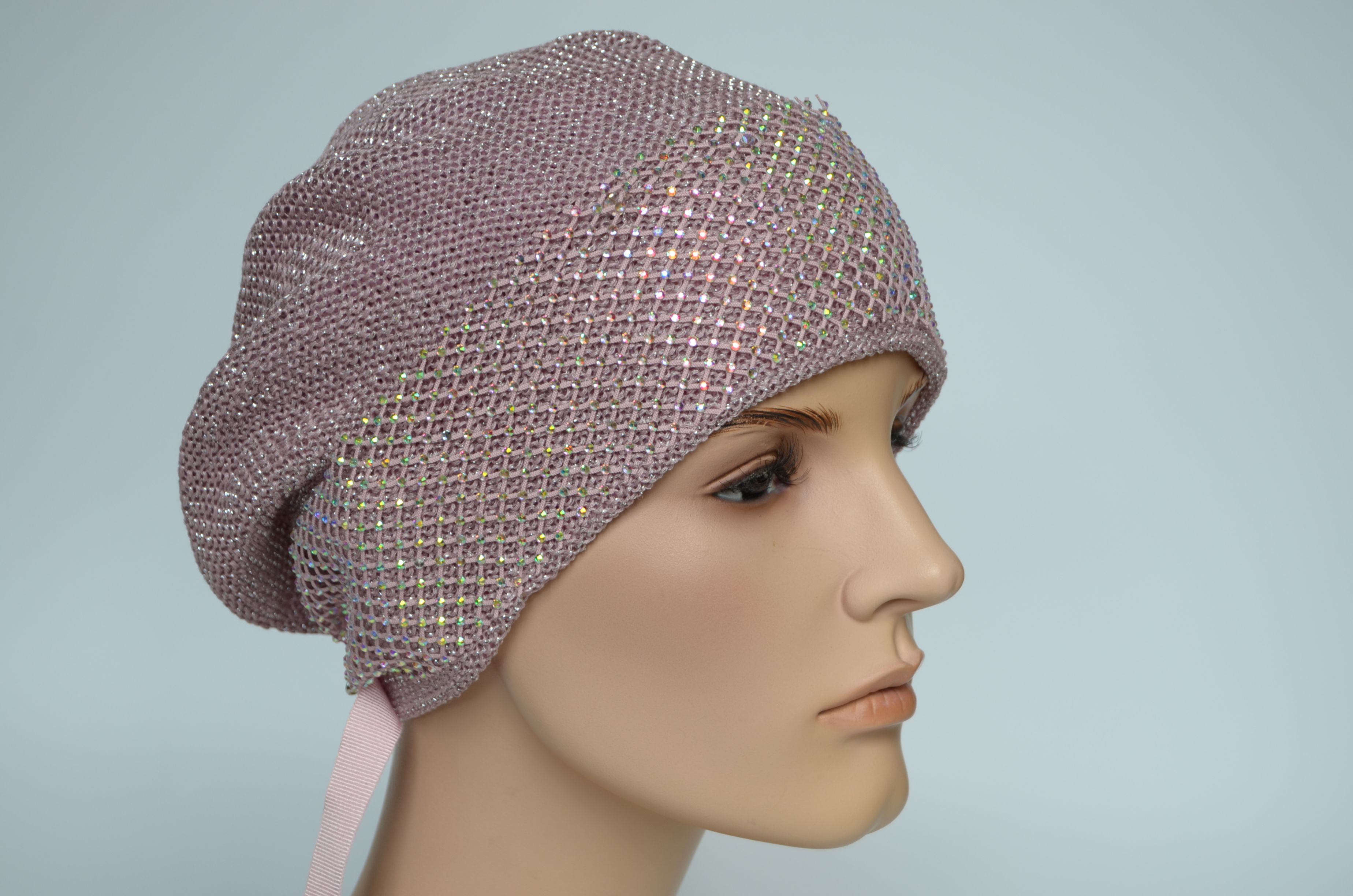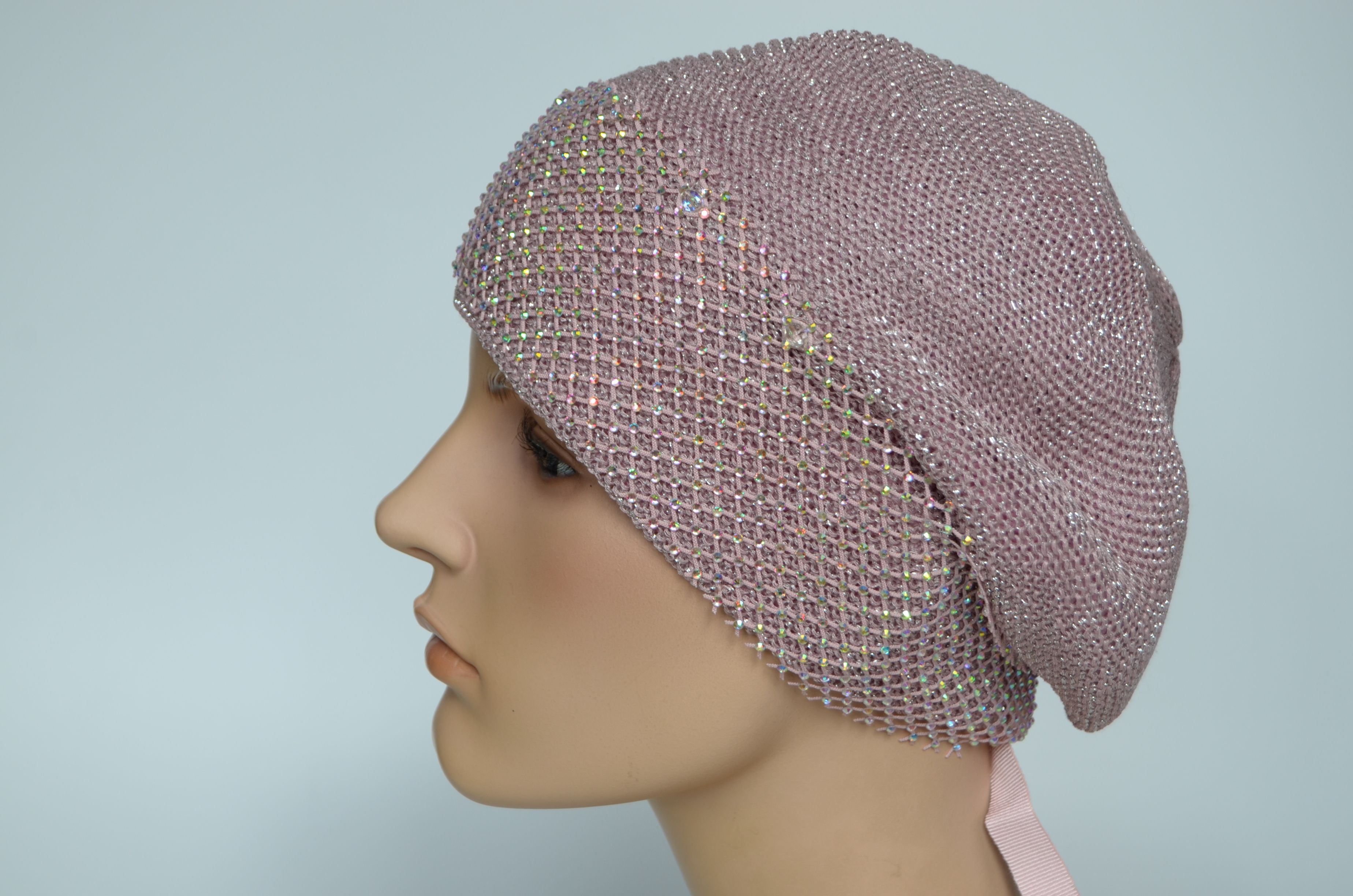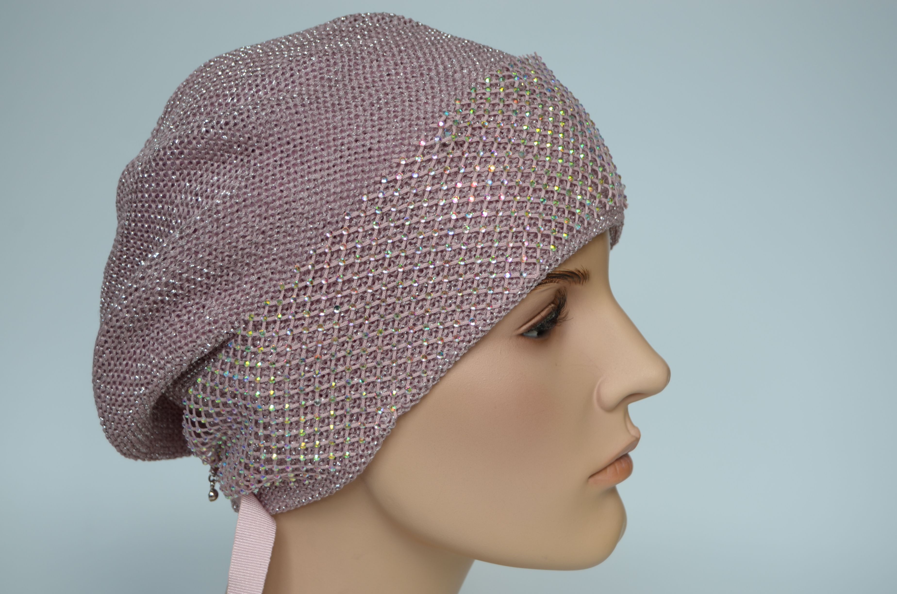 Берет вязаный весенний розового цвета с сеткой страз для женщин. Съемная сетка со стразами