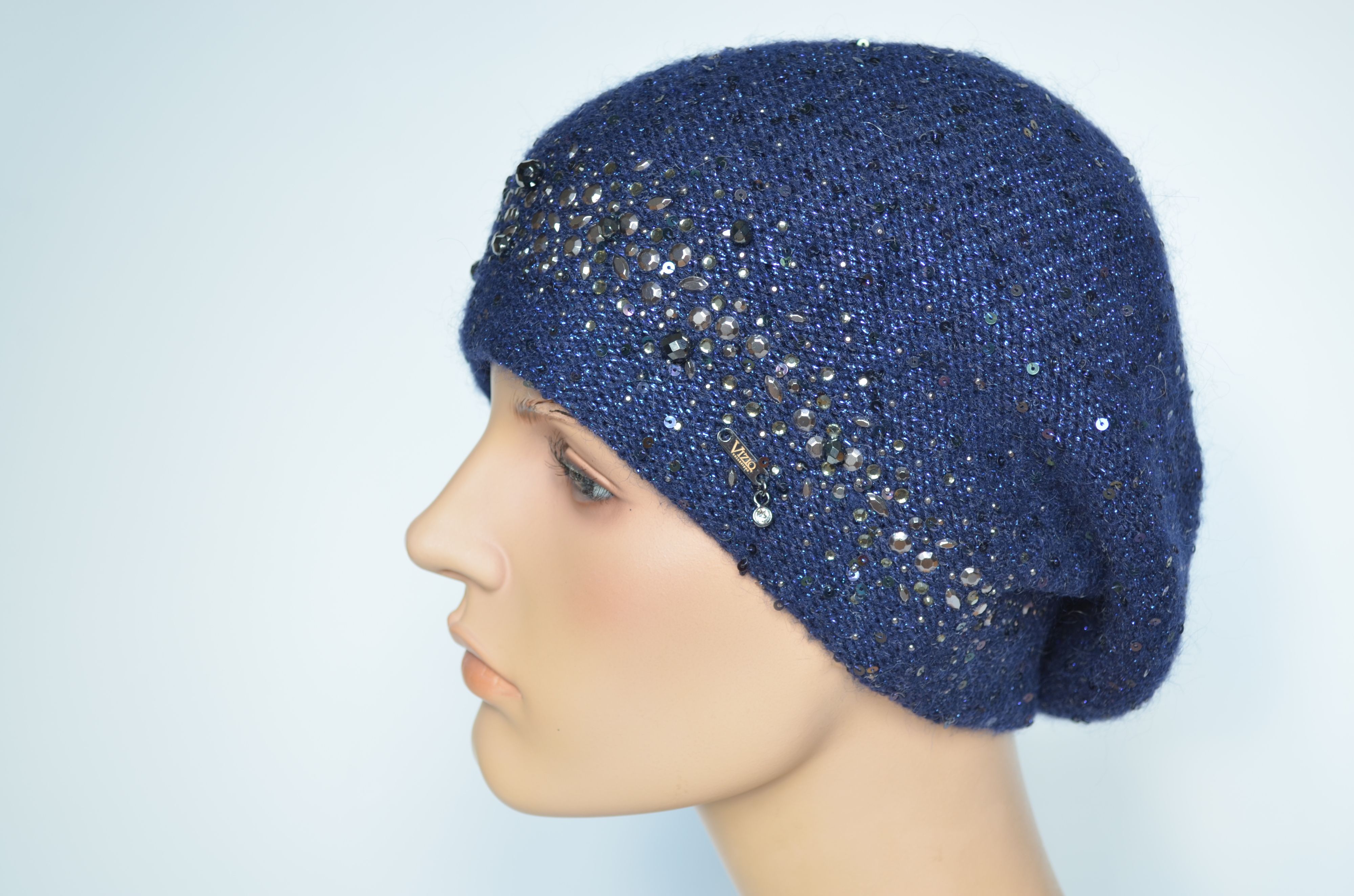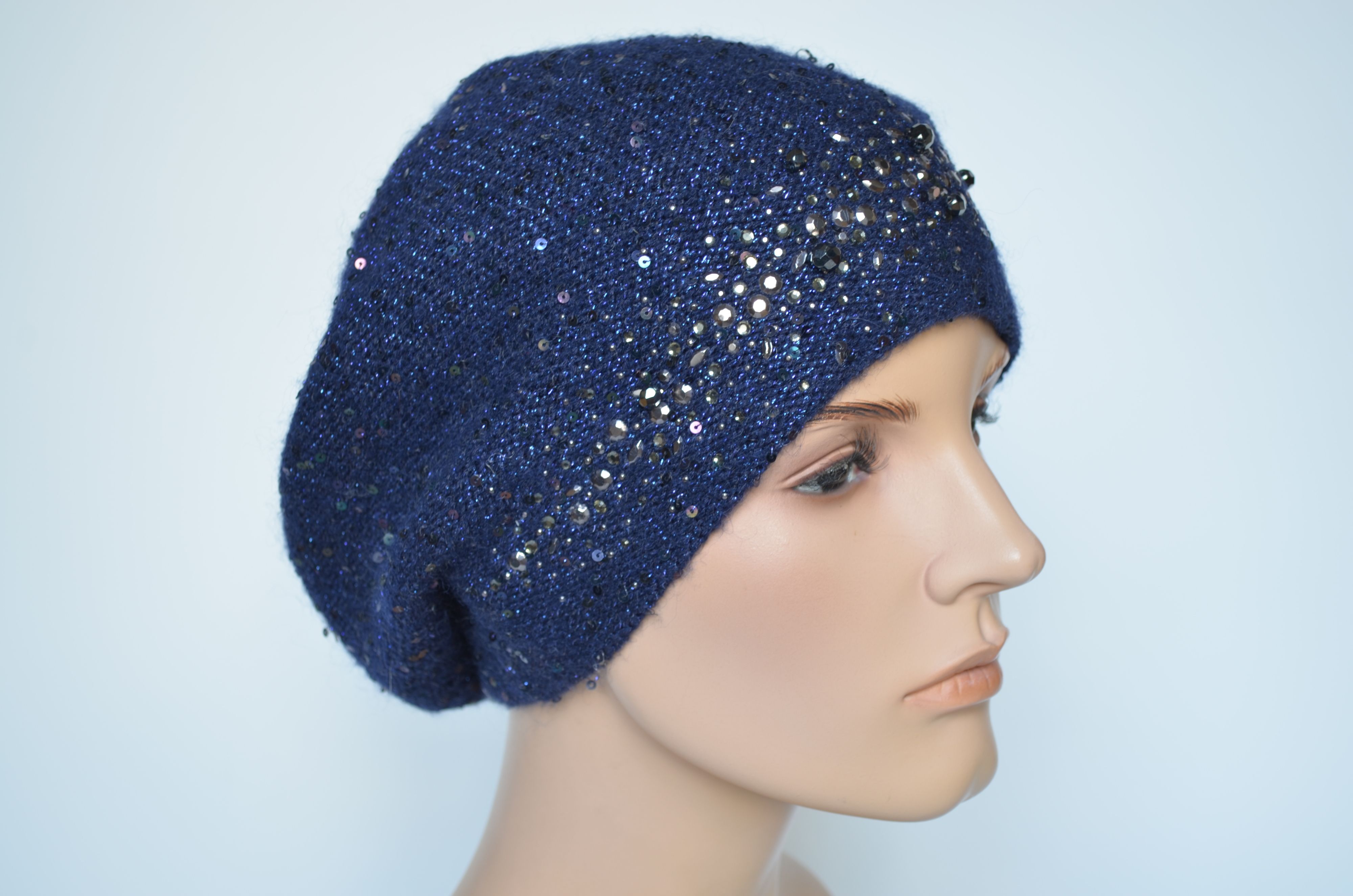 Синий женский берет вязаный с пайетками и стразами Сваровски зимний с вязаным подкладом
