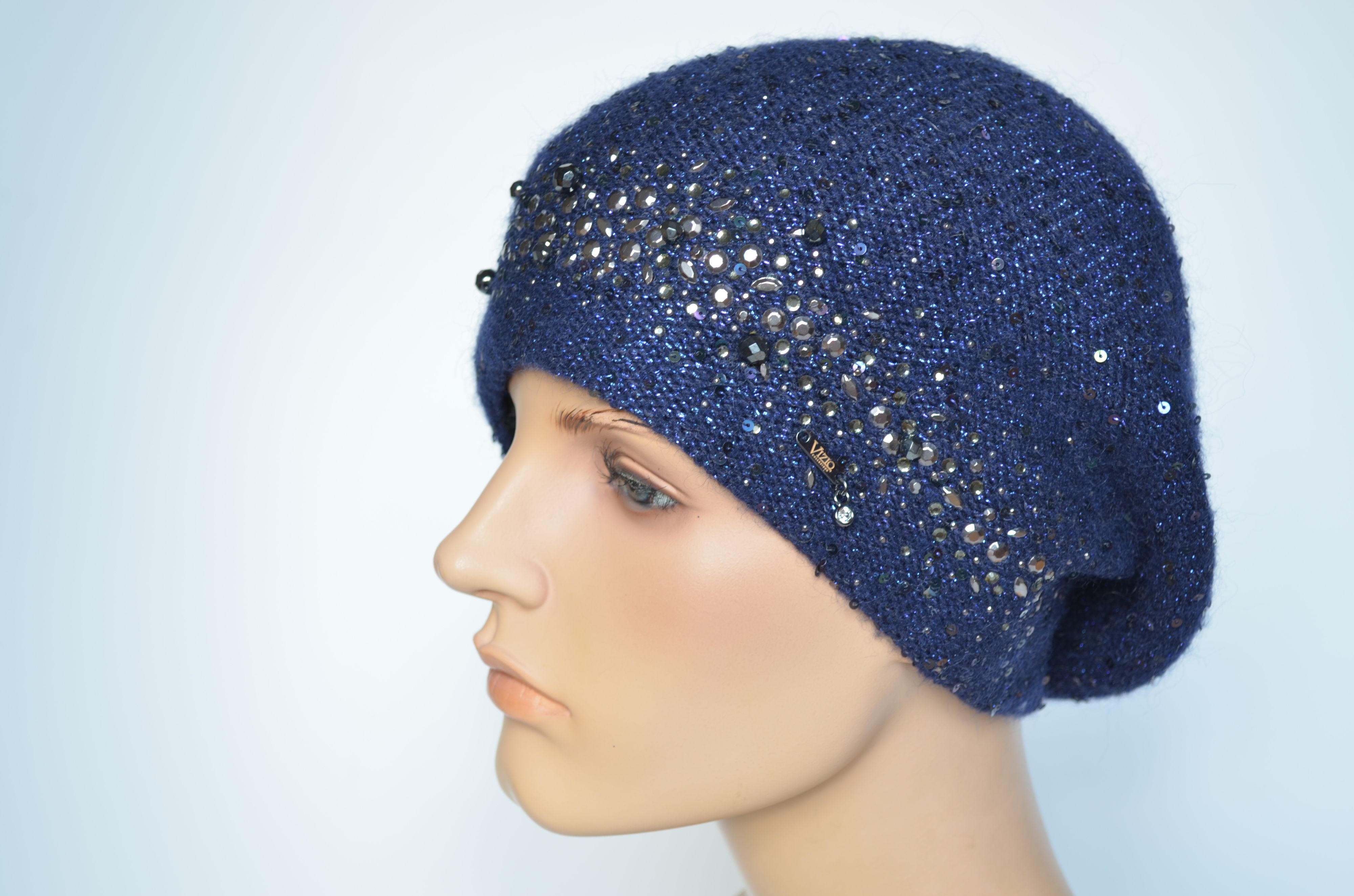 Синий берет женский вязаный с пайетками и стразами Vizio Италия 1364 зимняя коллекция итальянских беретов и шапок с пайетками Визио