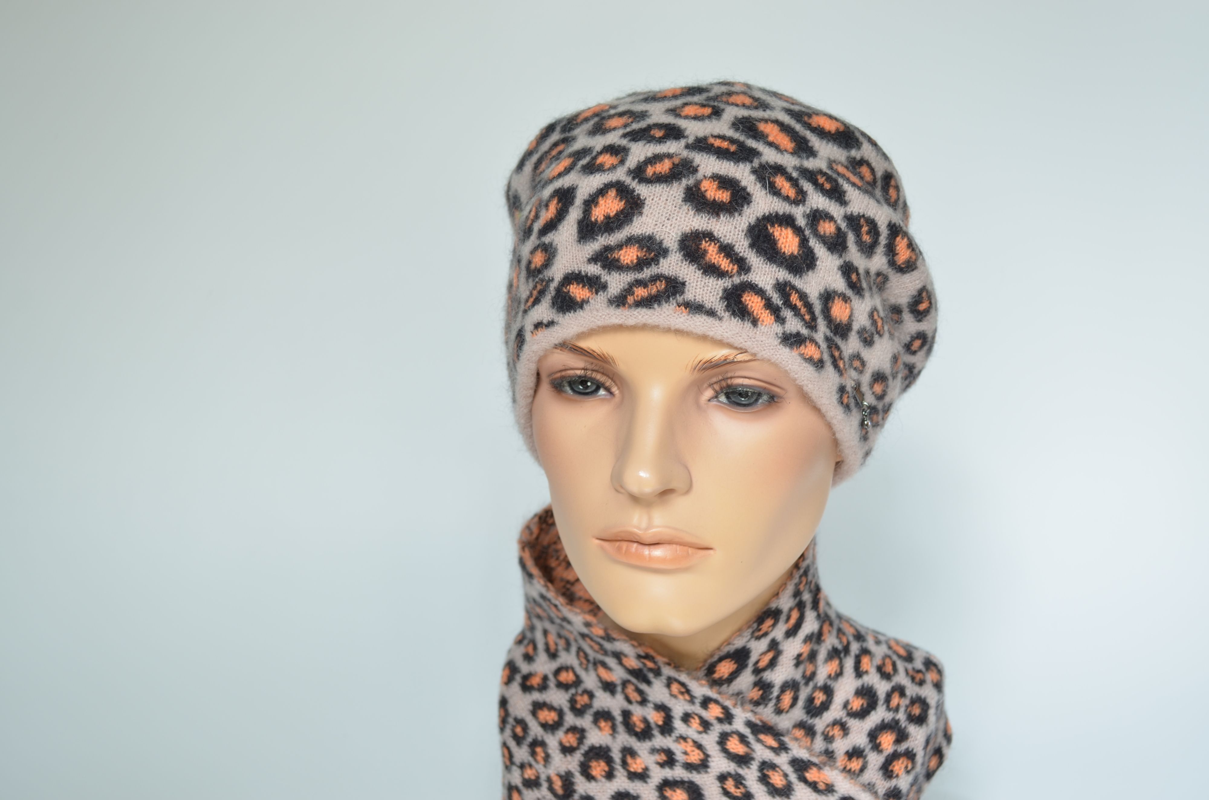 Леопардовый берет и шарф зимний вязаный комплект