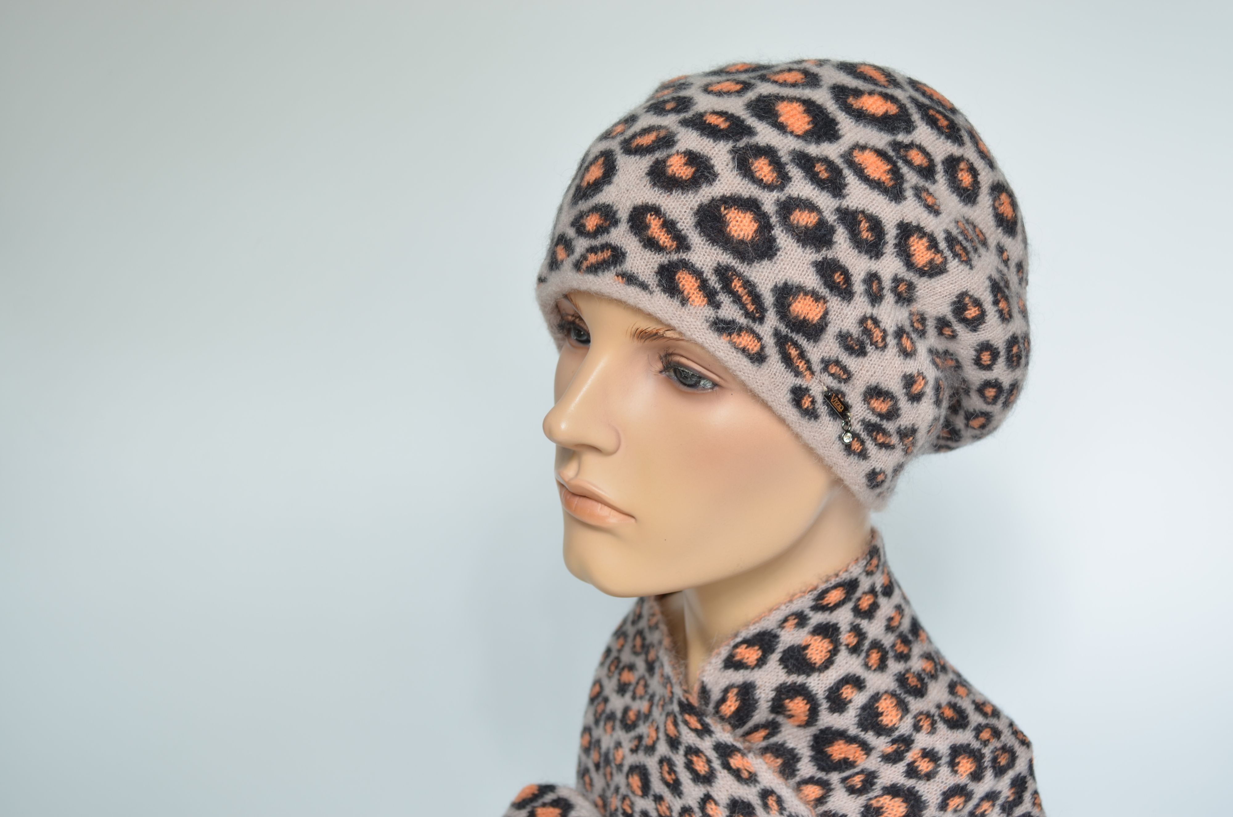 Женский вязаный берет и шарф в леопардовой расцветке Vizio Италия 1027 белый с оранжевыми пятнами коллекция головных уборов Визио зима 2024