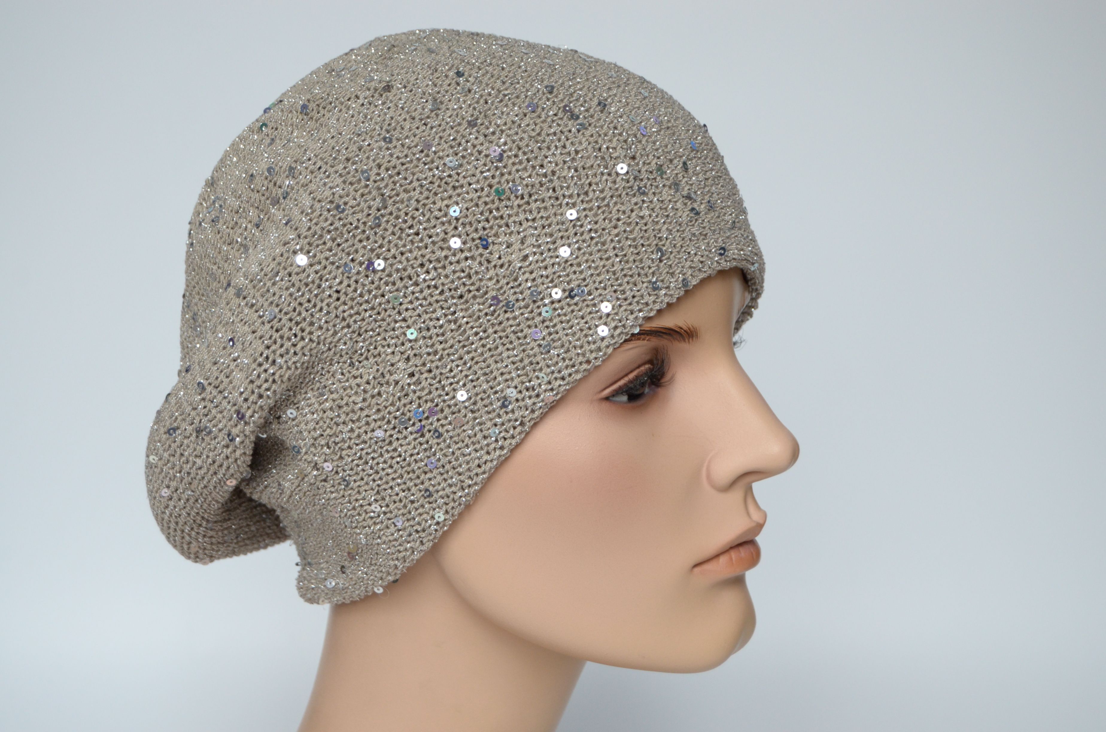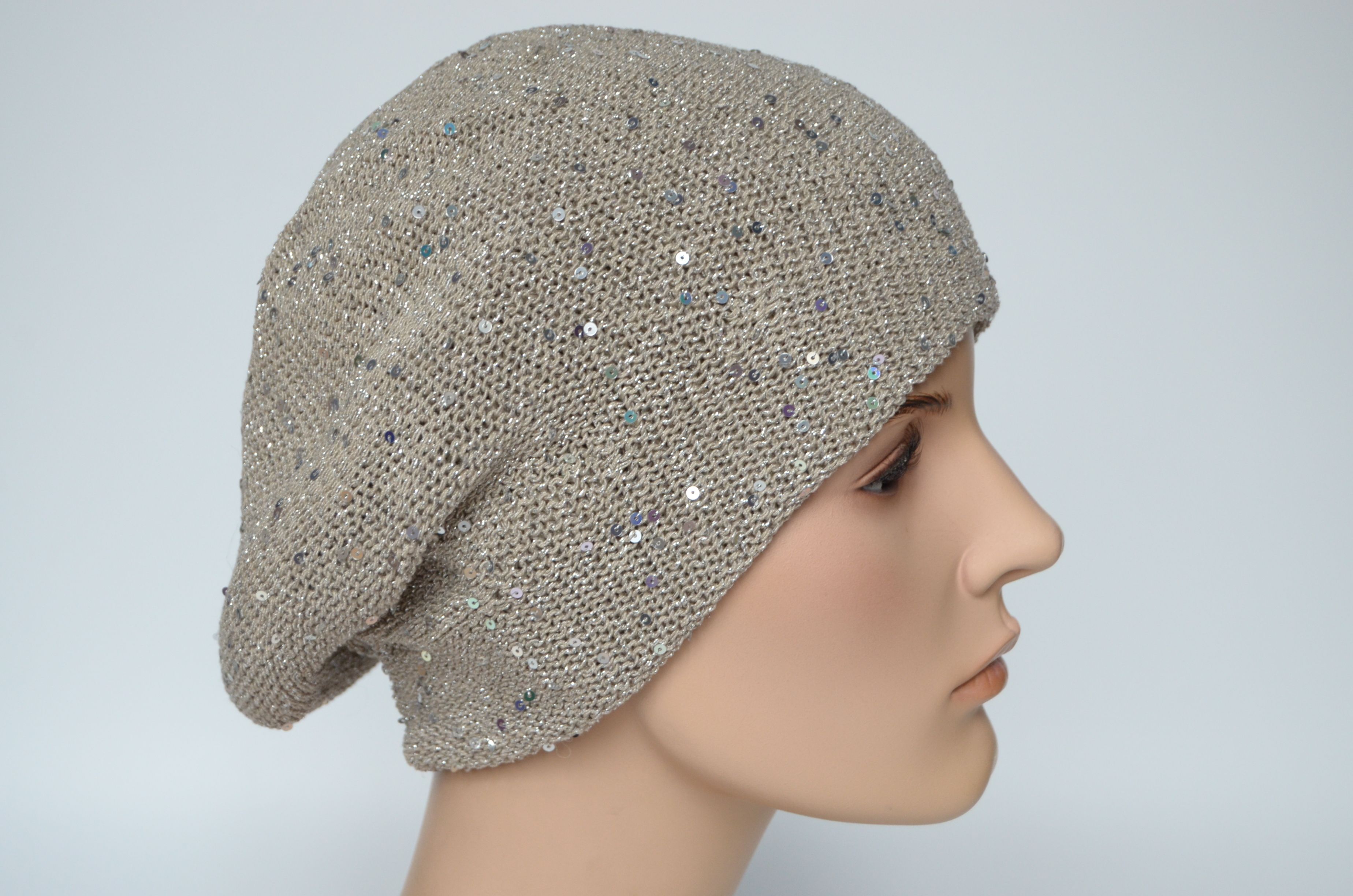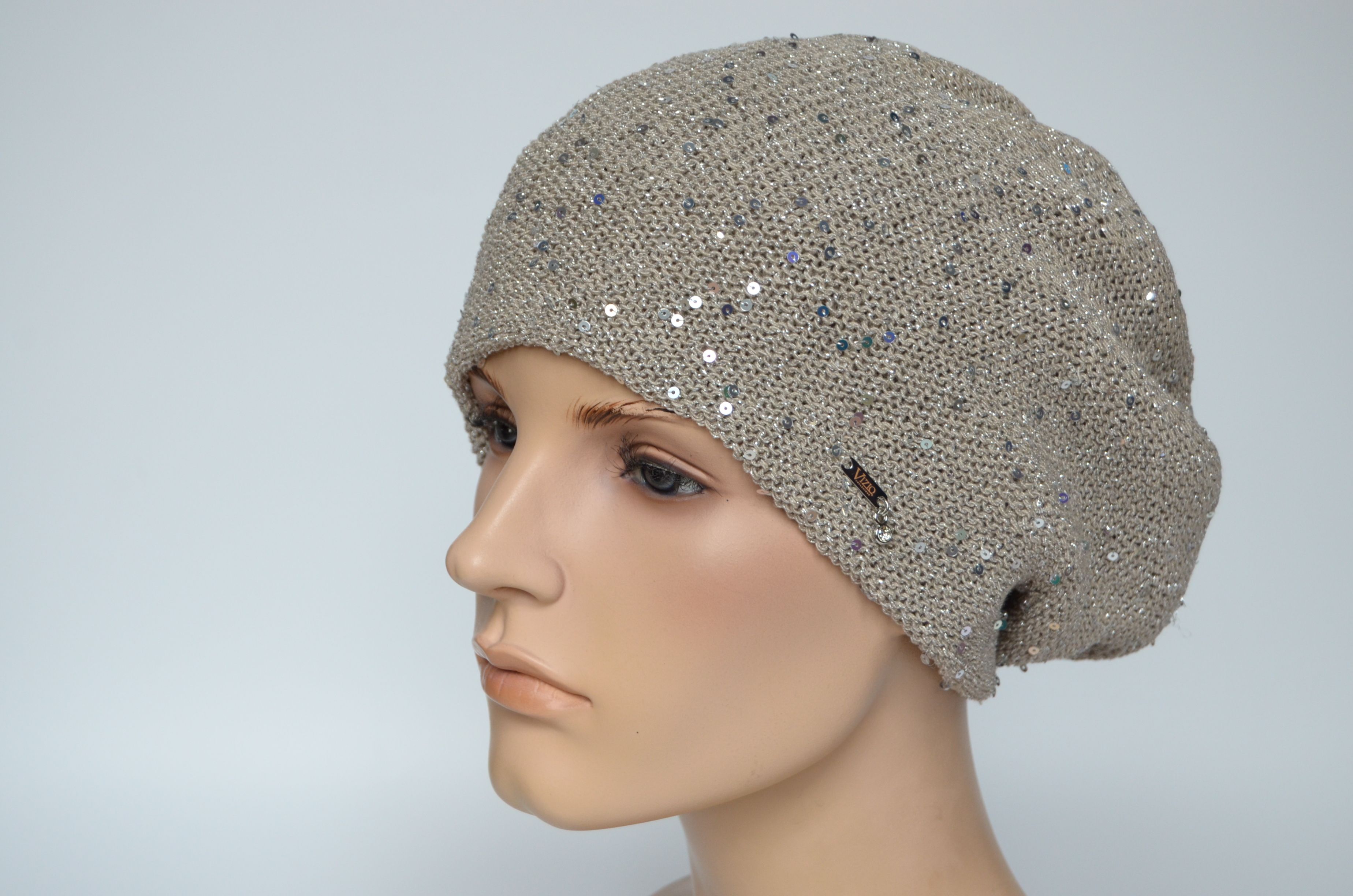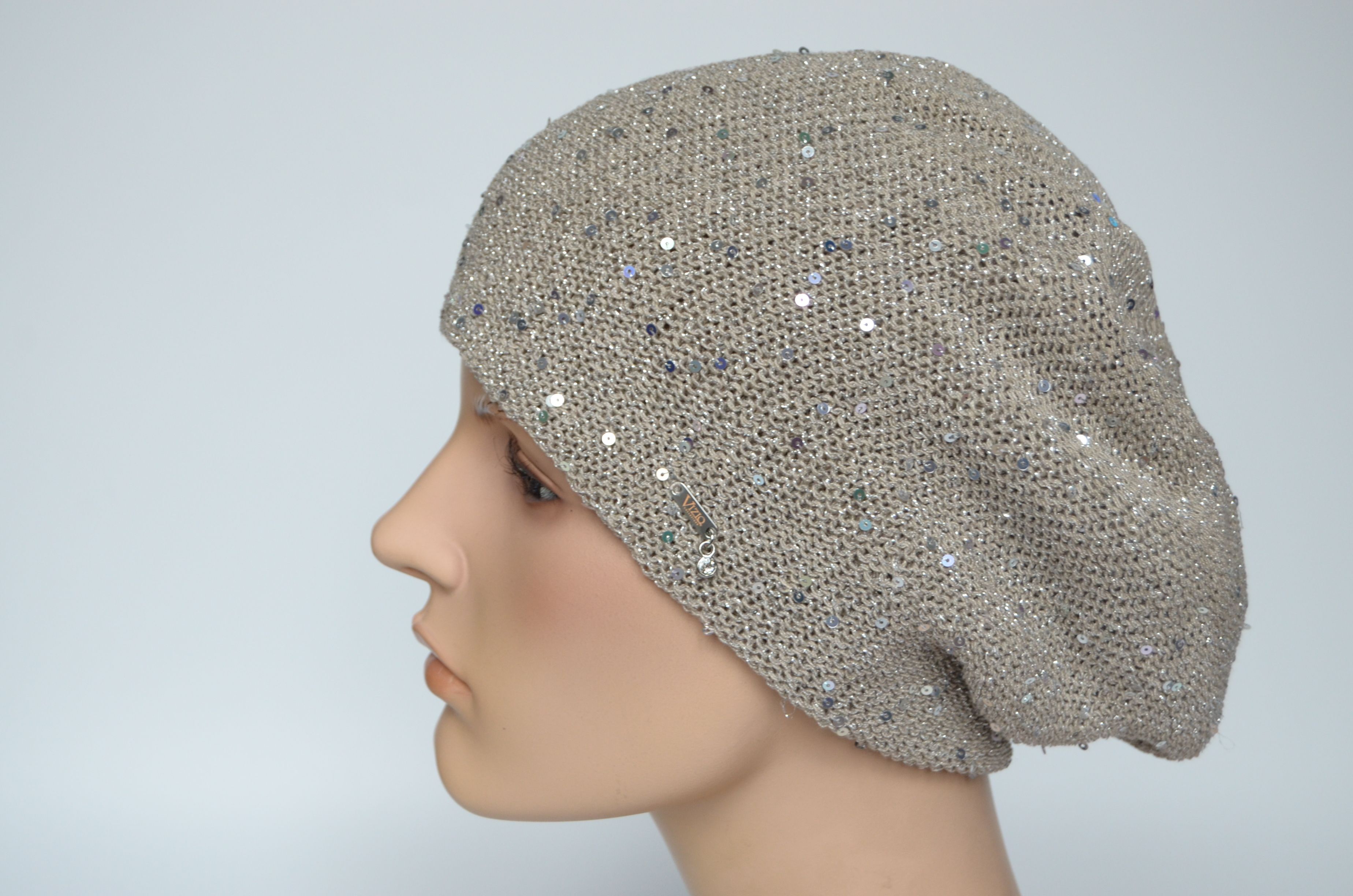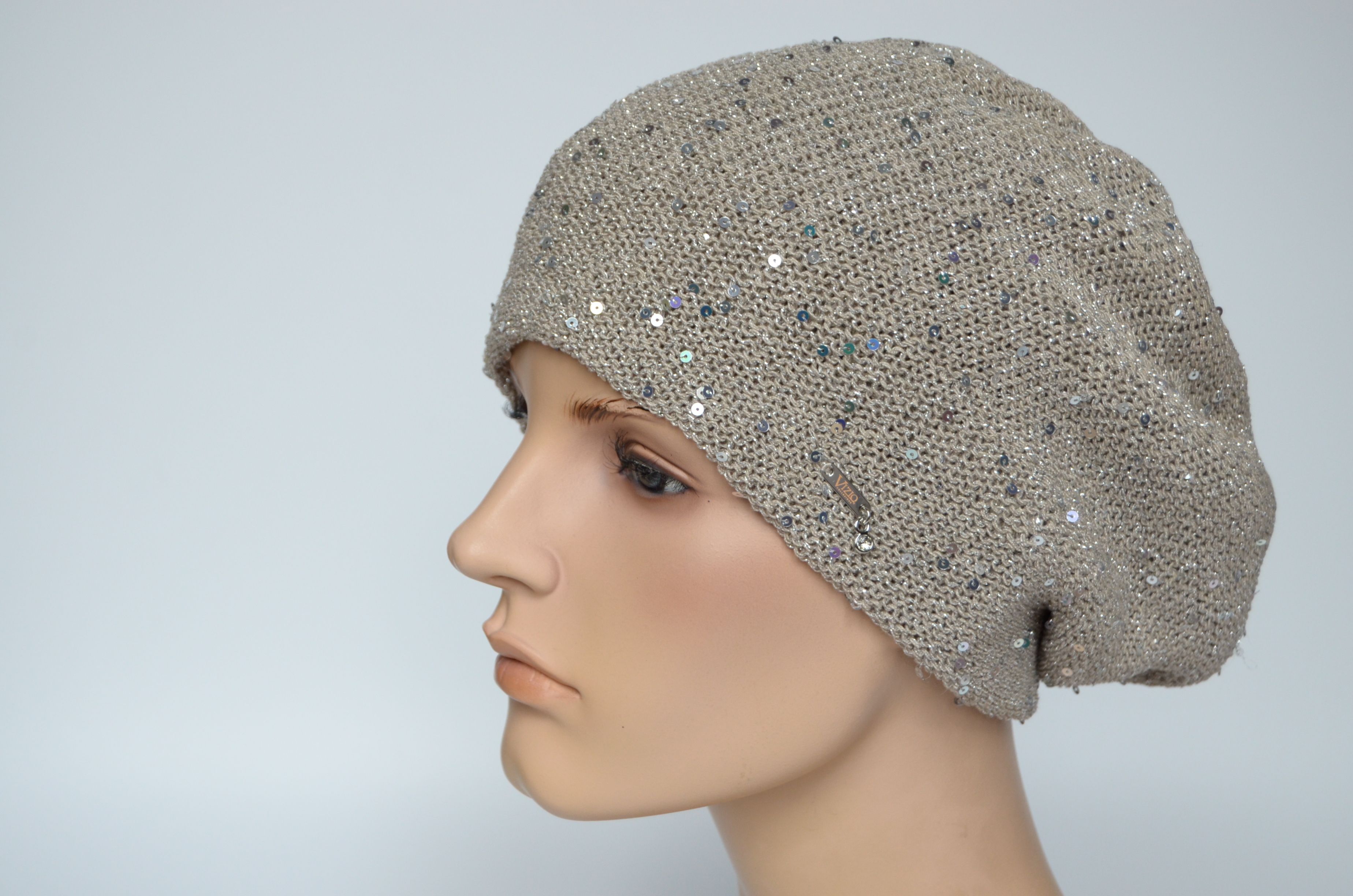 Берет вязаный весенний бежевого цвета с пайетками для женщин.