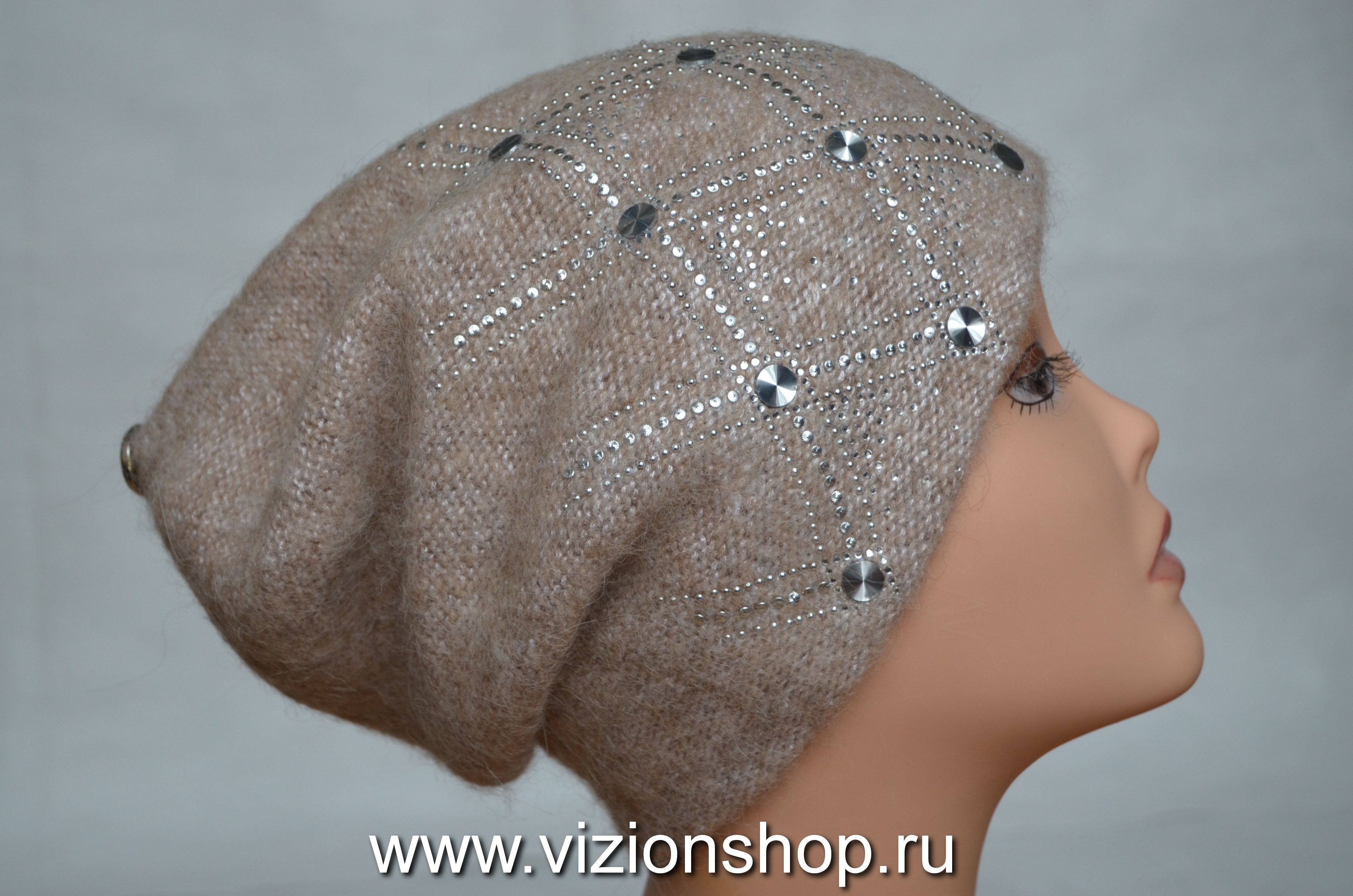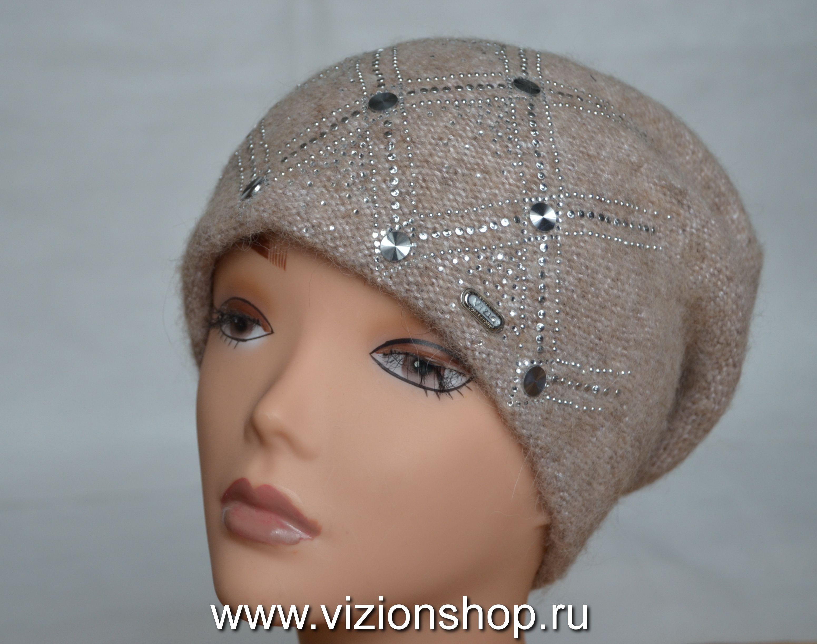 Вязаная бежевая шапка женская с украшениями Италия Vizio 6111 из коллекции модных шапок для женщин зима 2019 Vizio Collezione купить в интернет магазине вязаных головных уборов Италии Череповец, Вологда, Москва и Россия