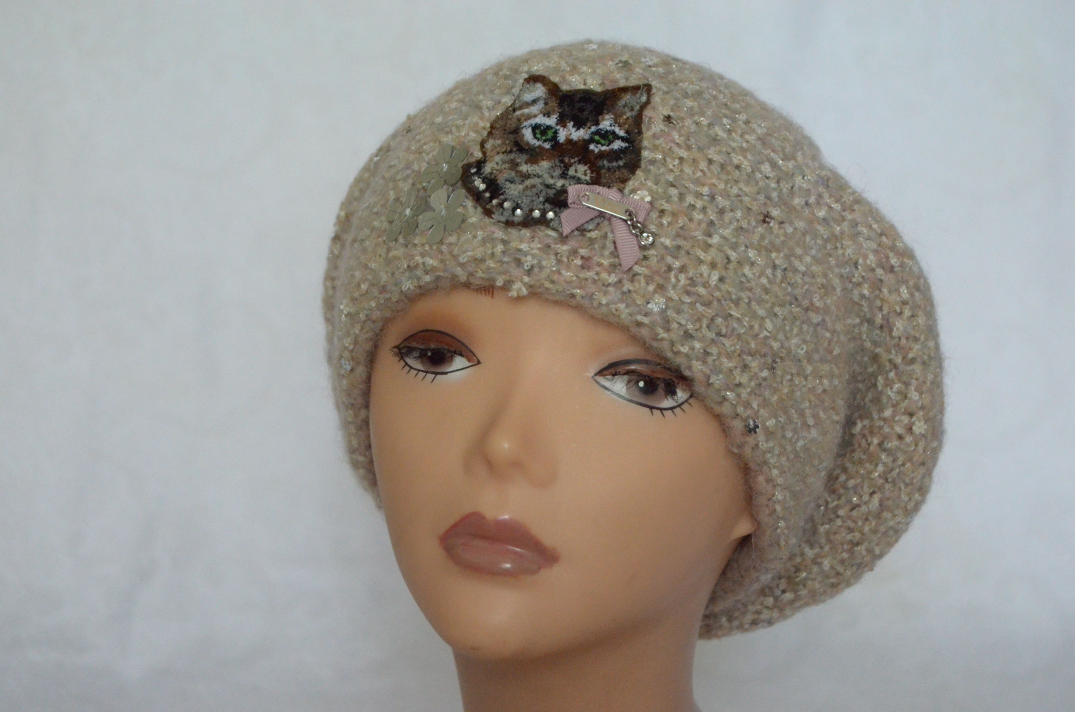 Вязаный берет с кошкой и крупными пайетками Vizio Италия 6444 бежевый купить в интернет магазине итальянских женских головных уборов
