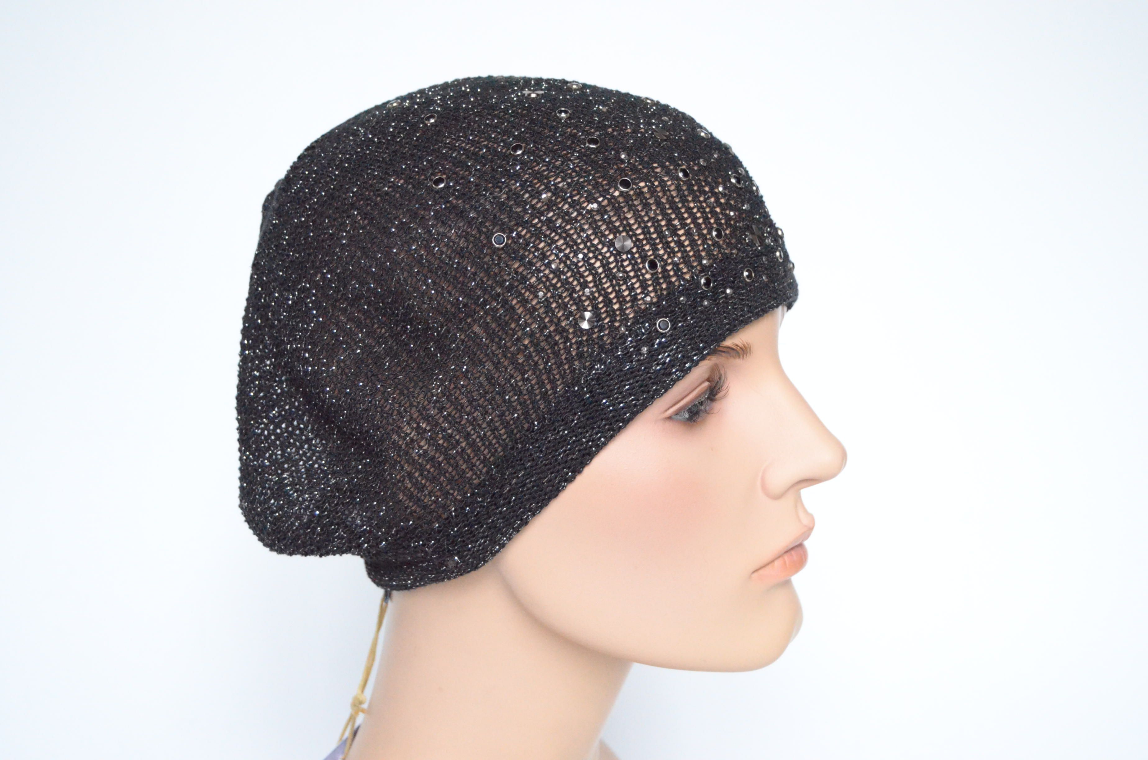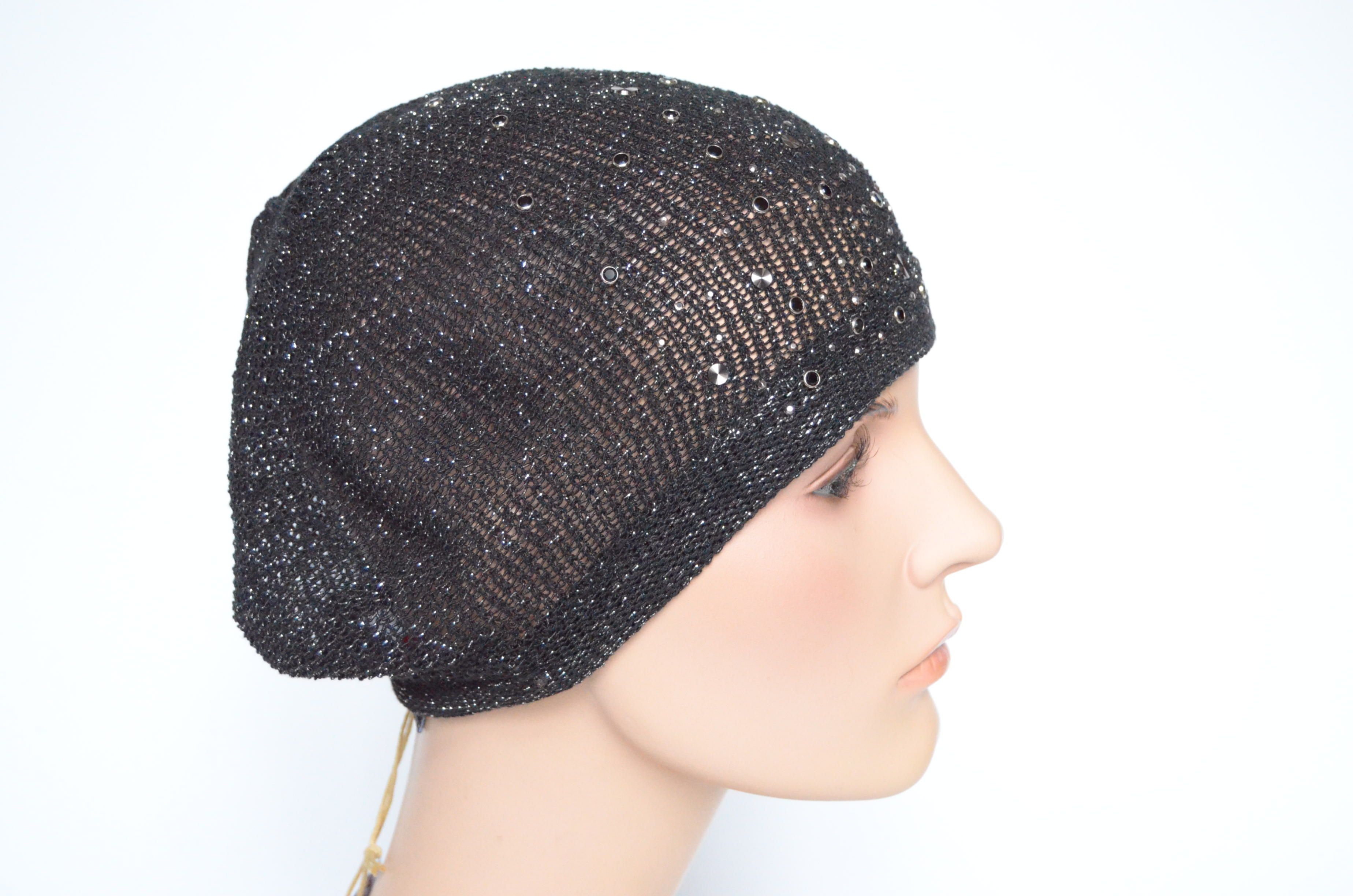 Летний черный вязаный берет с украшениями для женщин на лето - осень - весну Vizio Италия 6625 одинарный из коллекции итальянских летних головных уборов Визио