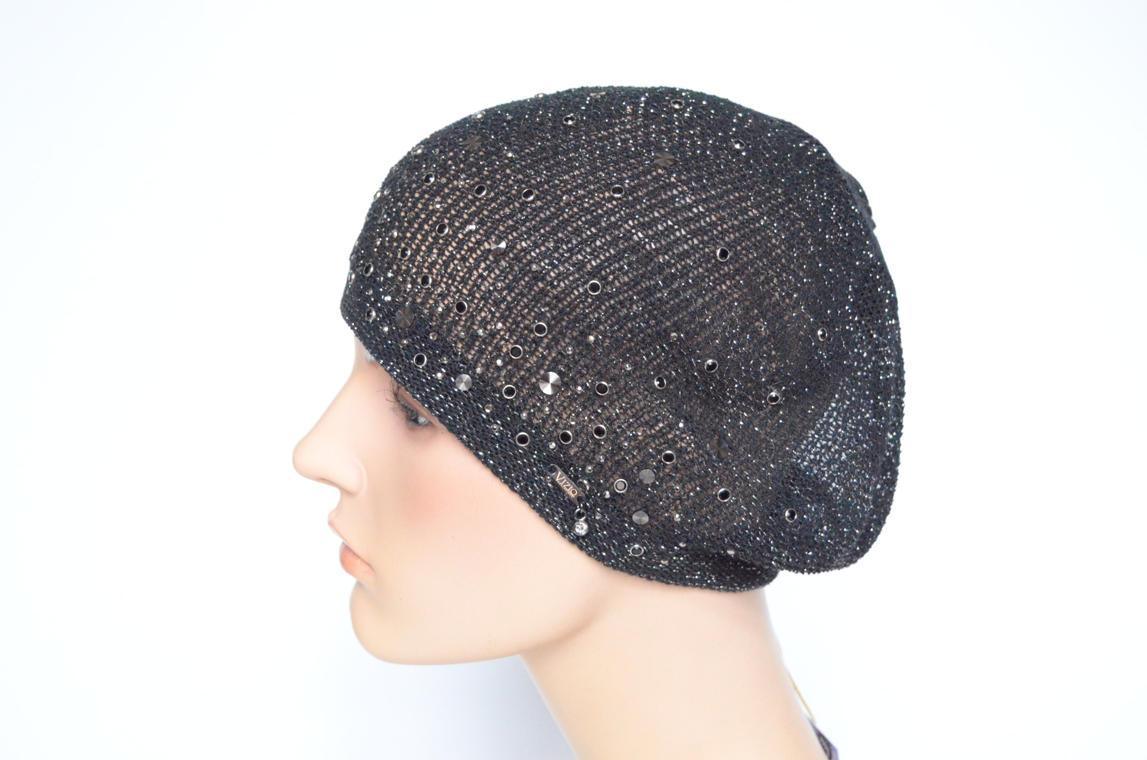 Женский вязаный летний берет черного цвета лето - осень - весна Vizio 6625 с украшениями купить из коллекции весенних и осенних головных уборов для женщин Визио с бесплатной доставкой по Москве и России