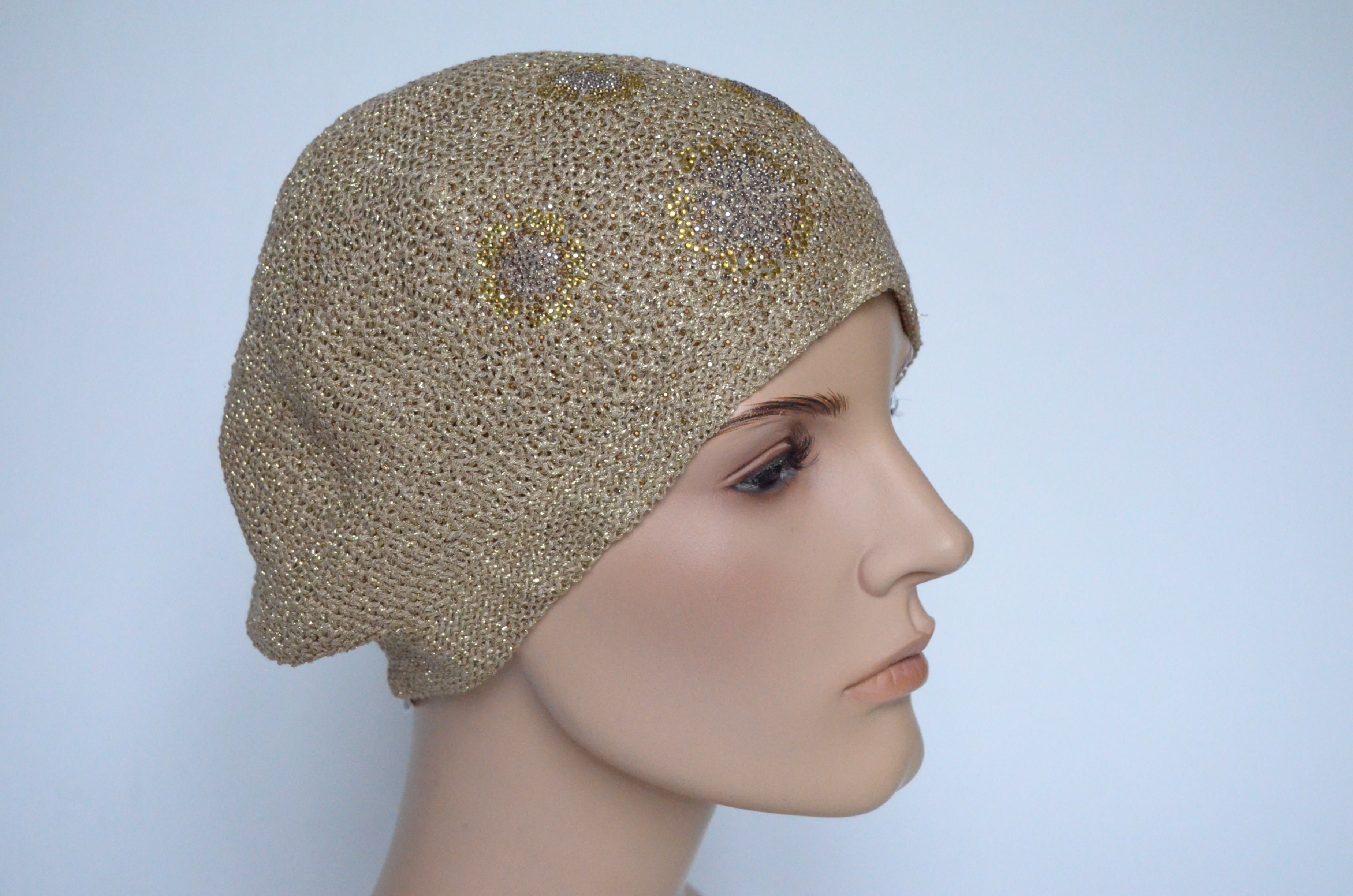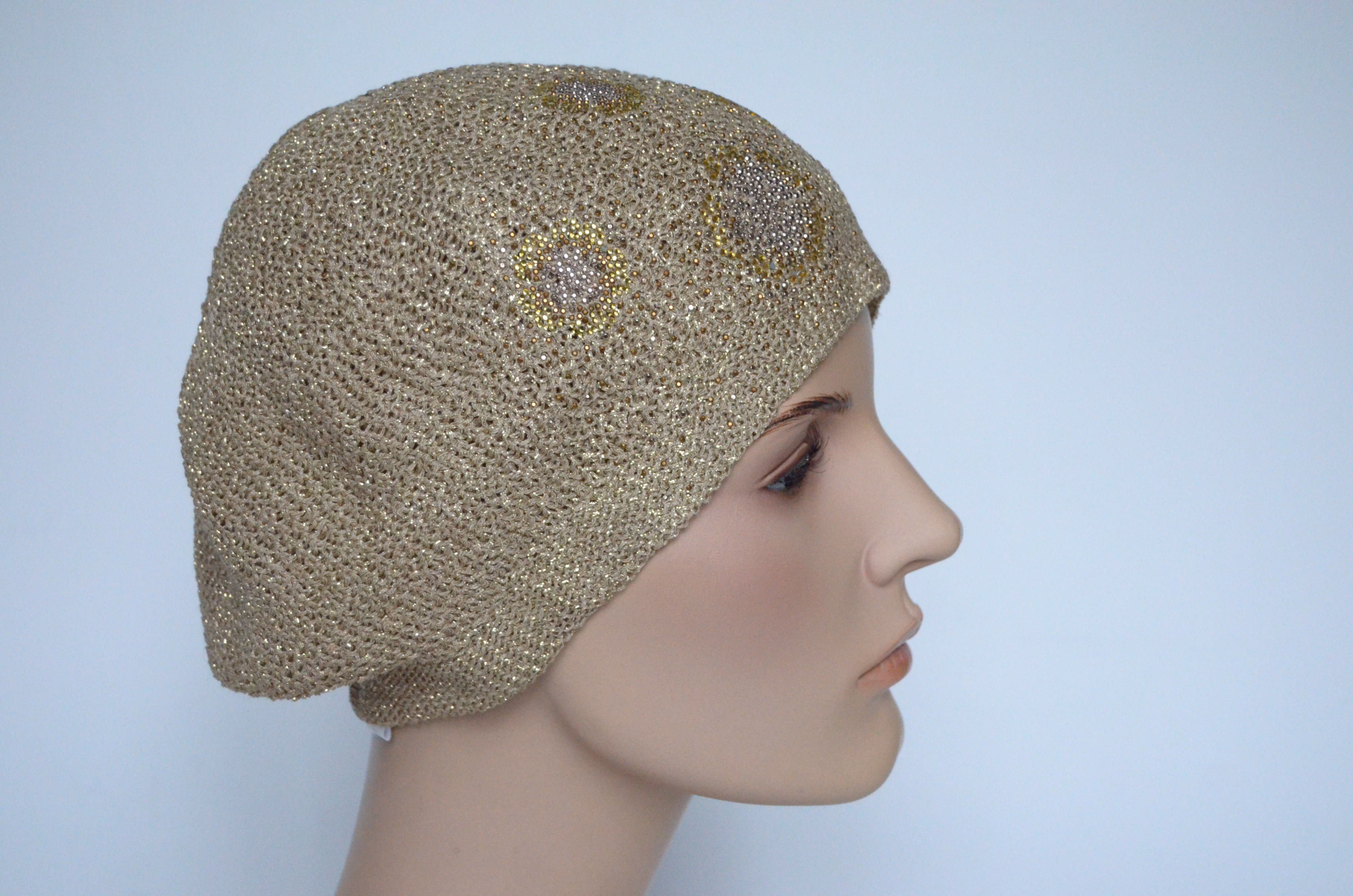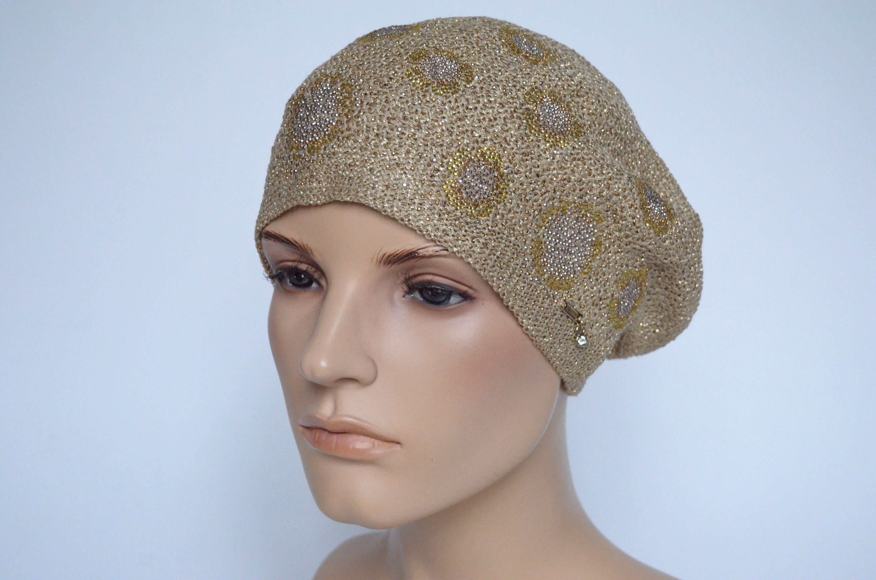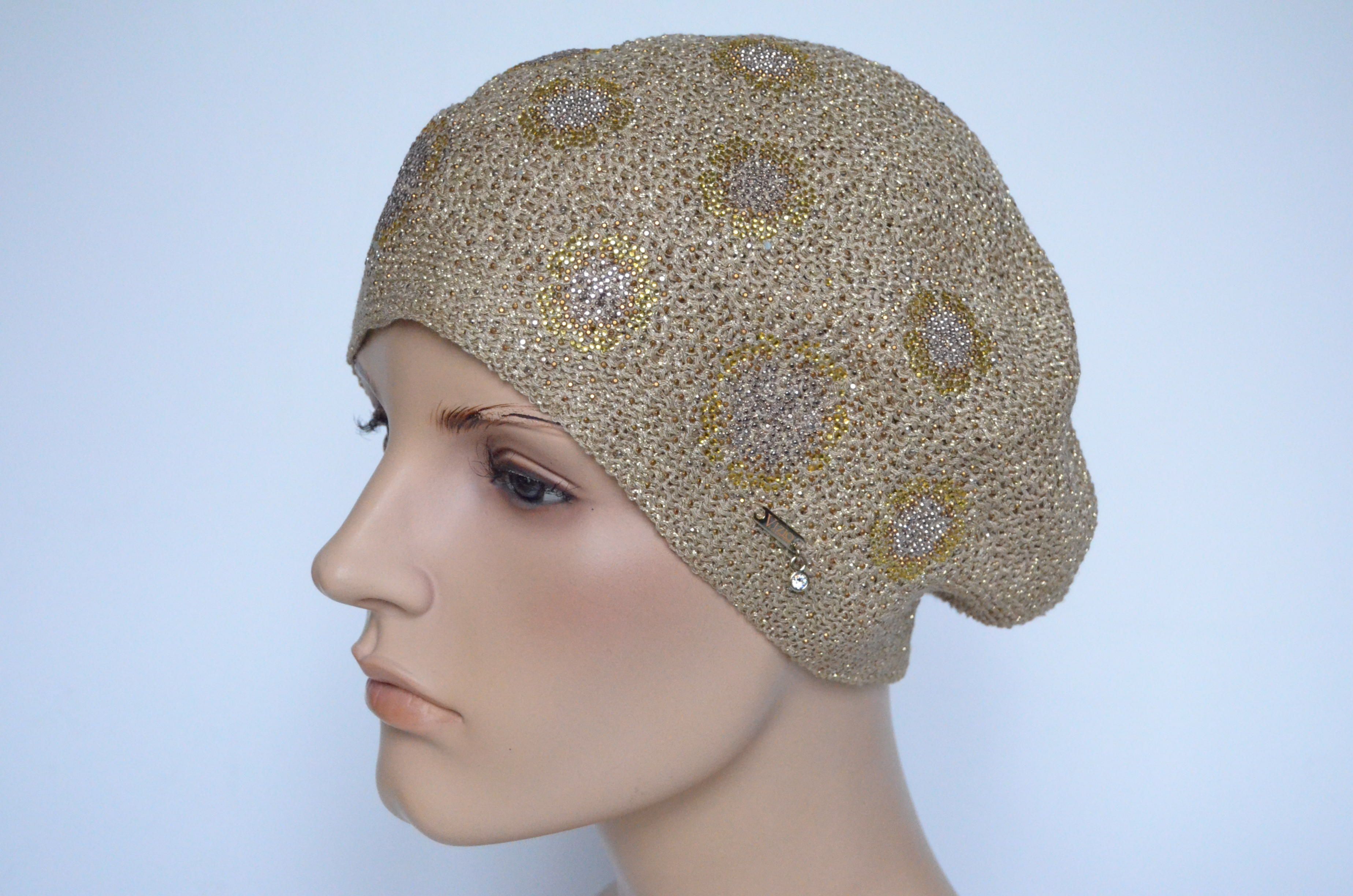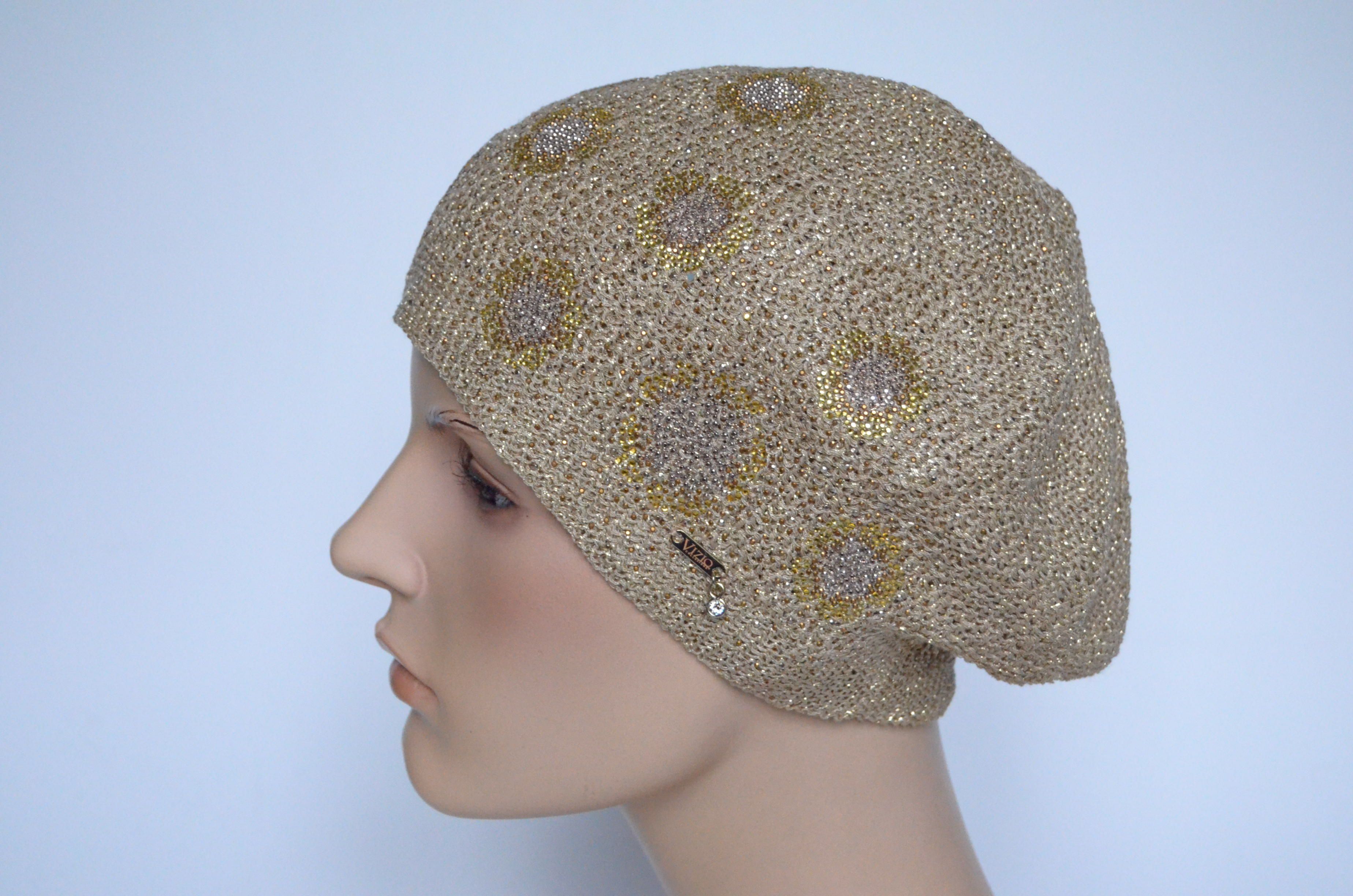 Демисезонный вязаный берет для женщин на лето - осень - весну Vizio Италия 6607 золотистого цвета с украшениями и вязаным подкладом коллекция модных итальянских женских головных уборов Визио