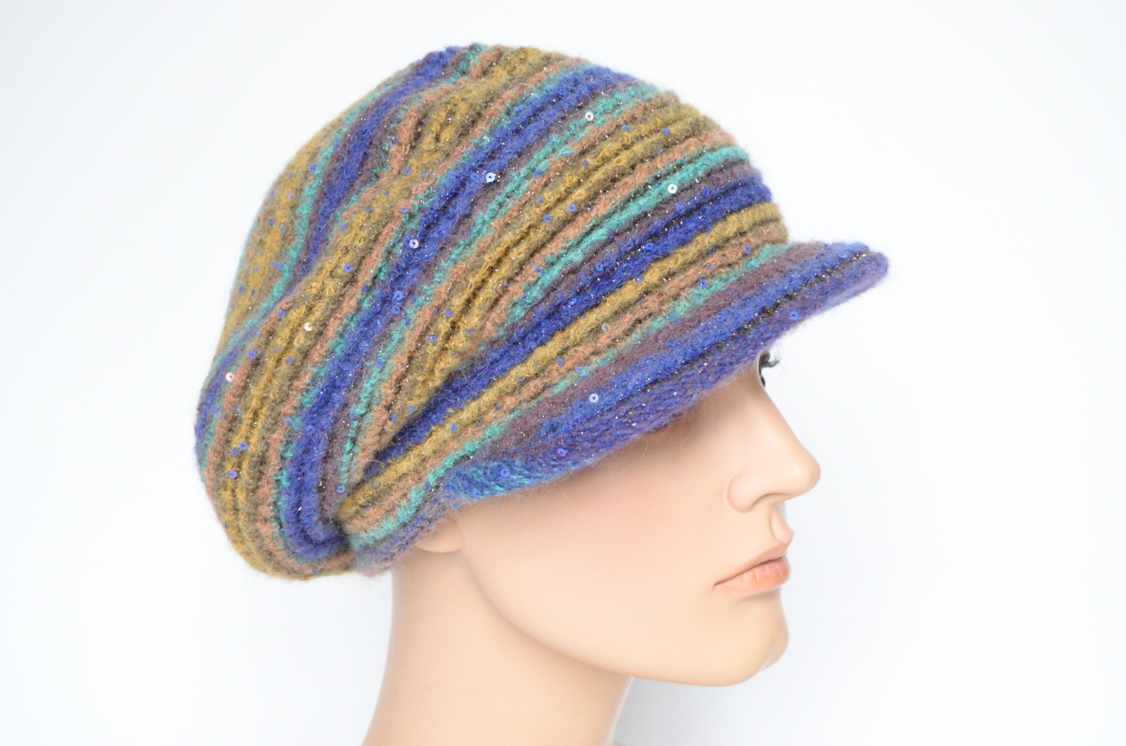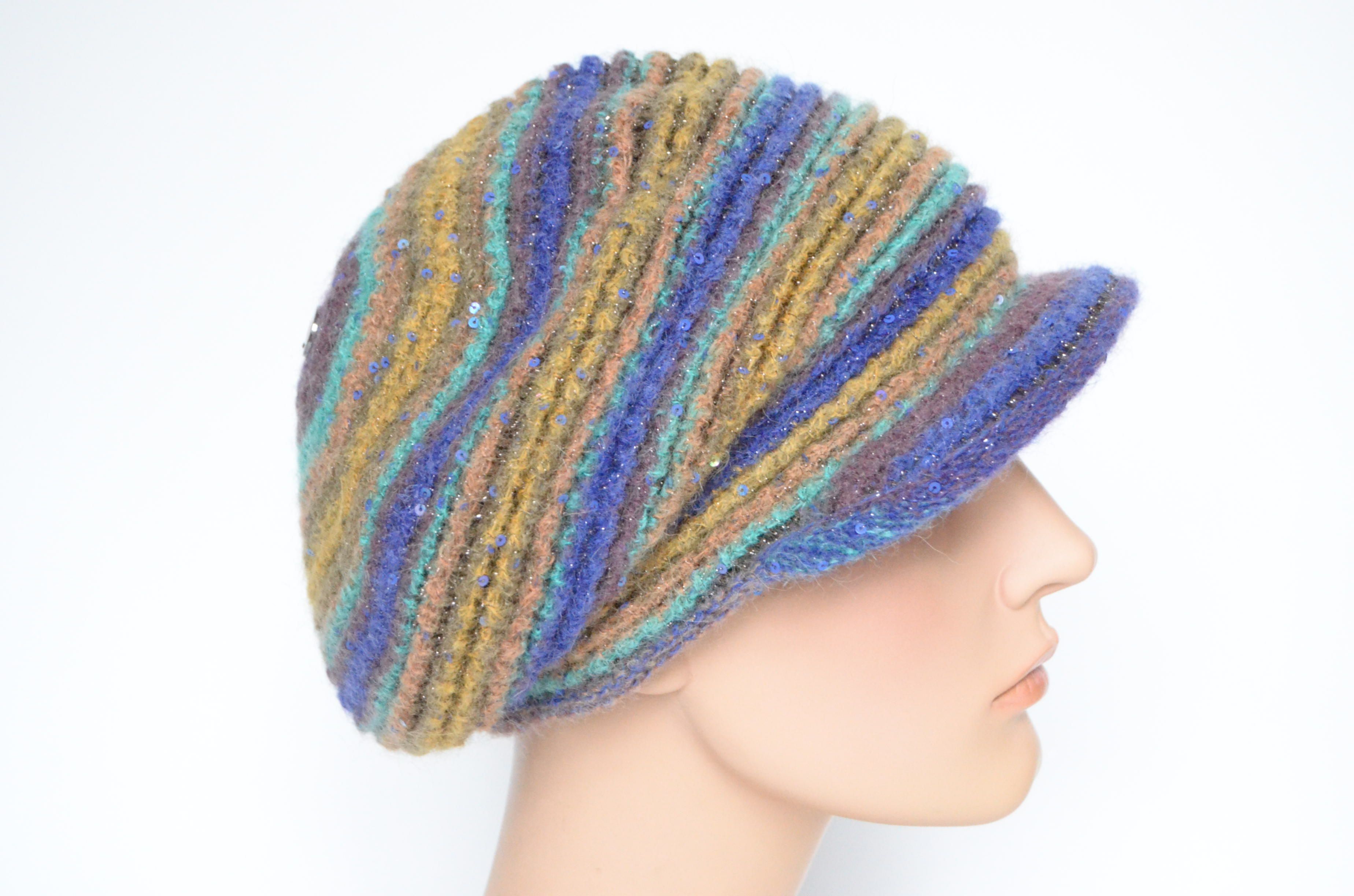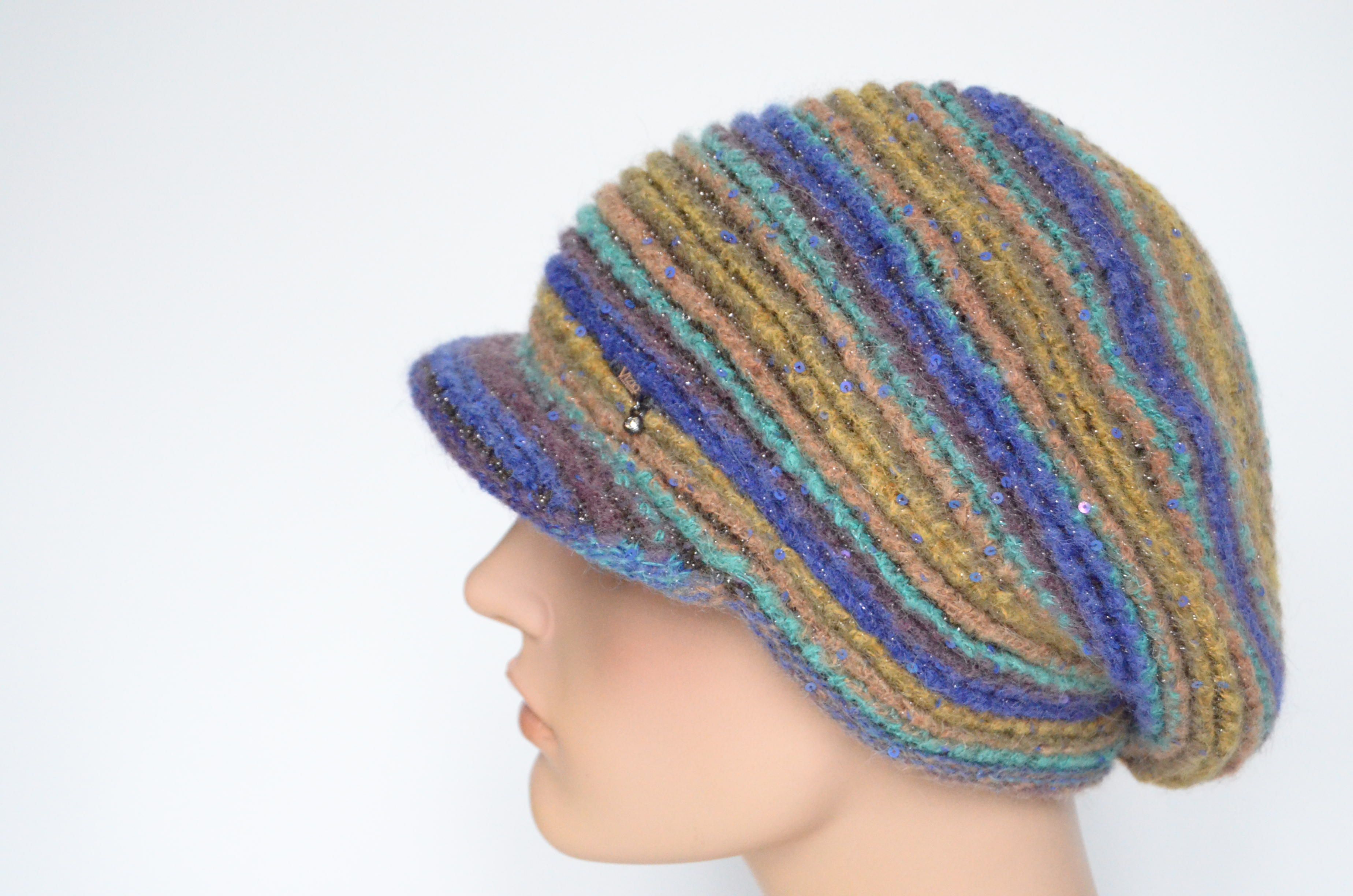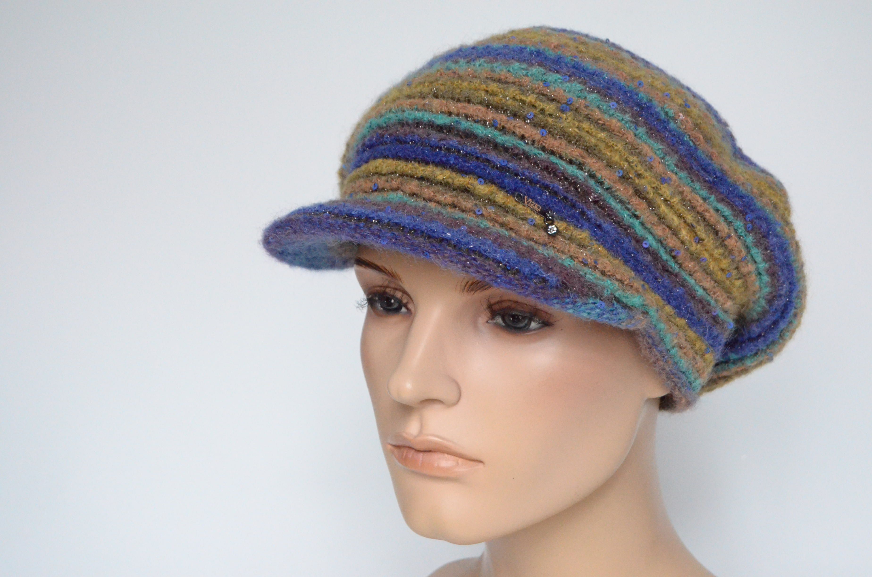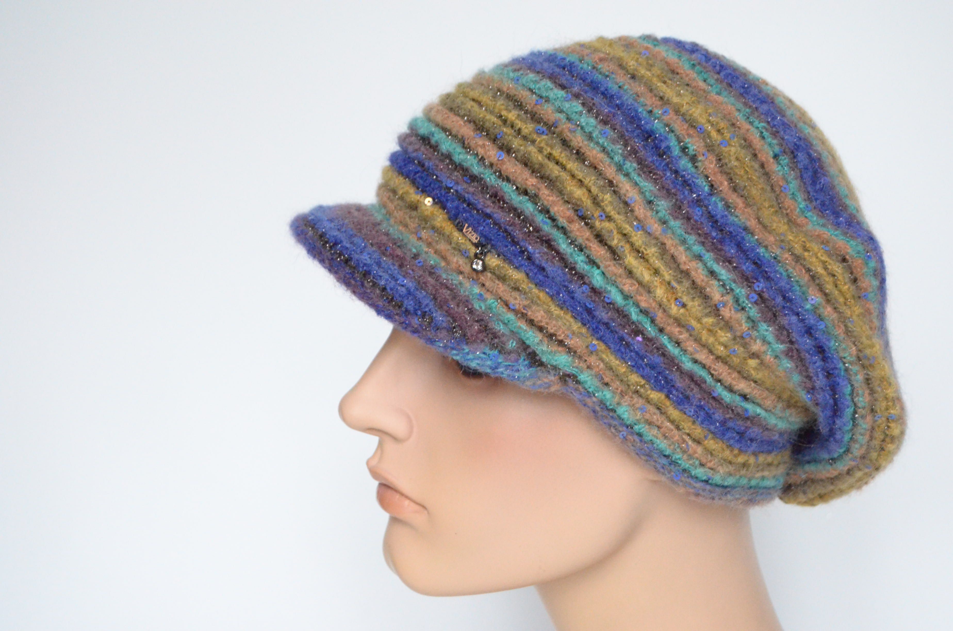 Приобрести фиолетовую разноцветную кепку вязаную зима 2022 - 2023 итальянского производителя модных женских кепок и беретов с козырьком Vizio Collezione в интернет магазине женских головных уборов с доставкой по Москве и России
