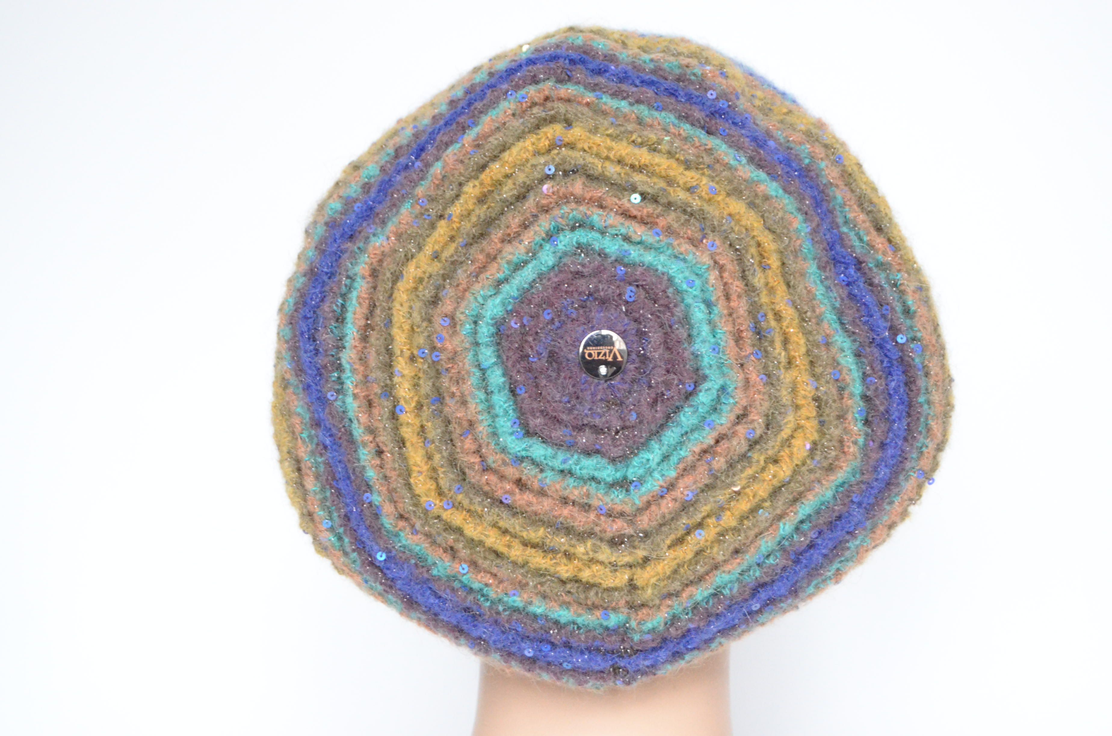 Фиолетовая кепка женская вязаная разноцветными полосами с пайетками Визио Vizio Италия 8013 коллекция итальянских головных уборов Vizio Collezione зима 2022 - 2023