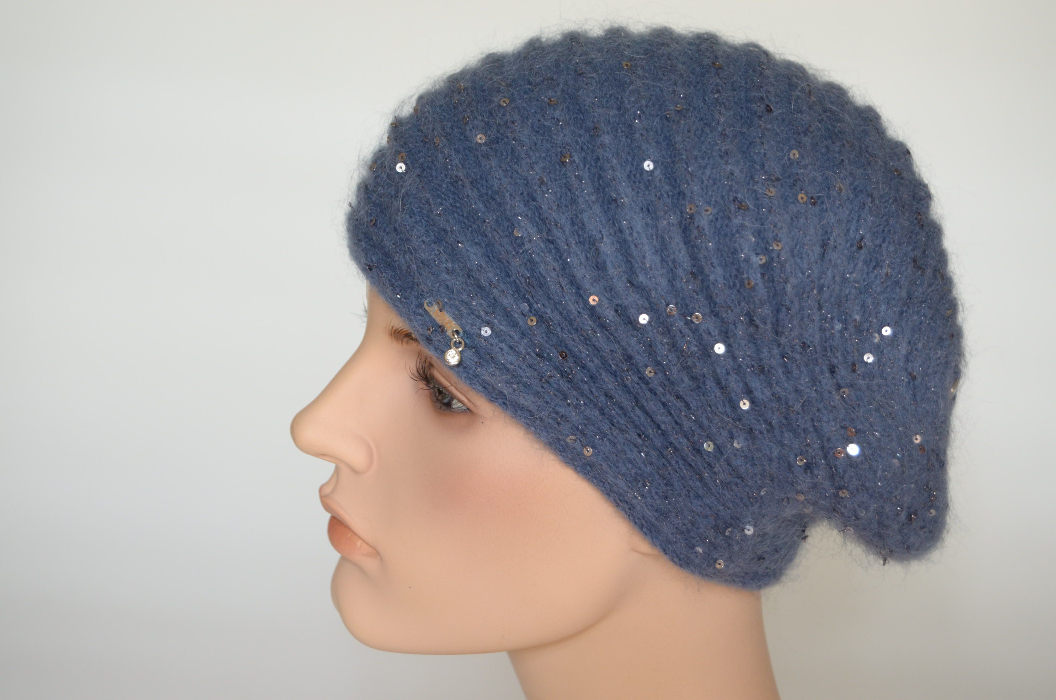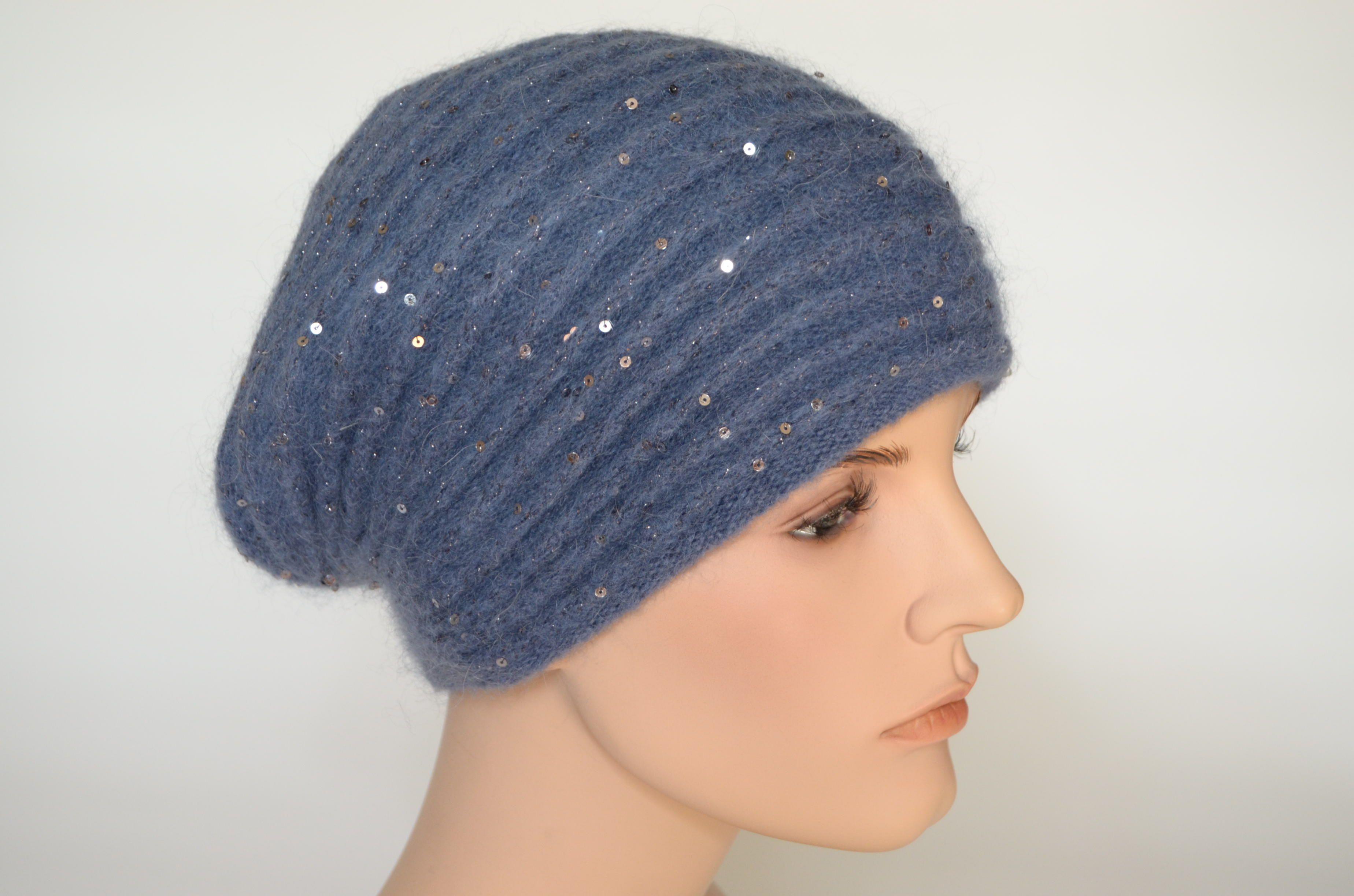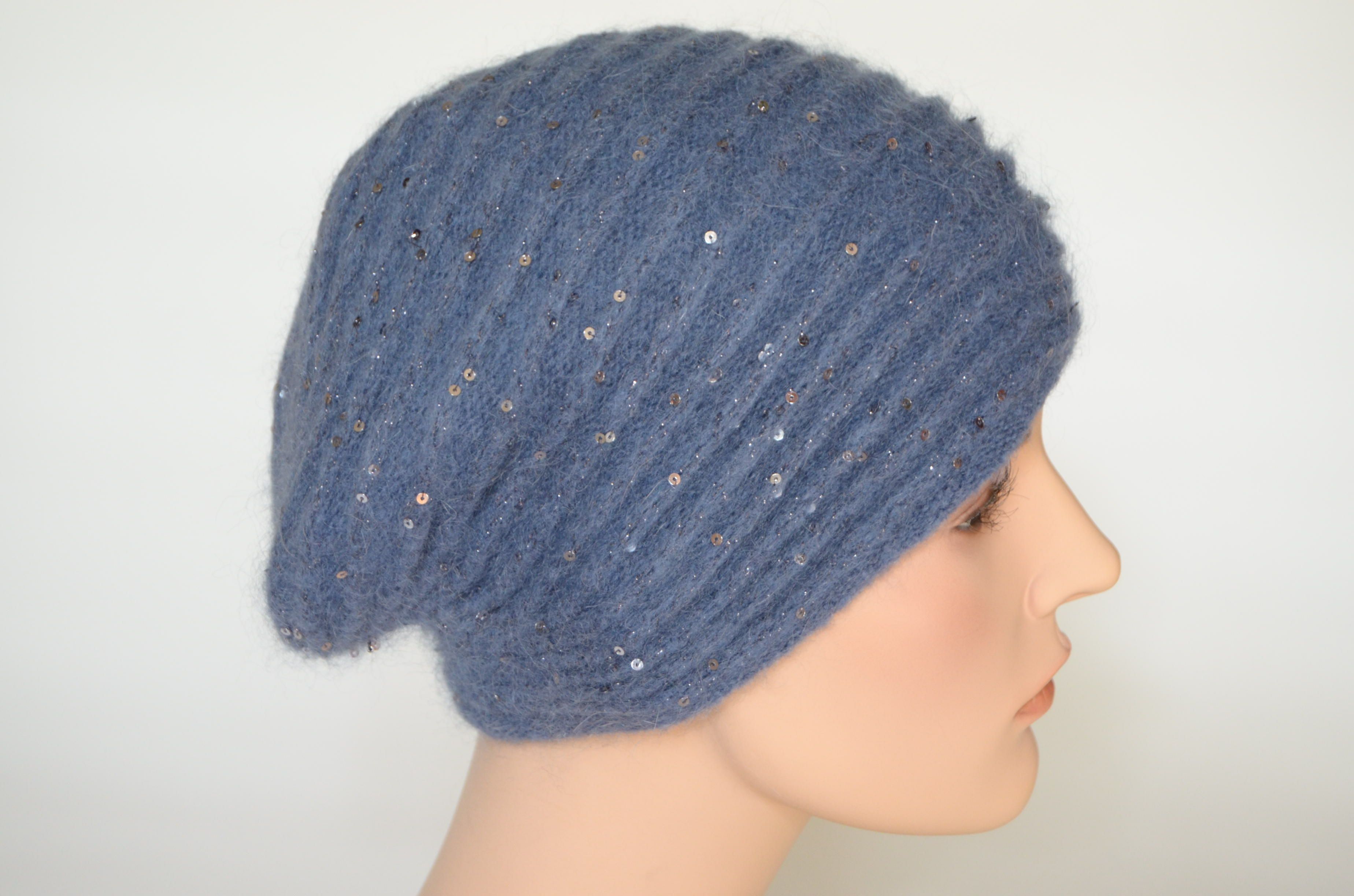 Голубой вязаный берет полосами женский зимний с пайетками и вязаным подкладом