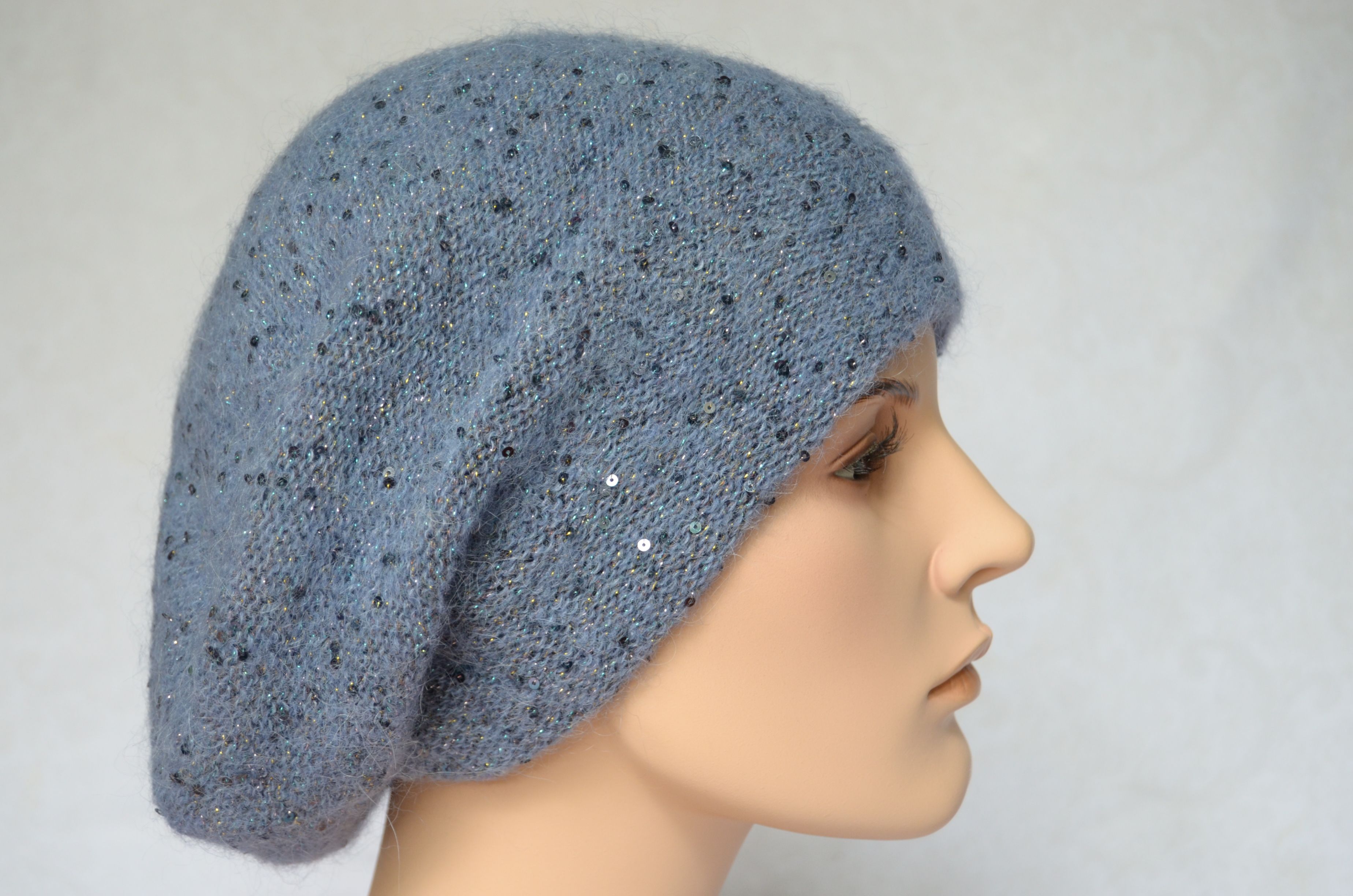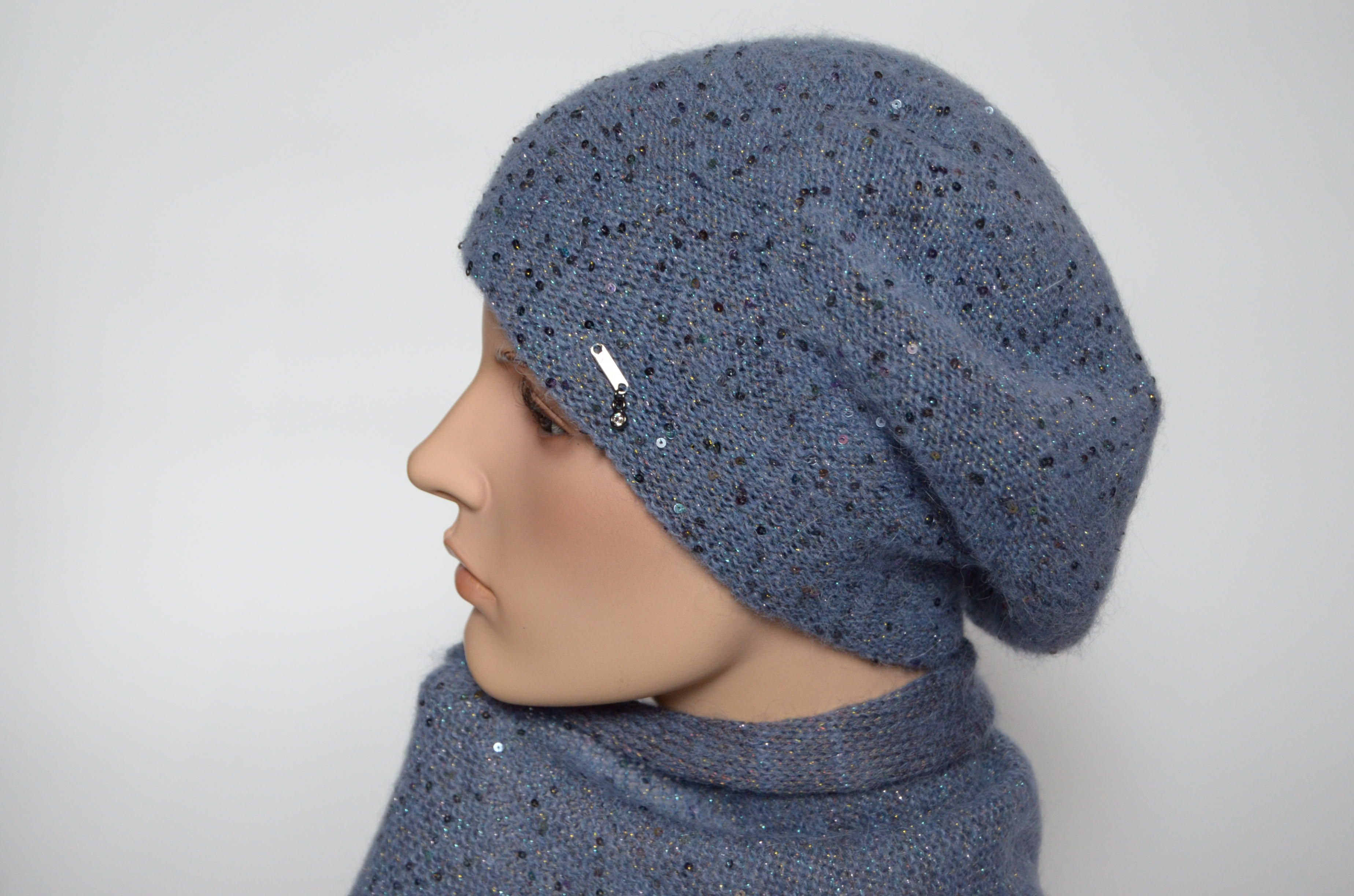 Приобрести зимний вязаный берет голубого цвета с пайетками зима 2021 - 2022 Vizio Италия в интернет магазине женских шапок и беретов Вицио с доставкой по Москве и России