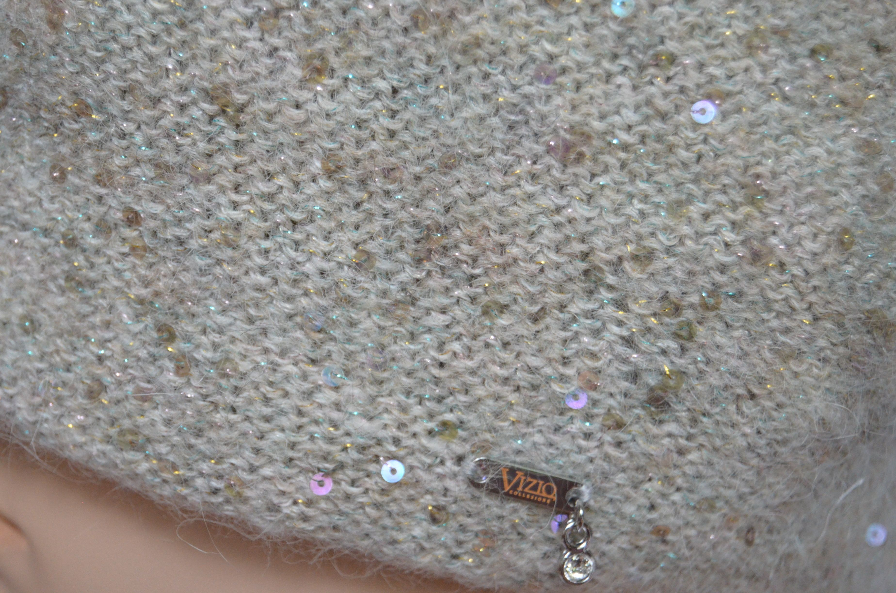 Вязаный берет бежевого цвета с пайетками для женщин Vizio Италия 6917 новая коллеция итальянских женских головных уборов Визио осень - зима 2021 - 2022