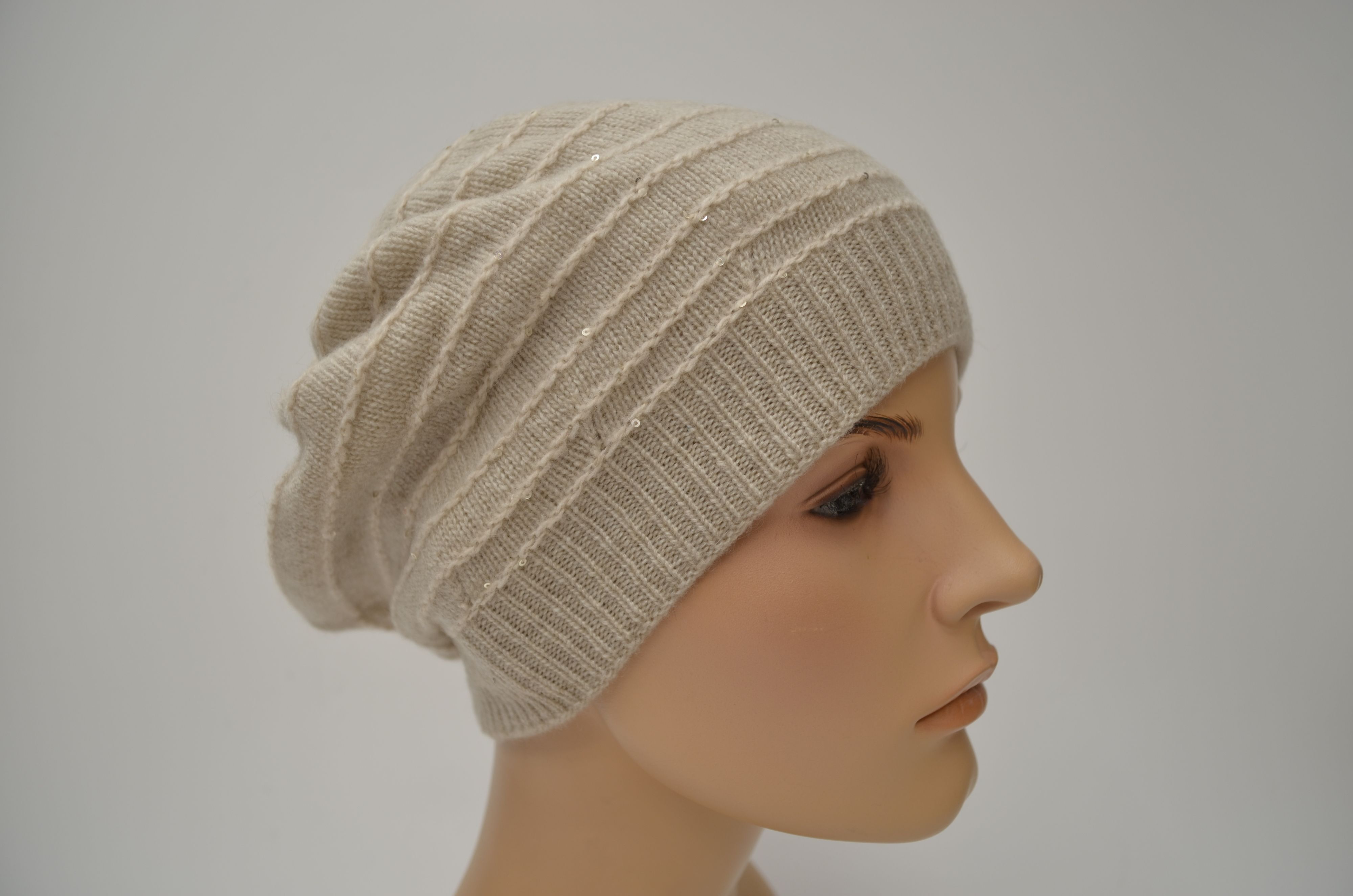 Зимний берет из кашемира бежевый женский с вязаным кашемировым подкладом