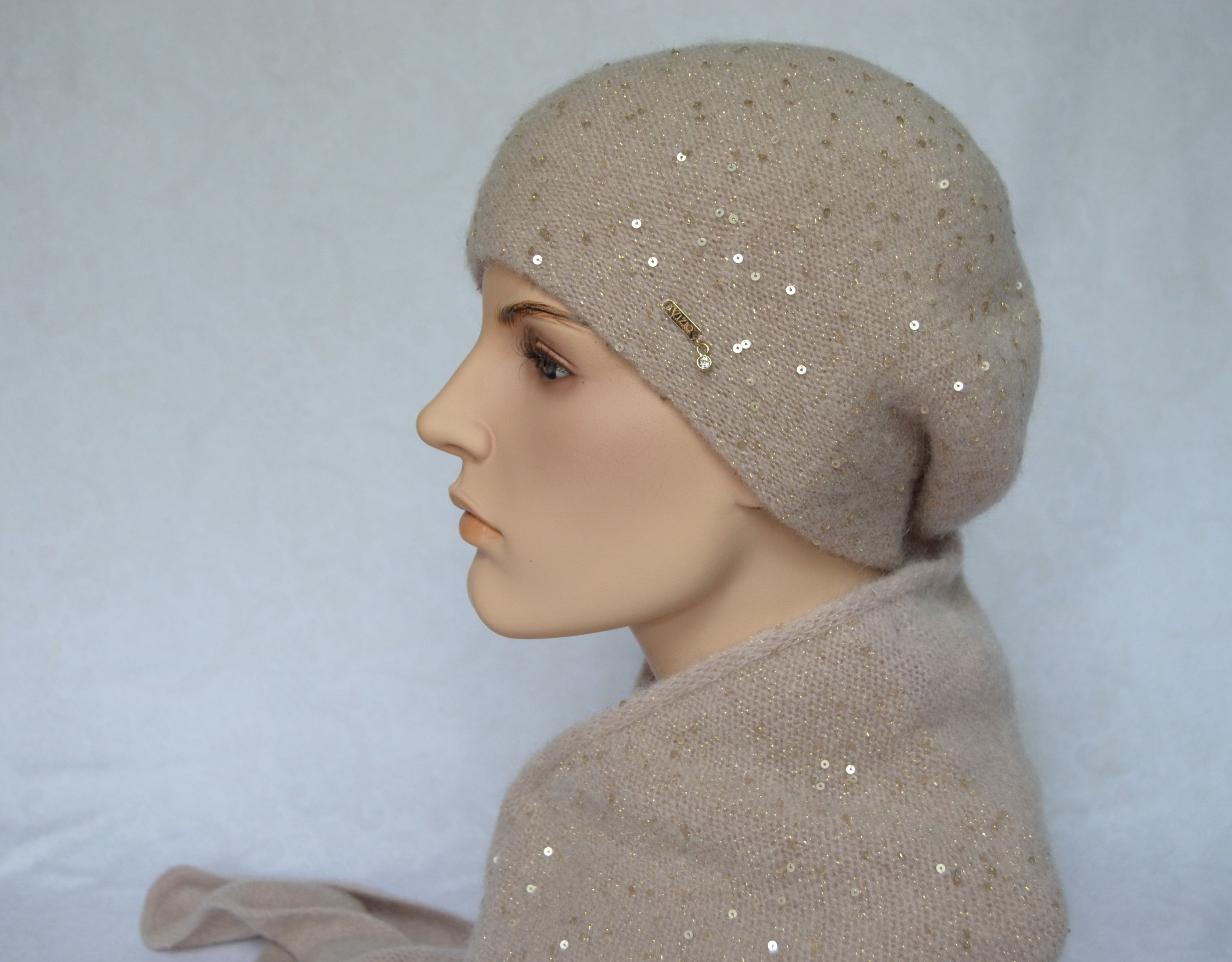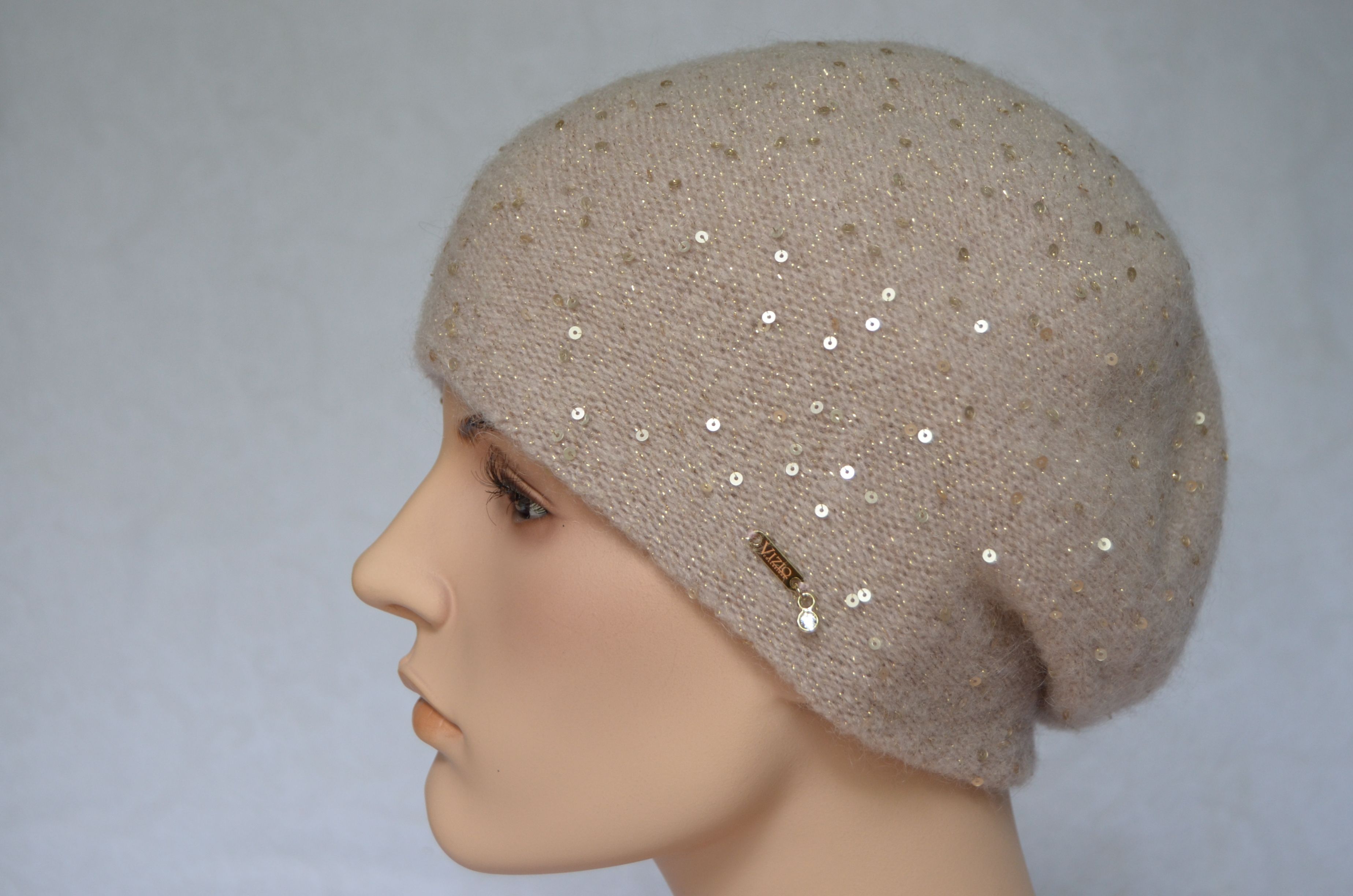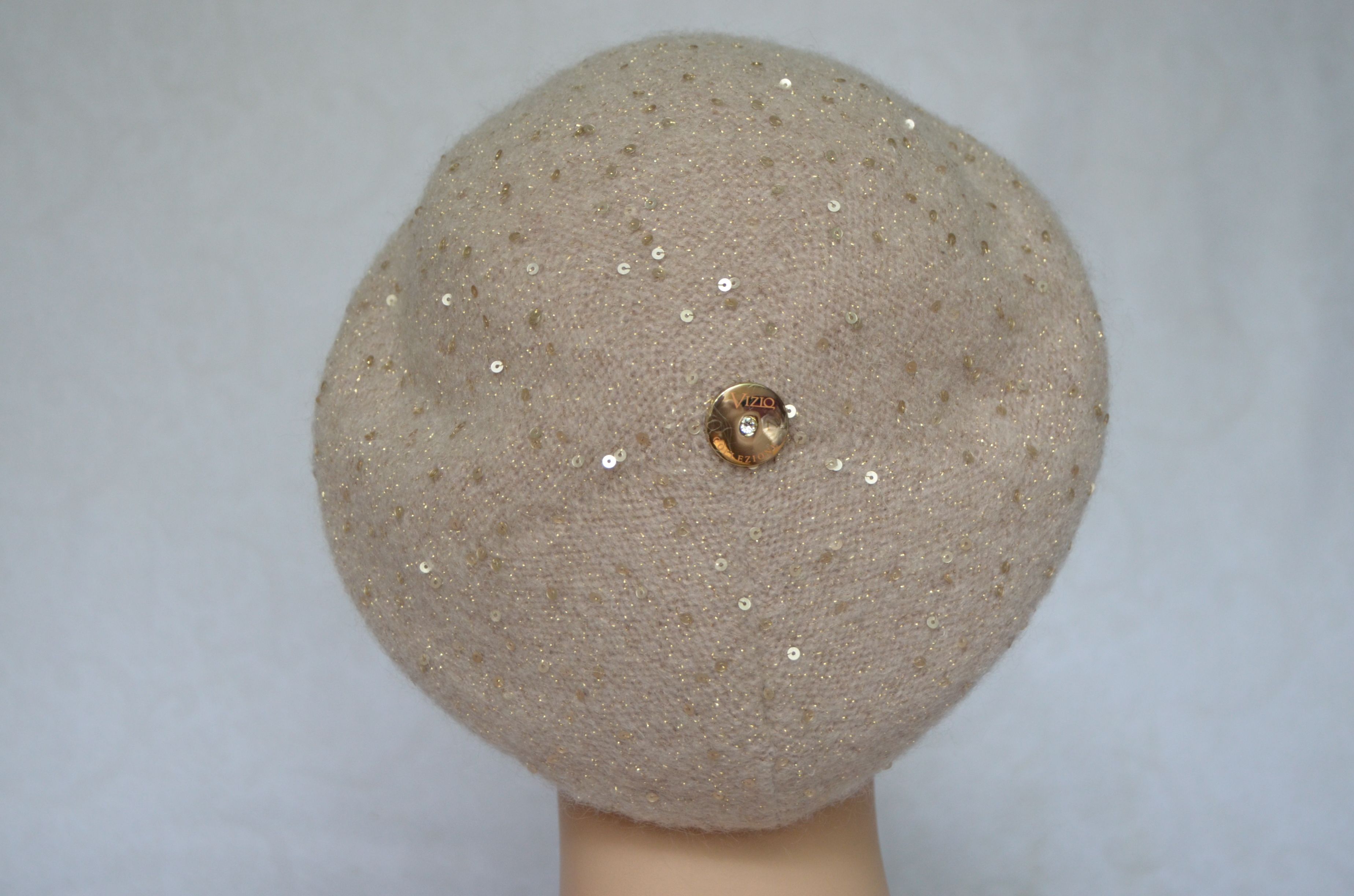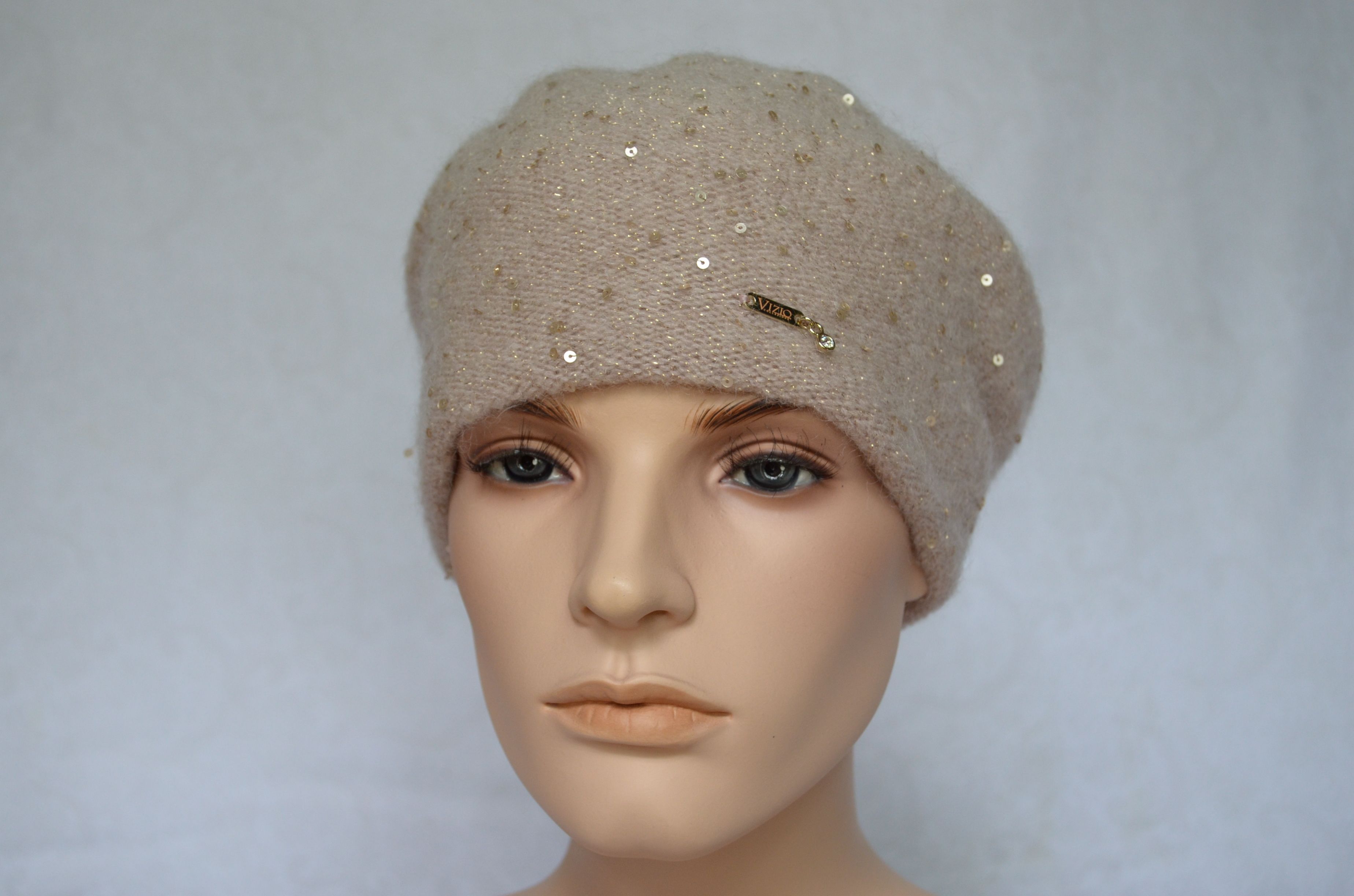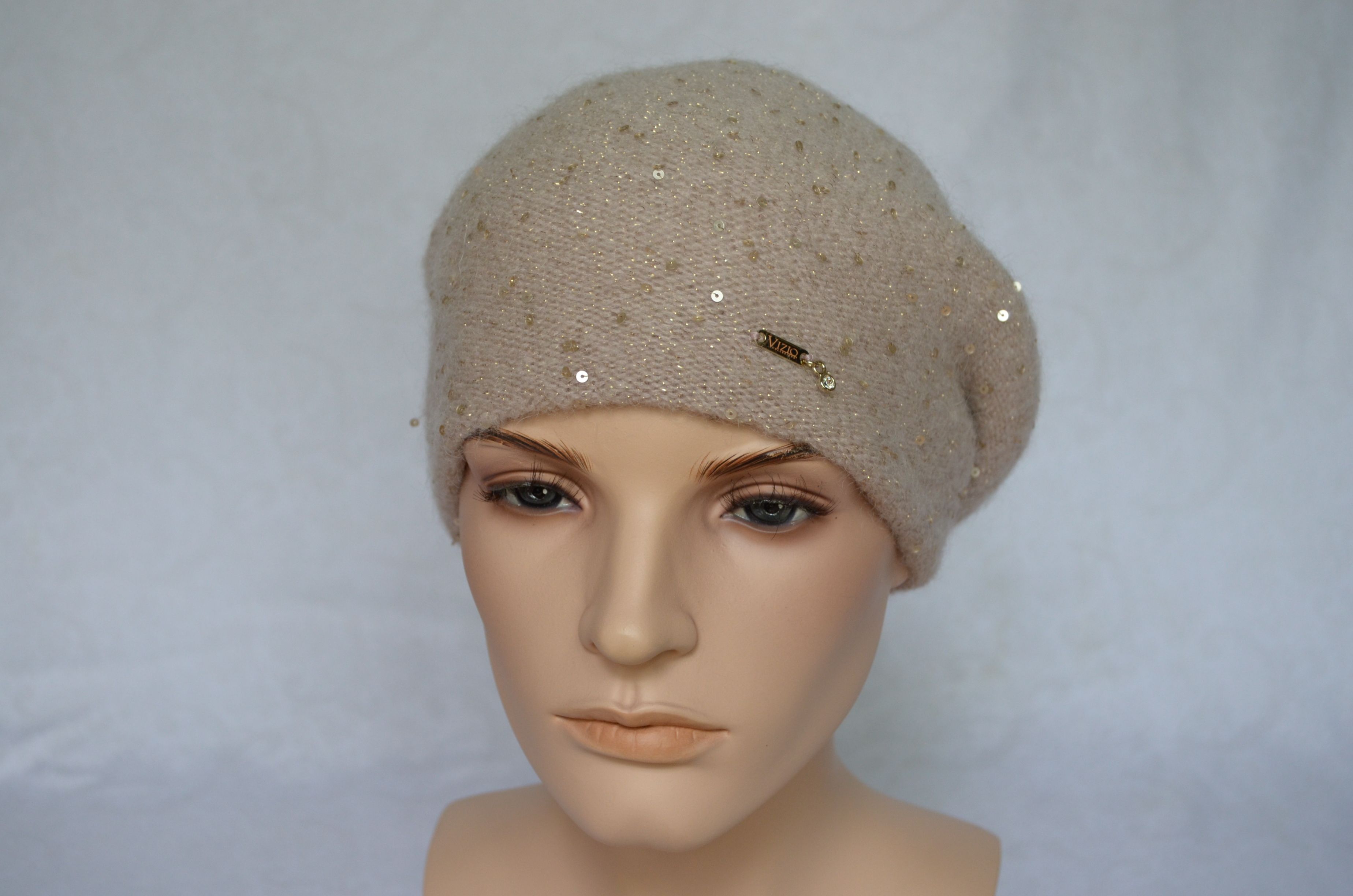 Кремовый классический берет вязаный с пайетками Vizio Италия 6943 купить из новой коллекции итальянских беретов и шапок Визио 2021- 2022