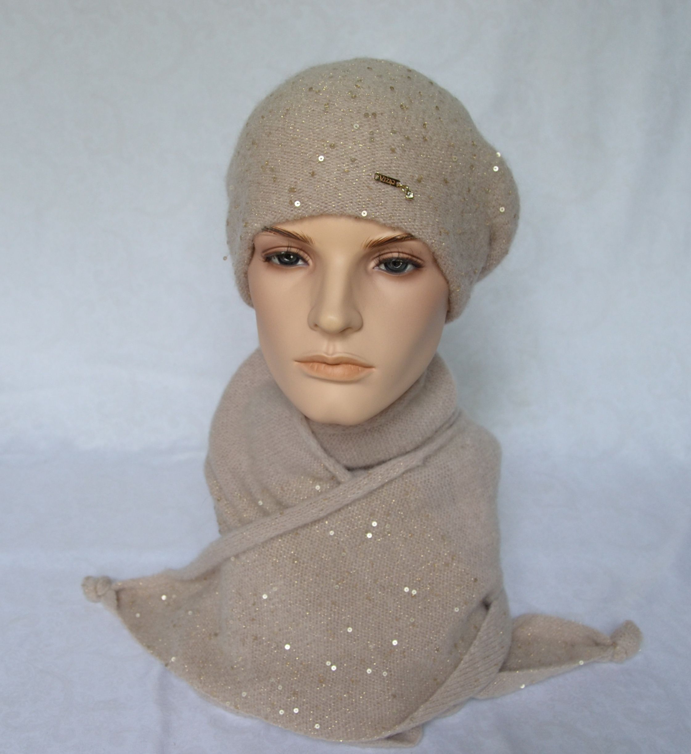 Кремовый берет для женщин вязаный Vizio Италия 6943 новая коллекция классических беретов и шапок с пайетками Визио зима 2022