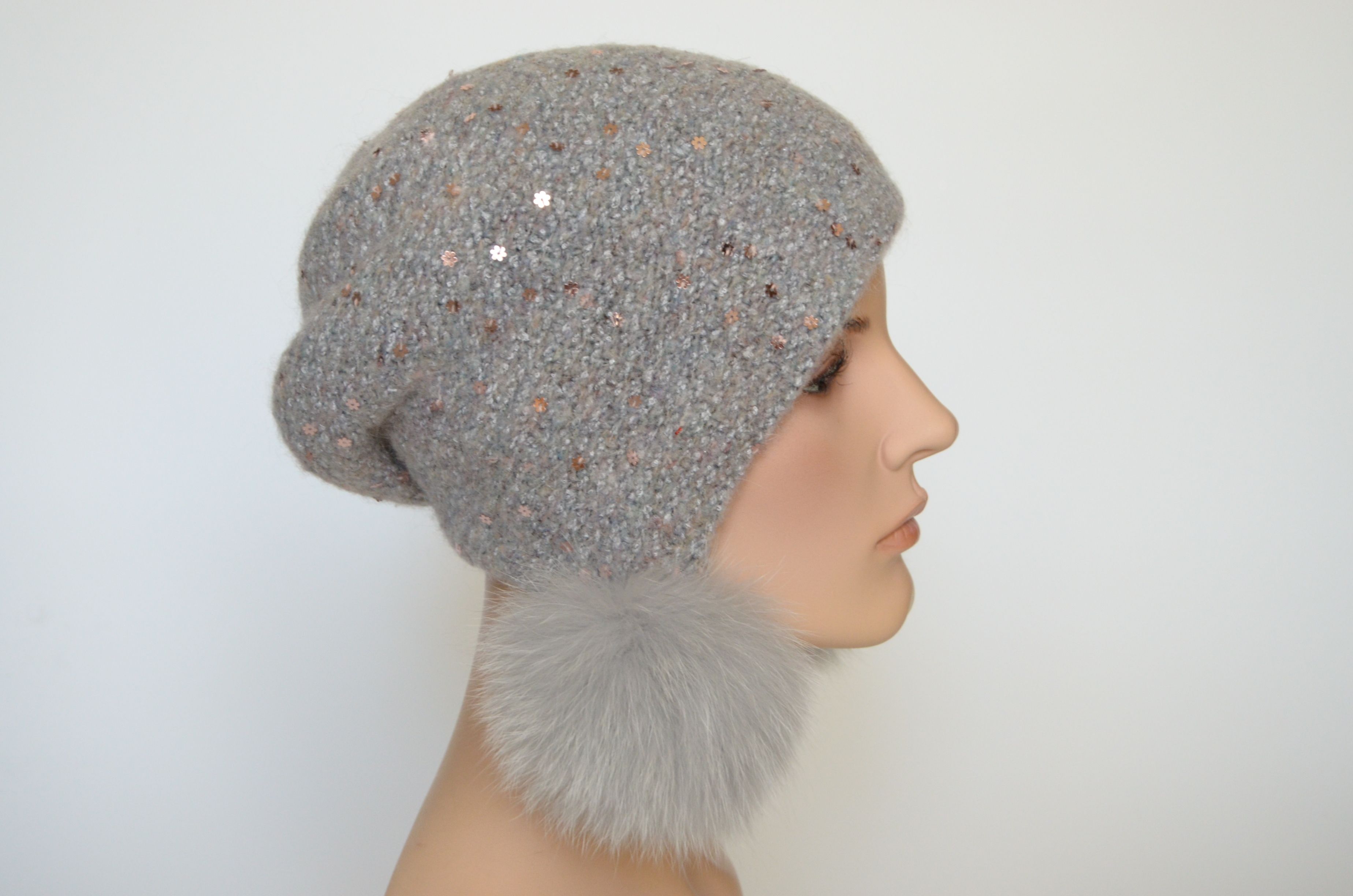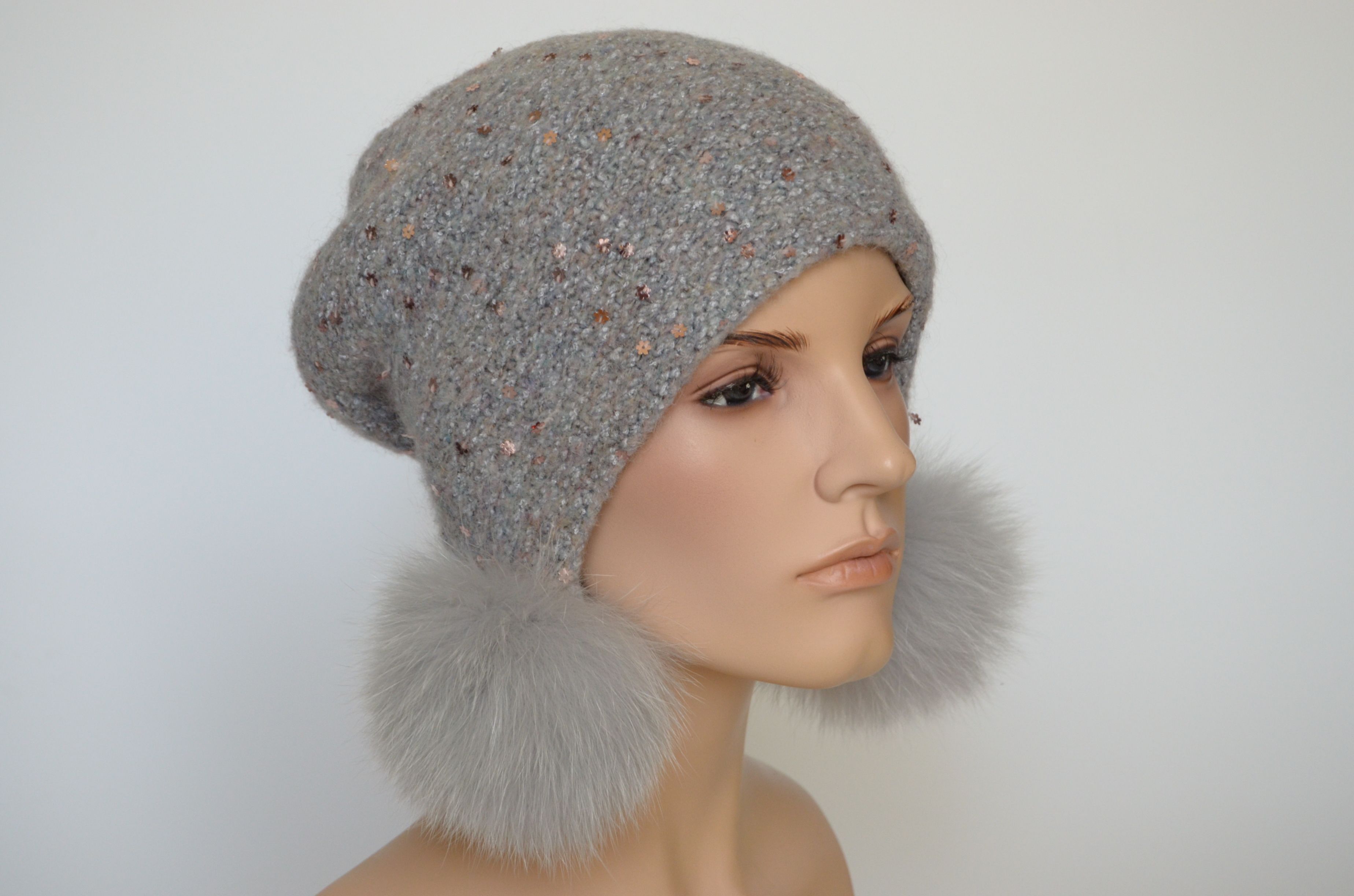 Лиловая шапка ушанка вязаная меланжевая с пайетками и отстегивающимися помпонами зима Vizio Италия 6442 коллекция вязаных шапок ушанок Италии для женщин