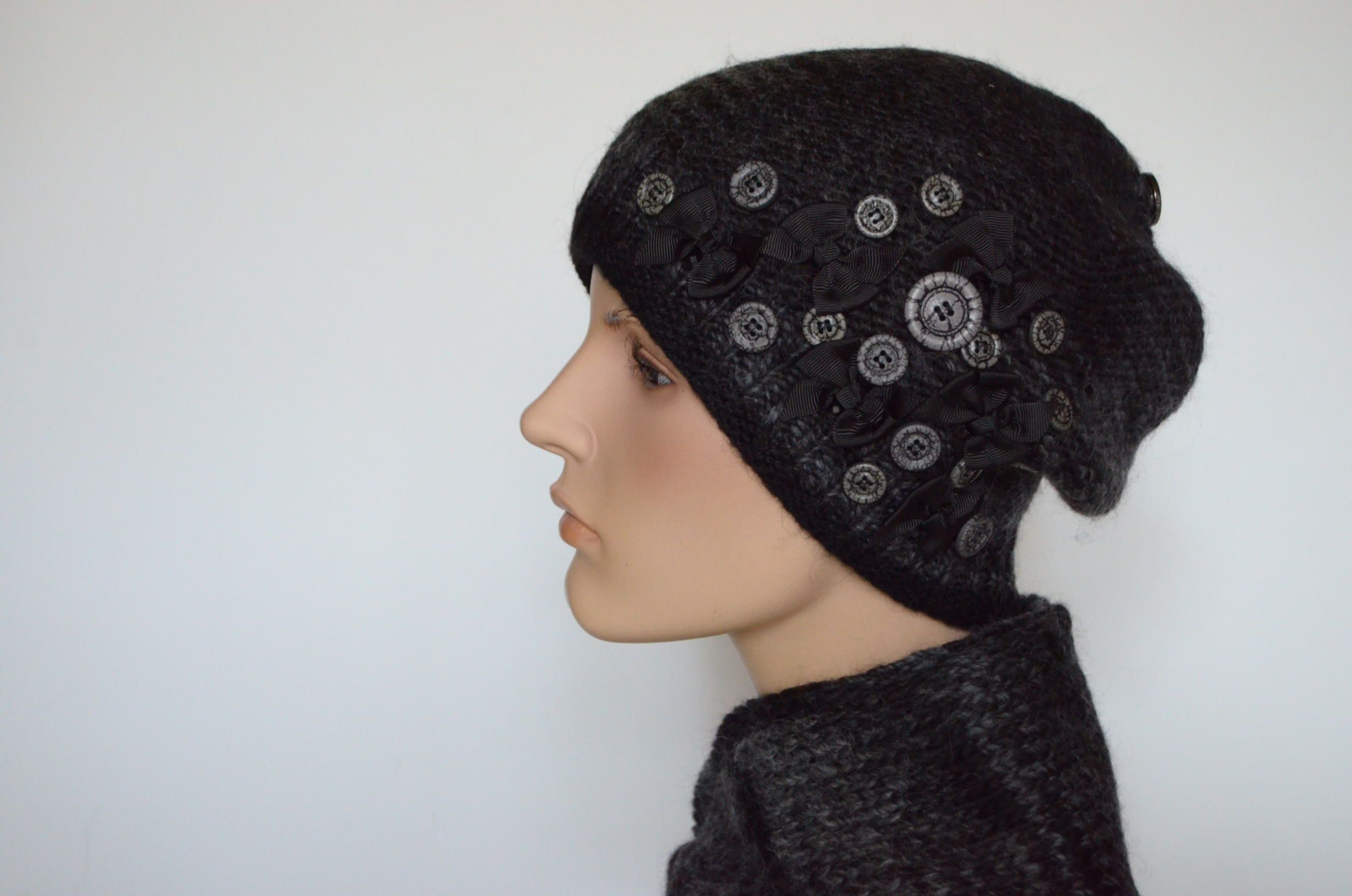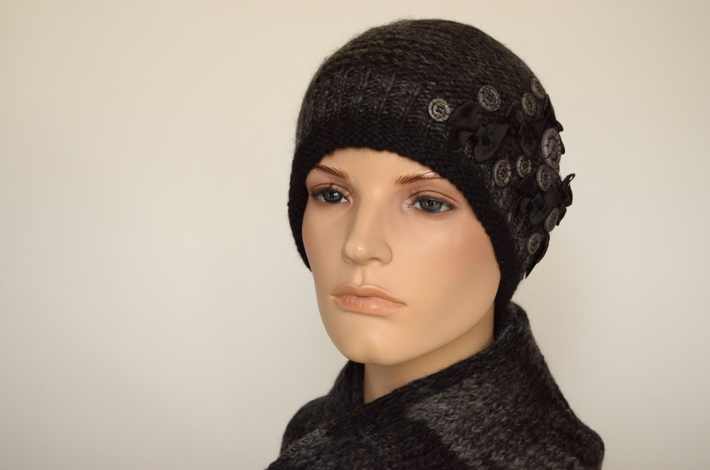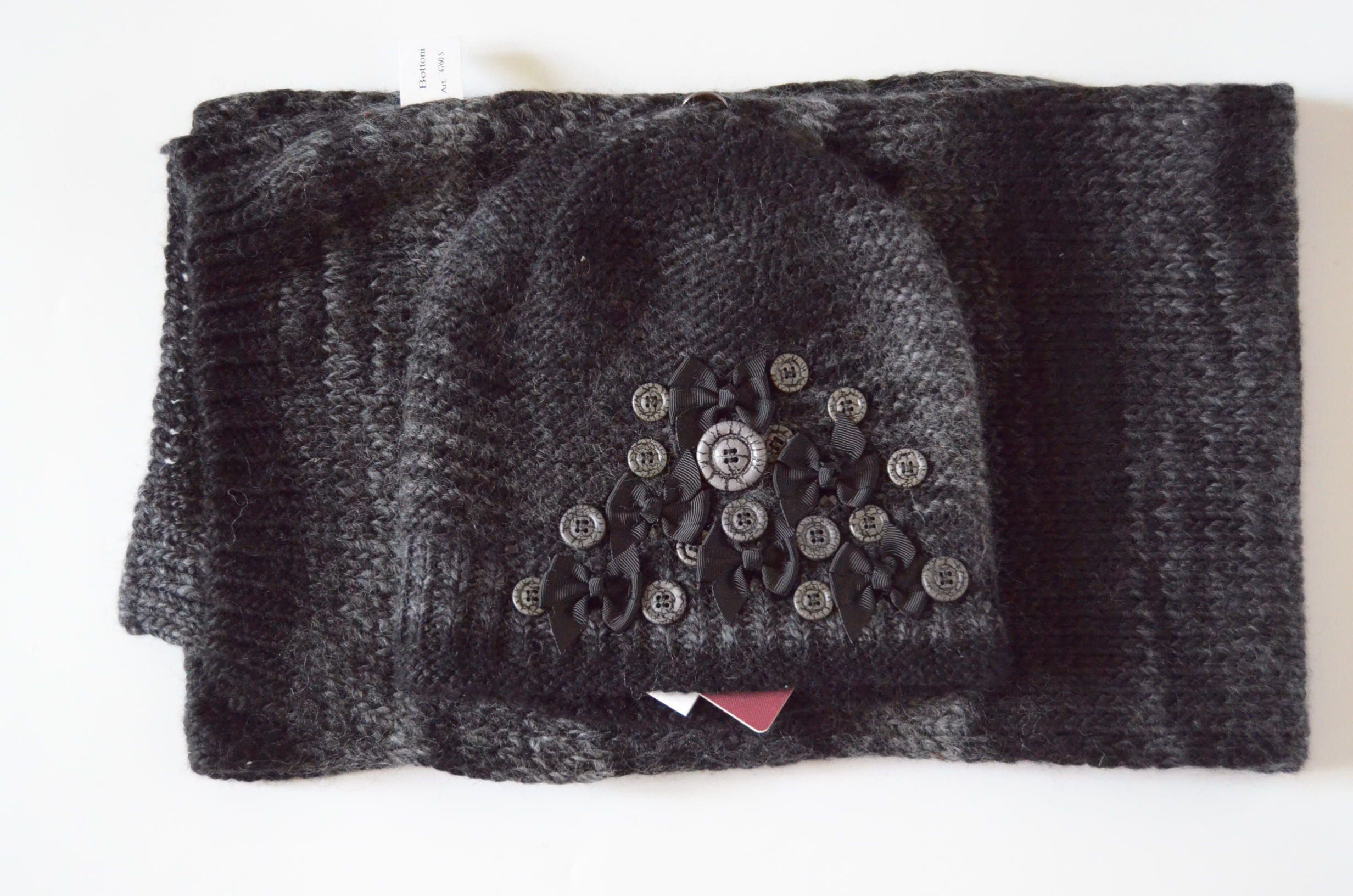 Меланжевая шапка с пуговицами и шарф черный комплект вязаный для женщин