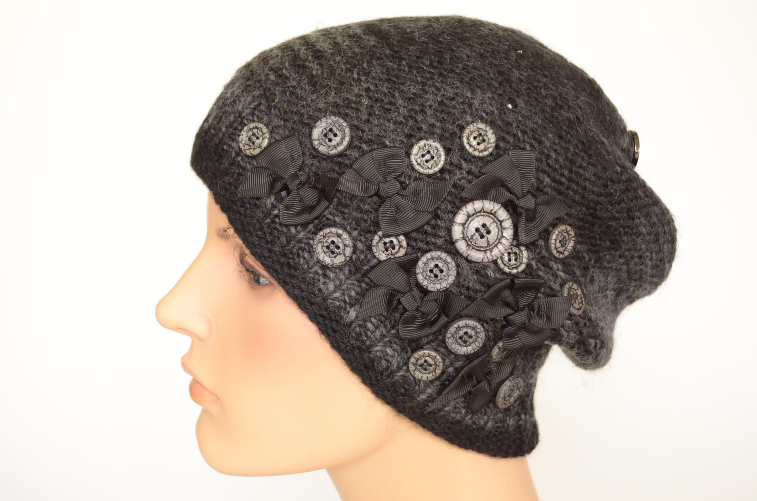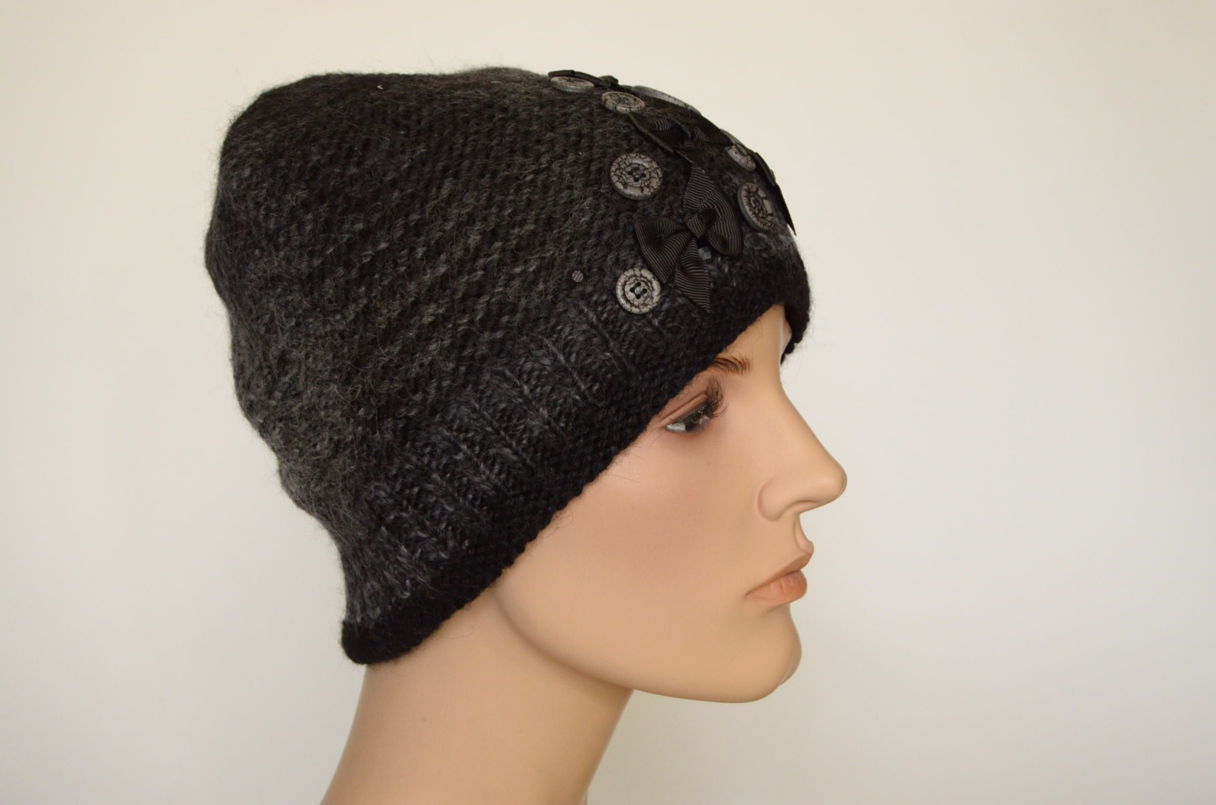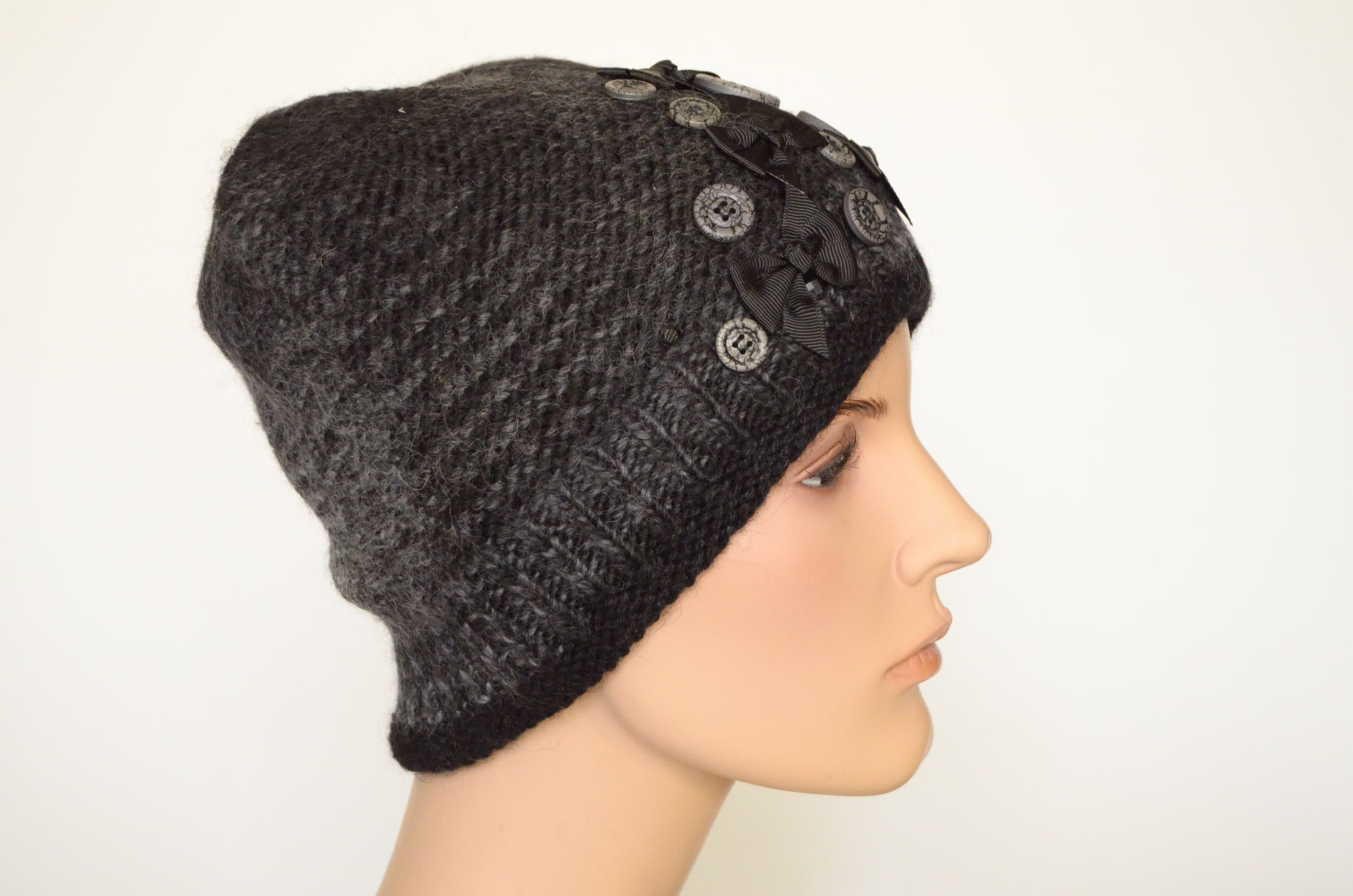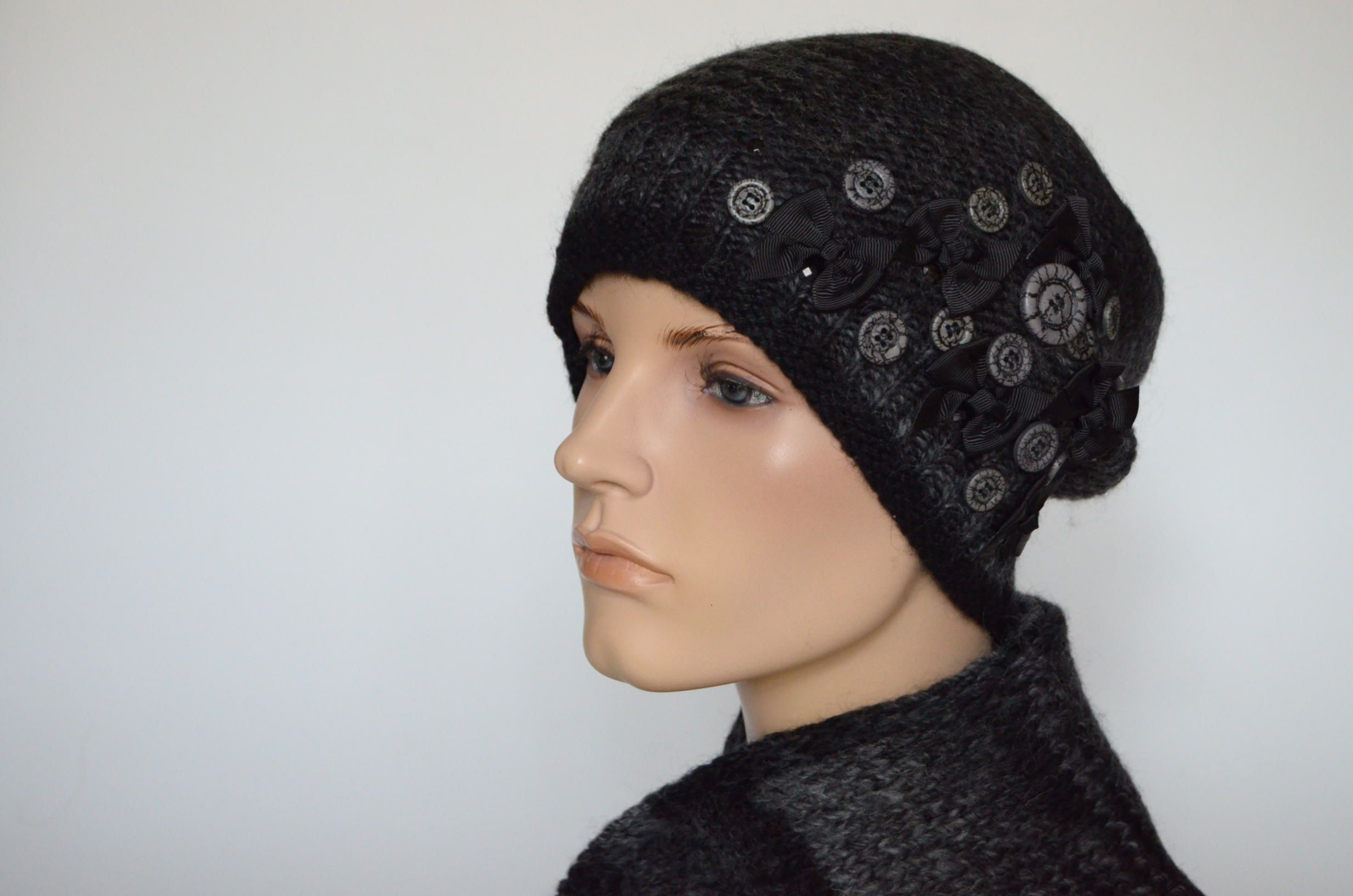 Меланжевая шапка с пуговицами и шарф черный комплект вязаный для женщин