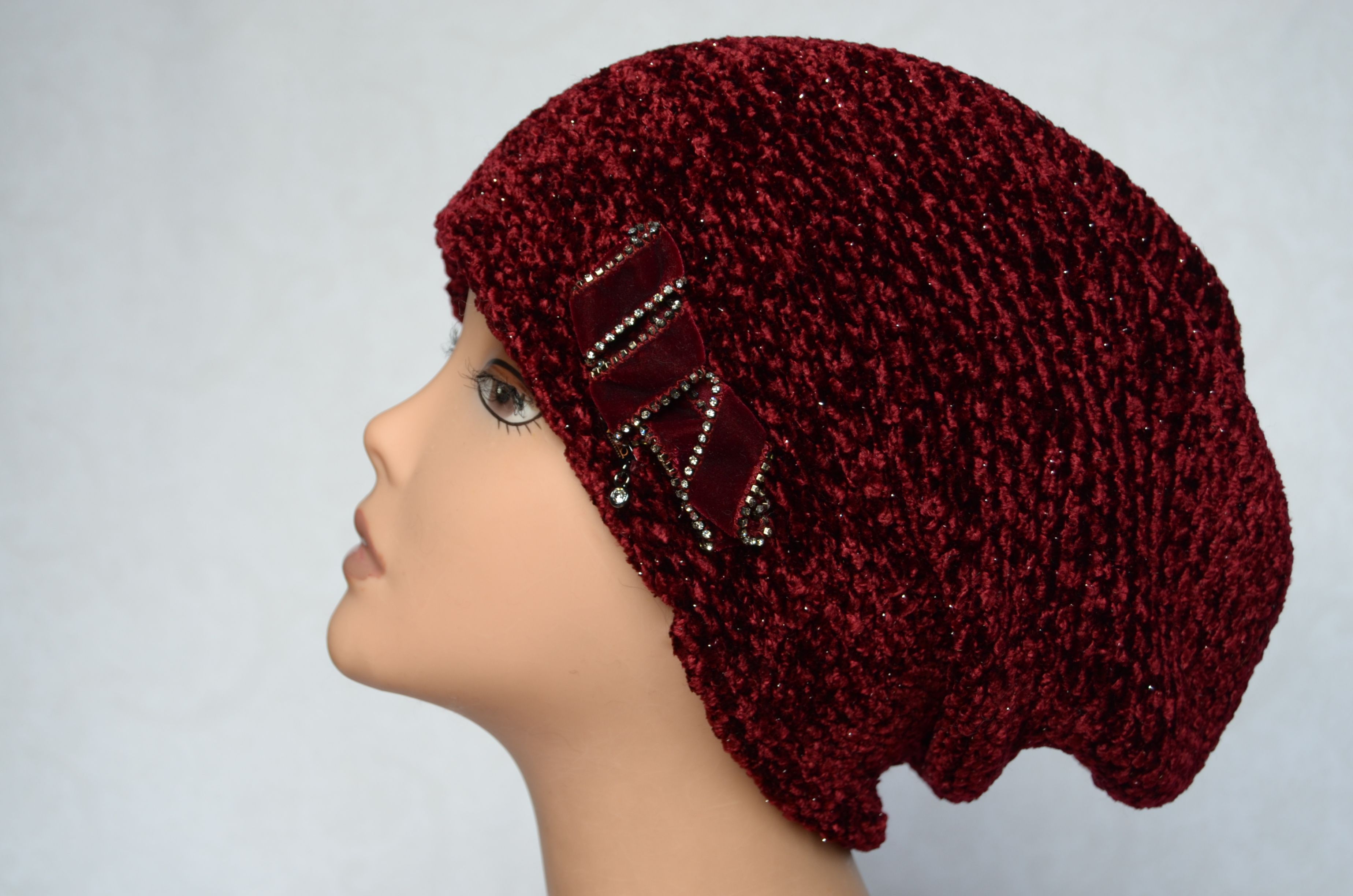 Вязаный мягкий зимний берет из вискозы и шерсти Vizio Италия 6515 бордового цвета. Женский берет с вязаной подкладкой