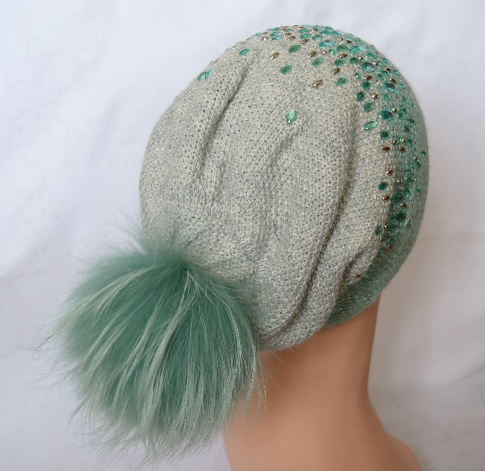 Берет с камнями и помпоном Vizio Италия 5561 вязаный берет мятного цвета с помпоном из коллекции вязаных беретов 2016 - 2017 от производителя женских вязаных беретов и шапок с помпонами Vizio Collezione