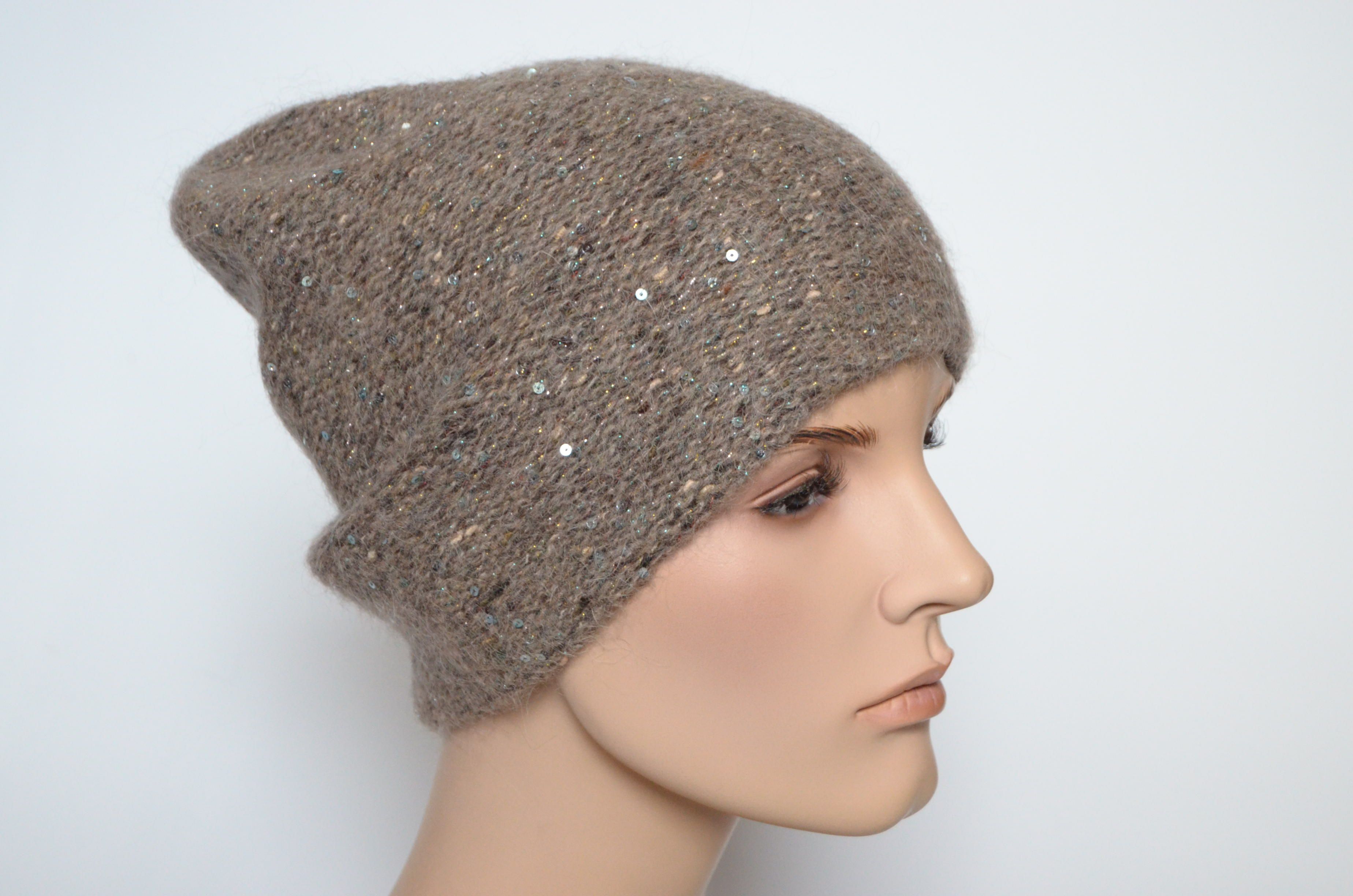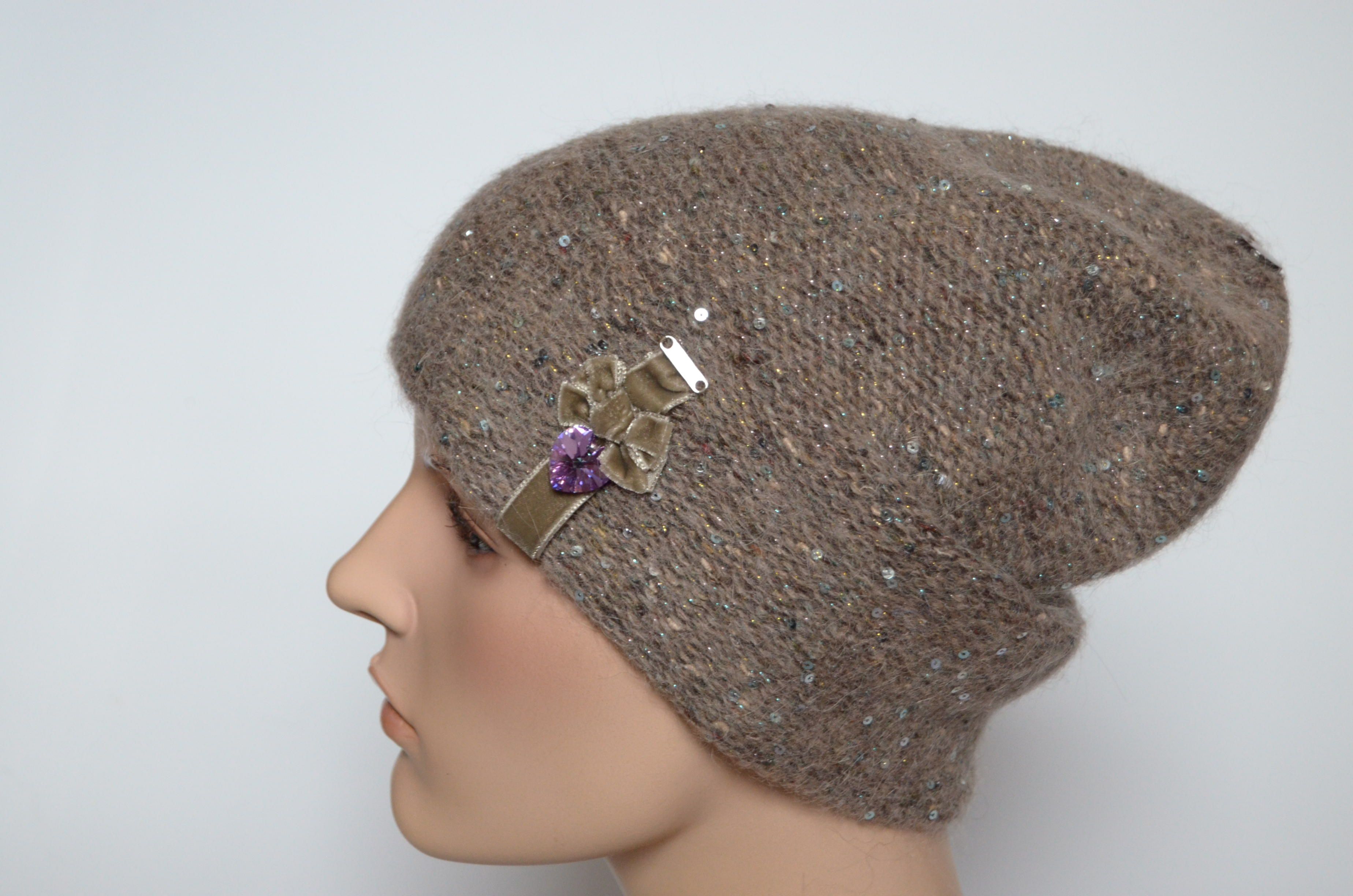 Вязаная меланжевая шапка орехового цвета с украшениями для женщин зима 2021 - 2022 Vizio Италия 6926 купить в магазине итальянских женских шапок и беретов в Москве и с доставкой по России