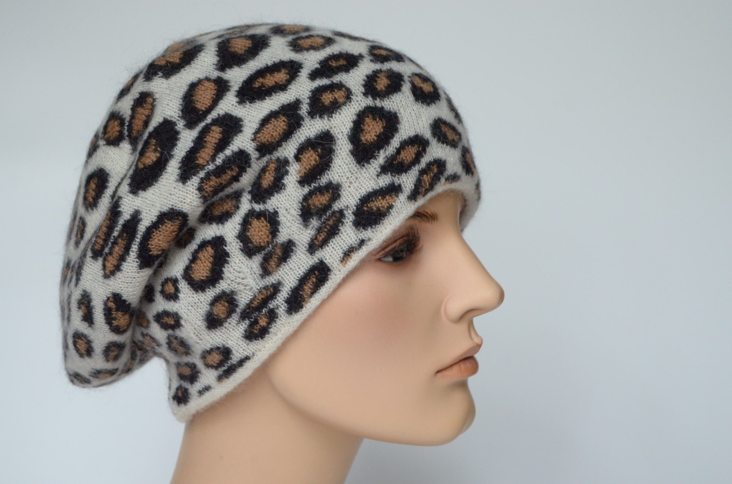 Вязаный пятнистый женский берет зимний головной убор в модной леопардовой расцветке коллекция беретов и шапок 2024