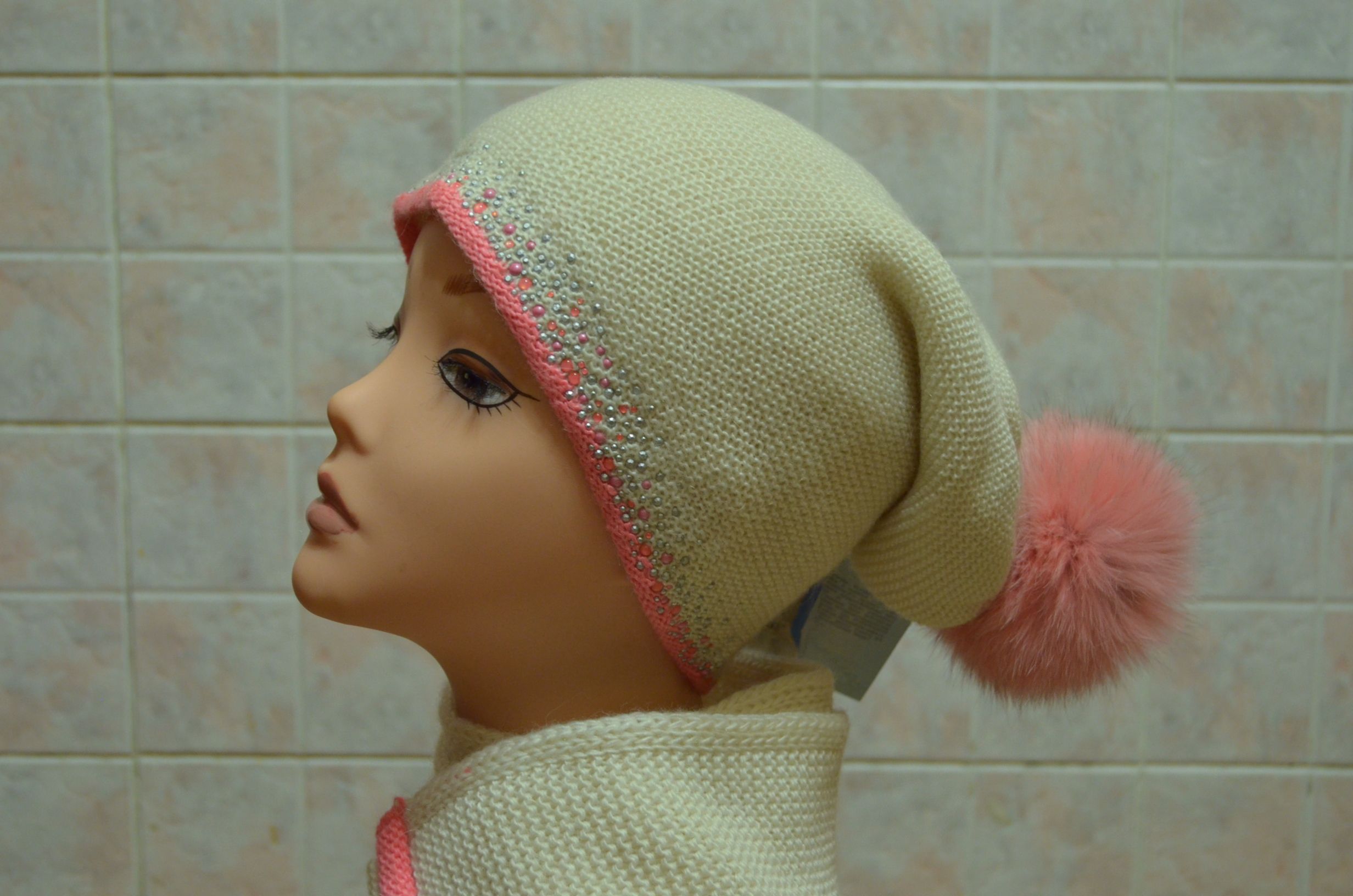 Белая шапка с оранжевым помпоном и шарф Vizio Визио Италия 4752 купить в интернет магазине вязаных итальянских шапок Vizio Collezione