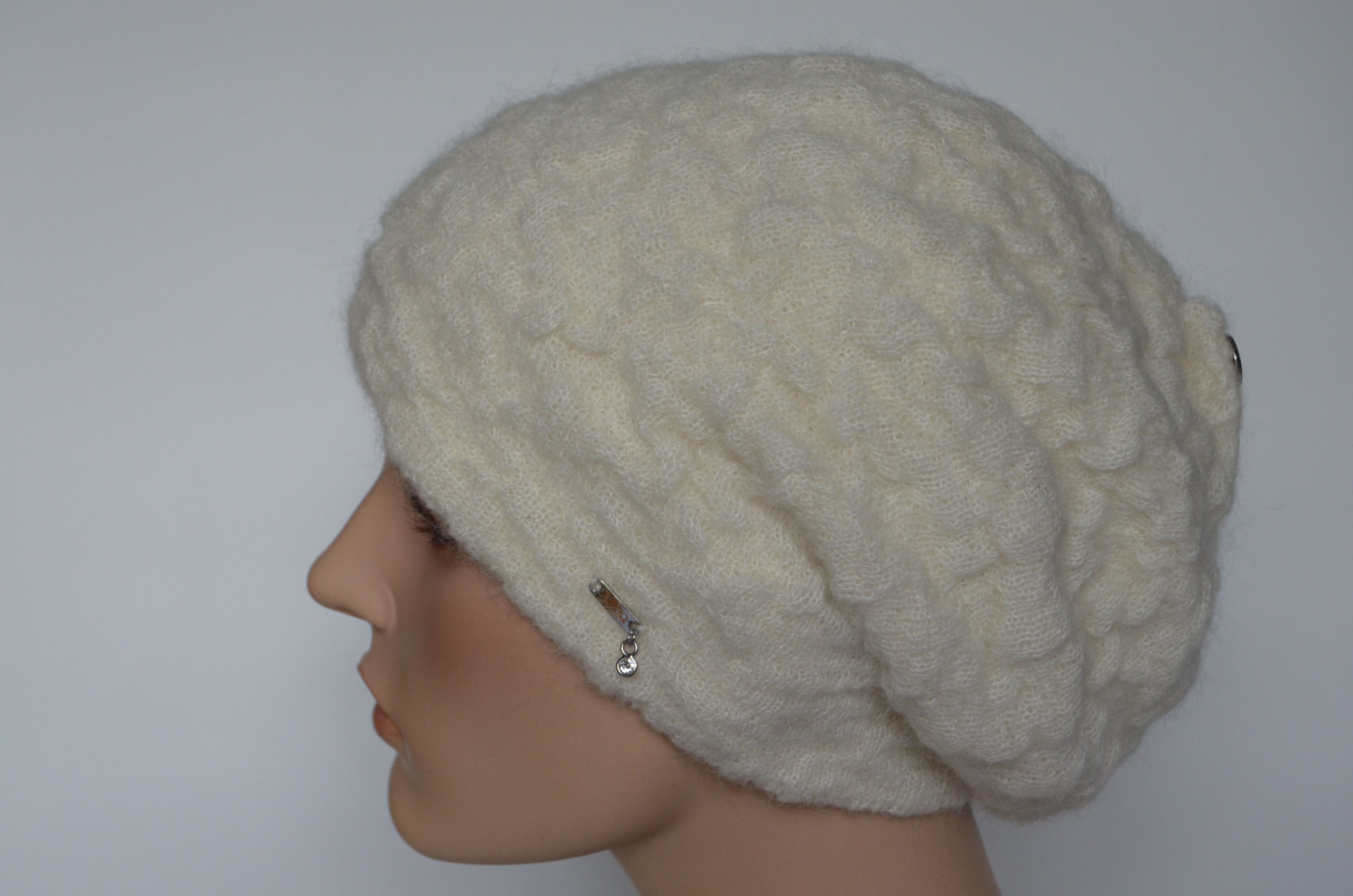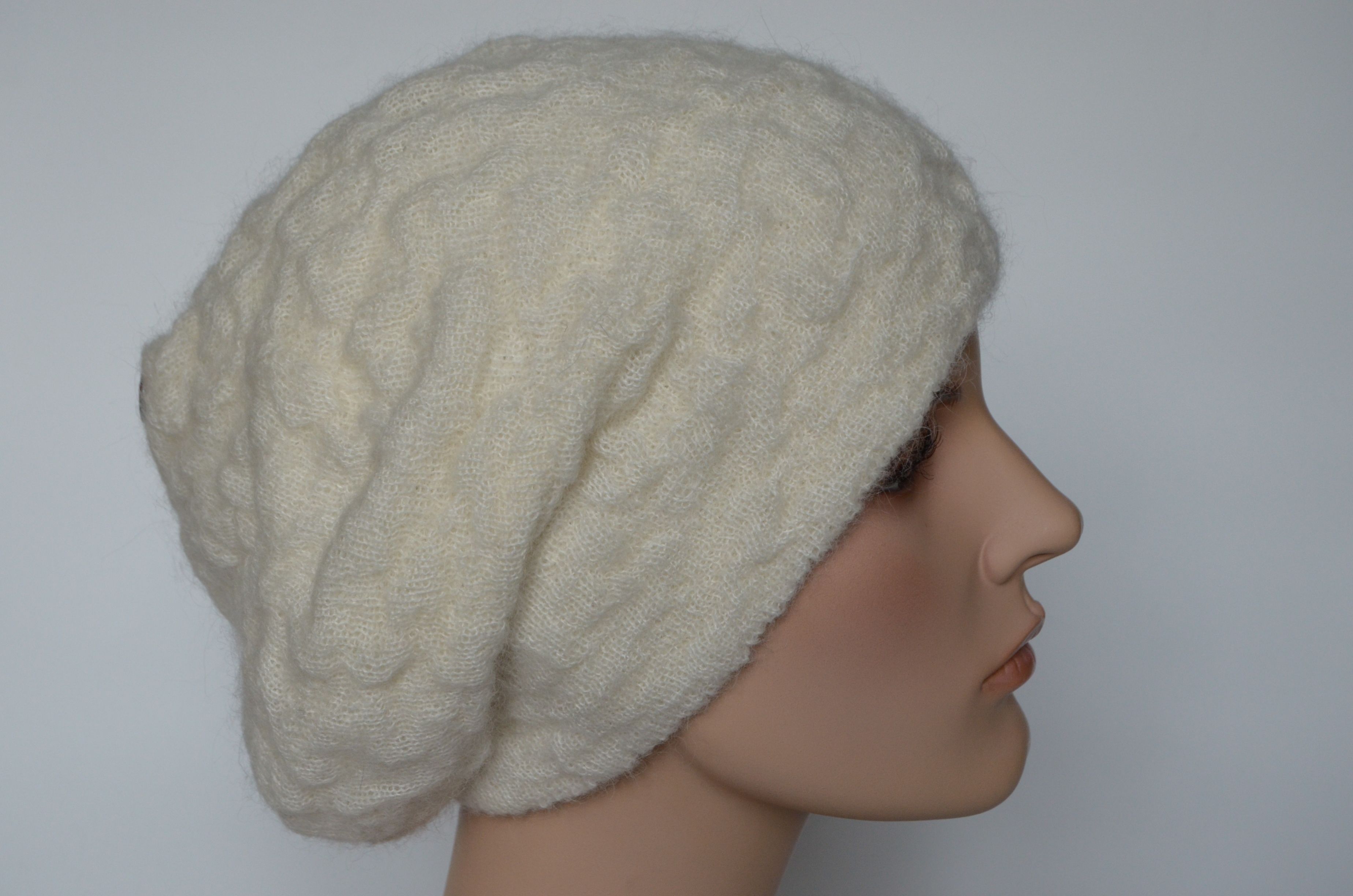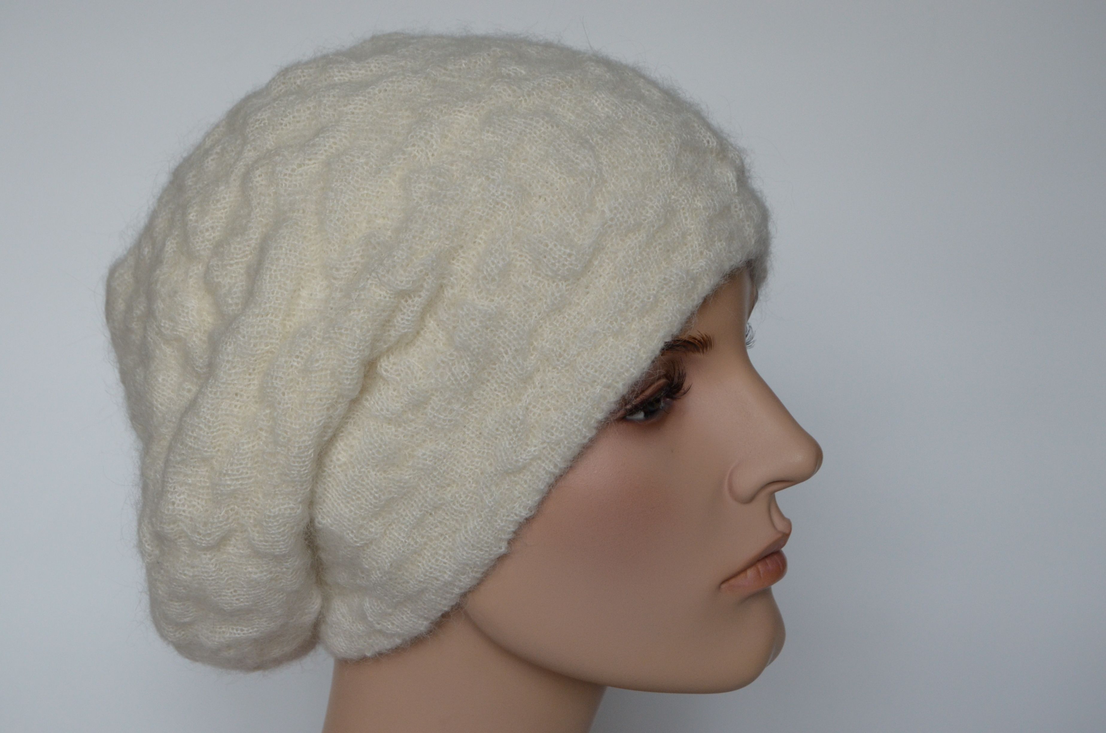 Женский рельефный берет вязаный белого цвета осень - зима - весна