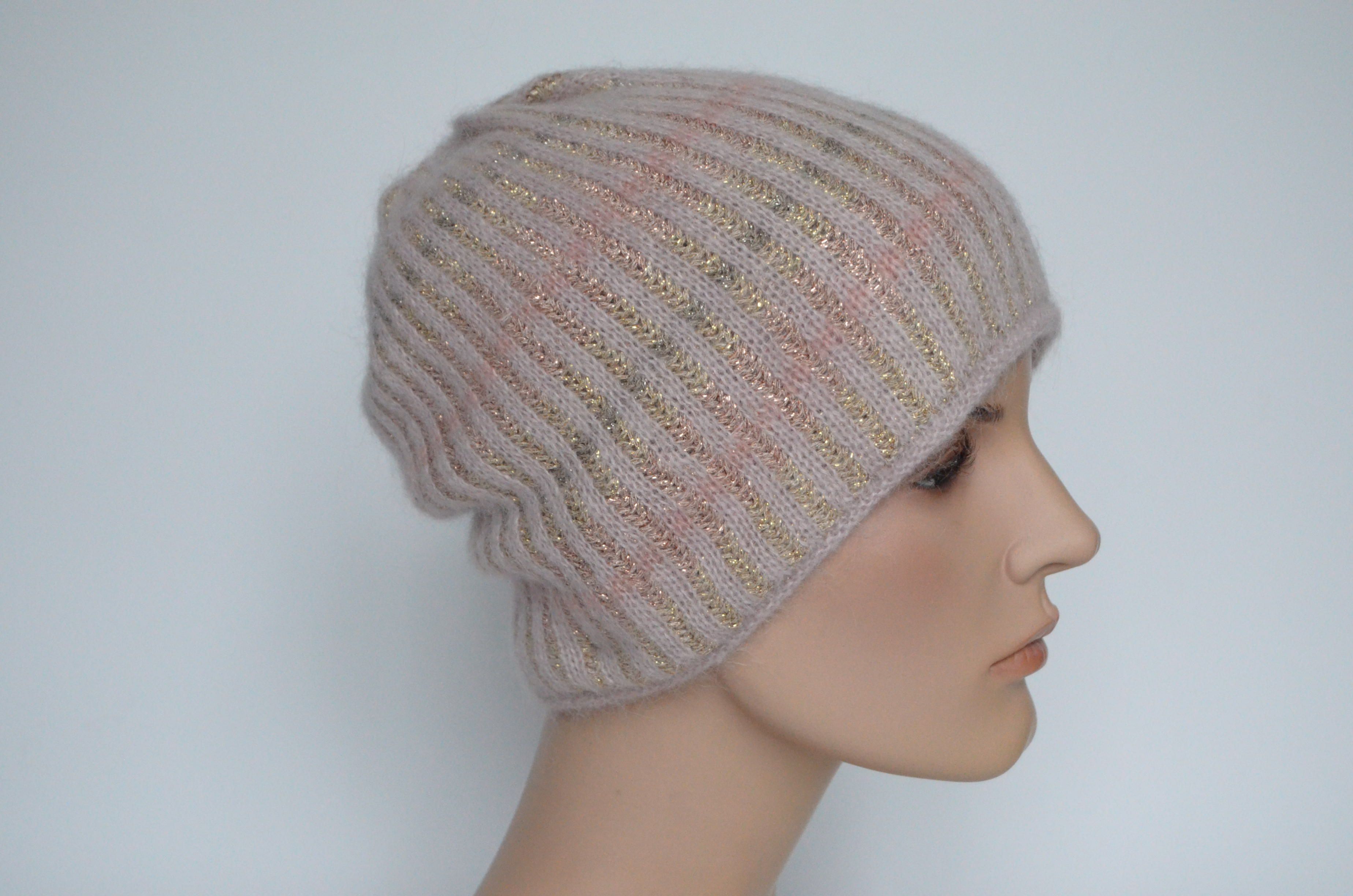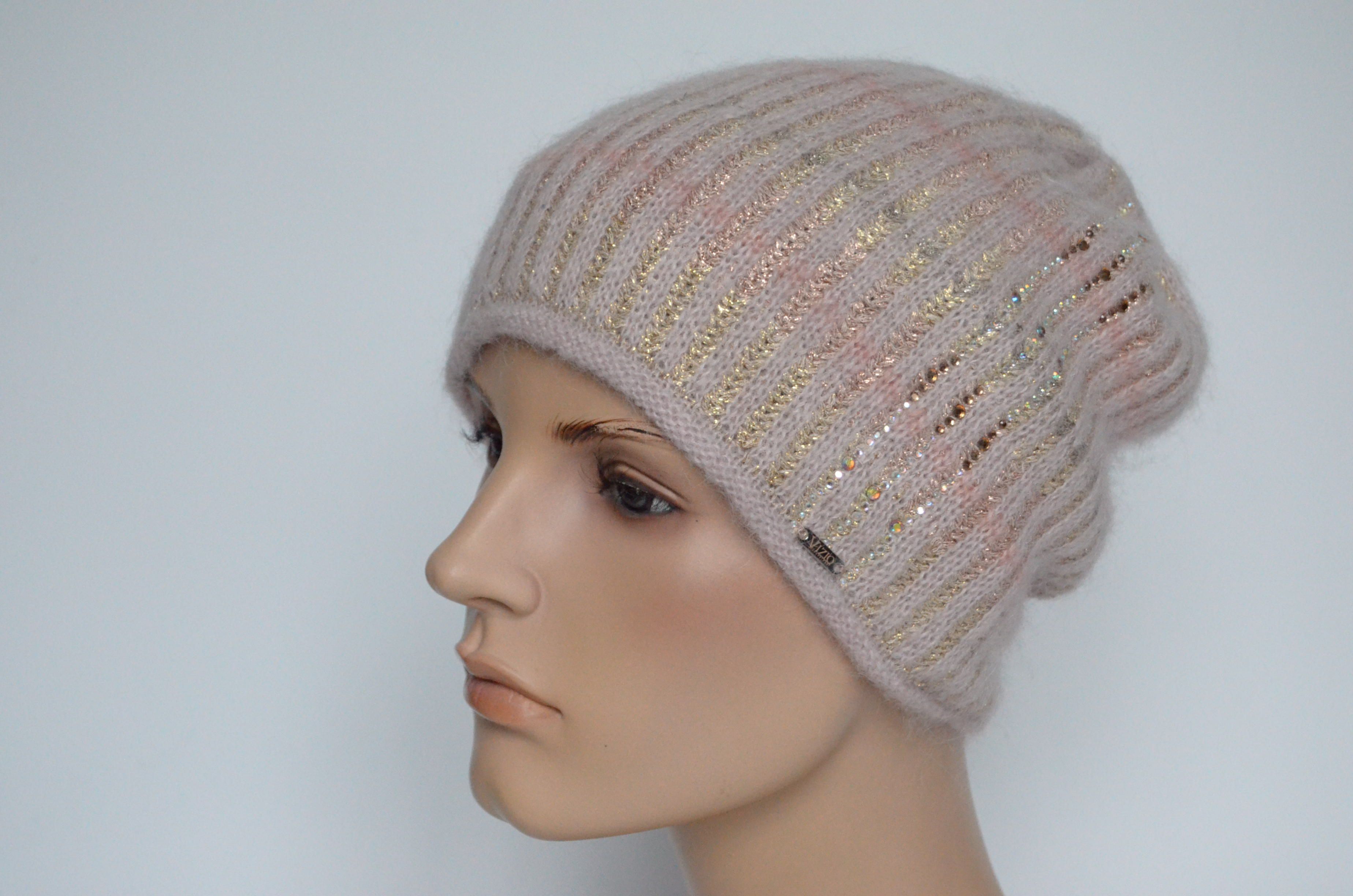Итальянская розовая вязаная шапка с тремя полосками из страз Vizio Италия 8007 CY зима 2022 - 2023 купить в Москве и России интернет магазин головных уборов Италии Визио