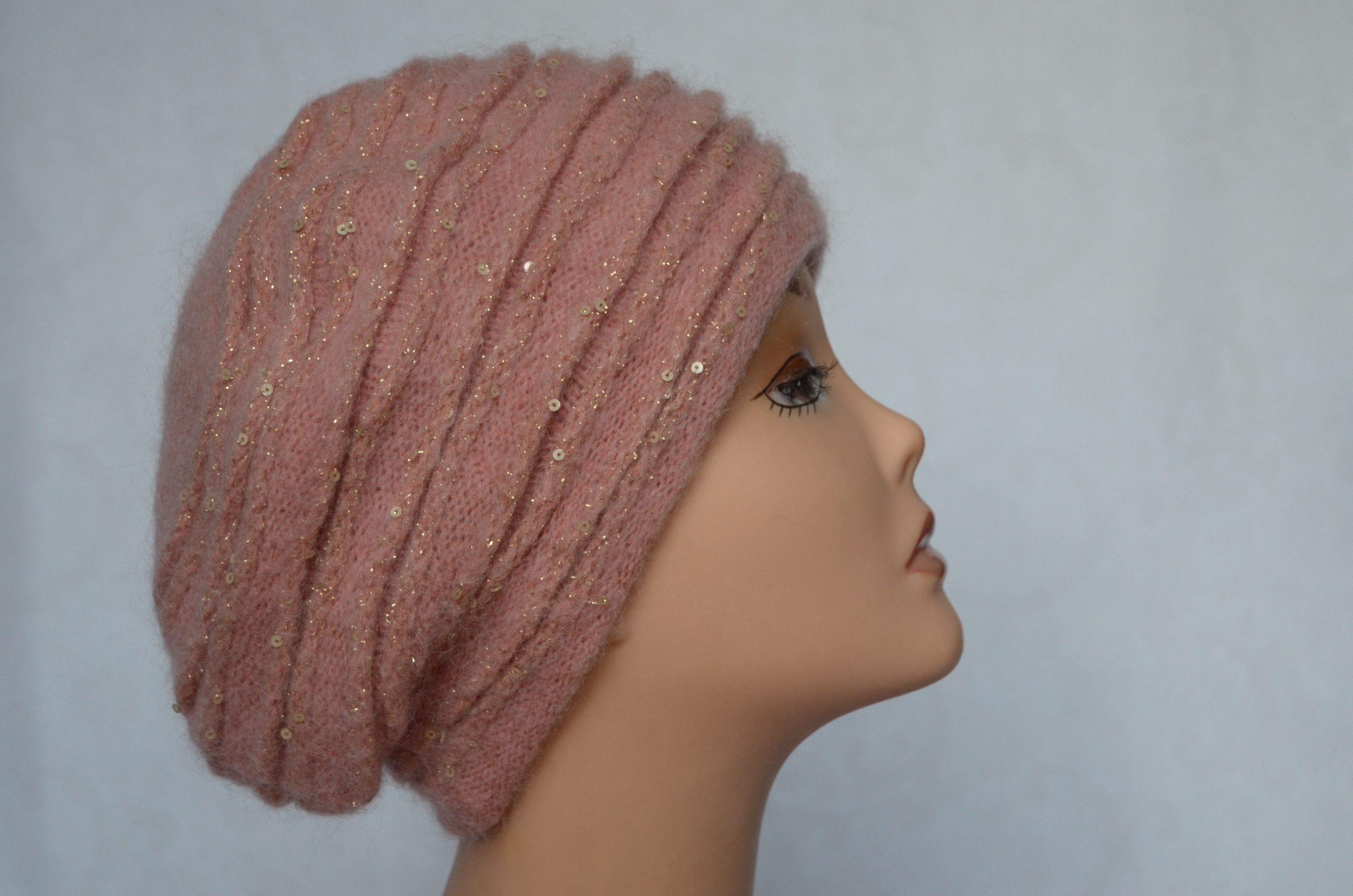 Женский вязаный берет зимний розовый зимний с пайетками