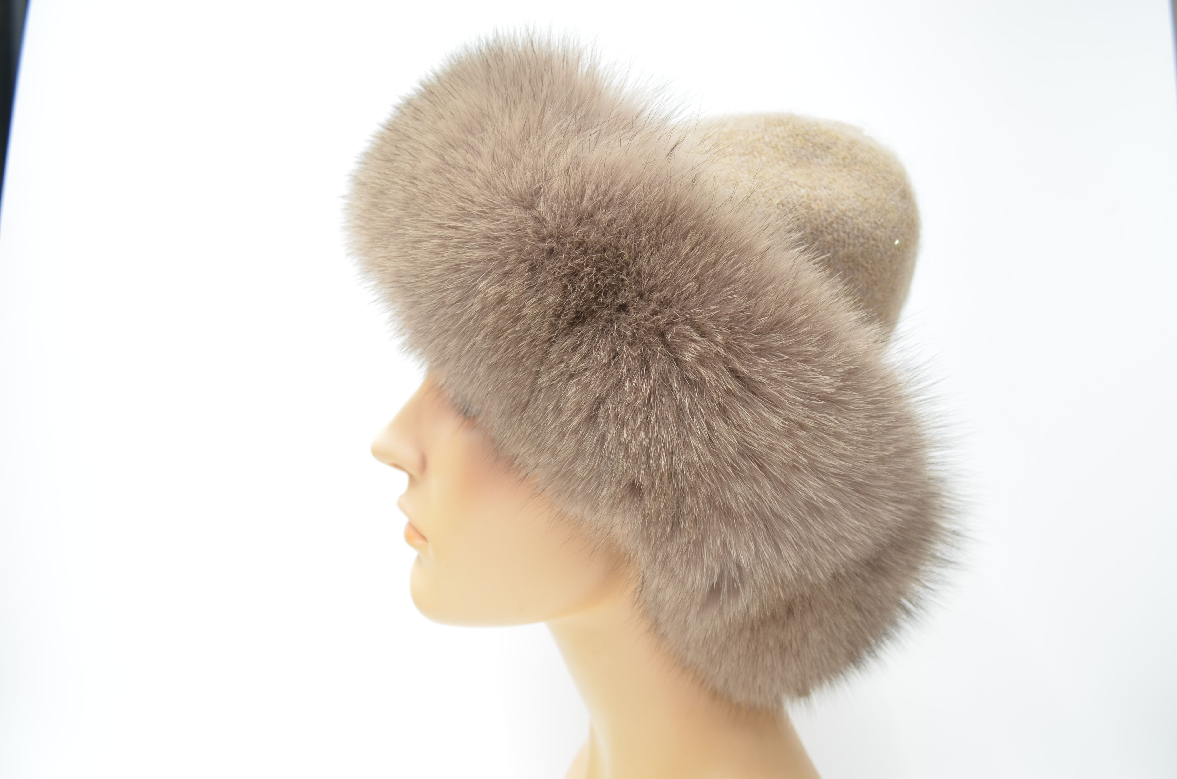 Вязаная бежевая женская шапка боярка с меховой оторочкой мехом песца