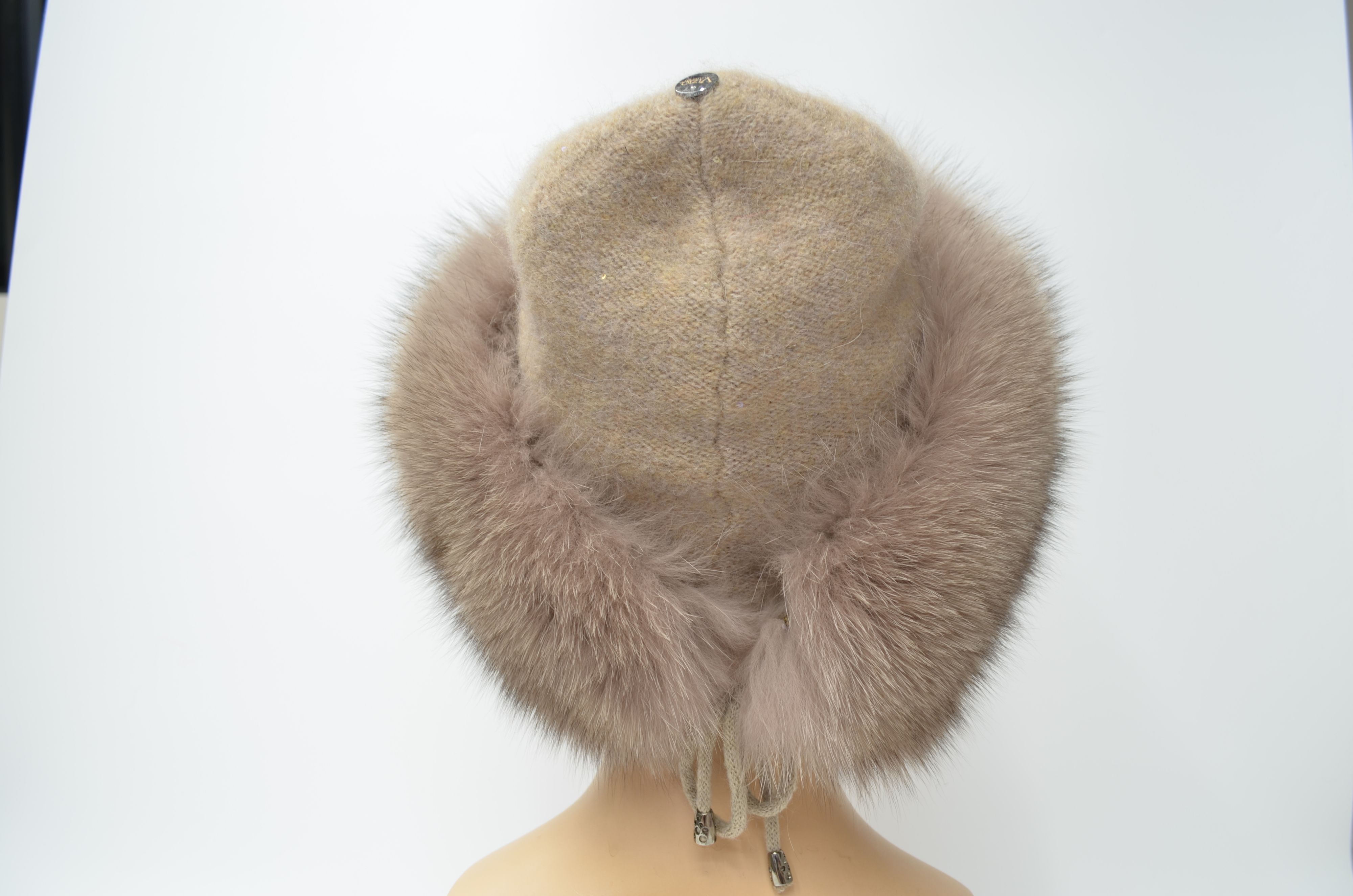 Вязаная бежевая шапка с меховой отделкой Vizio Италия 1722 CCP коллекция итальянских дизайнерских вязаных шапок с мехом бренда головных уборов Vizio Collezione зима 2025 - 2026