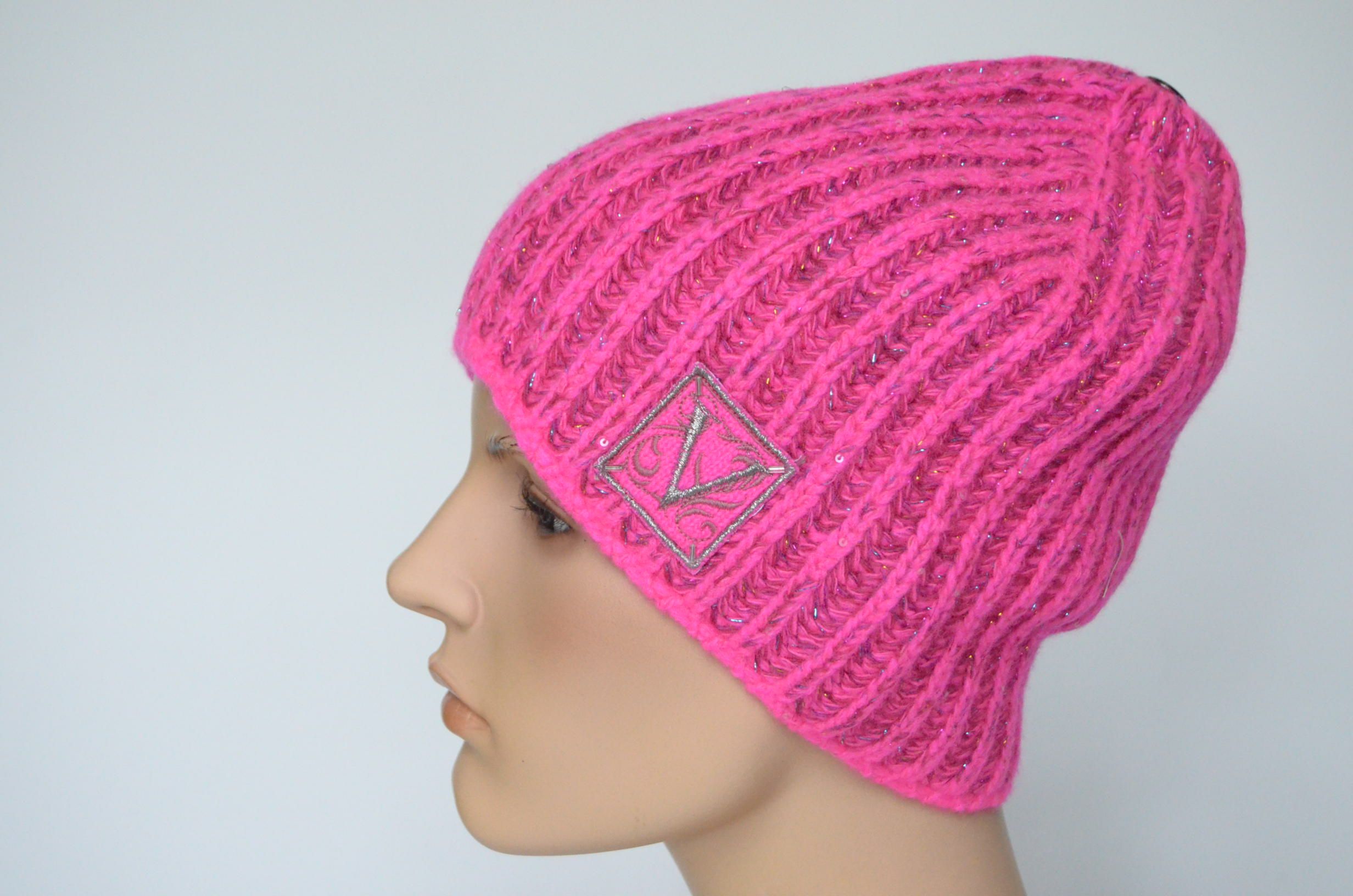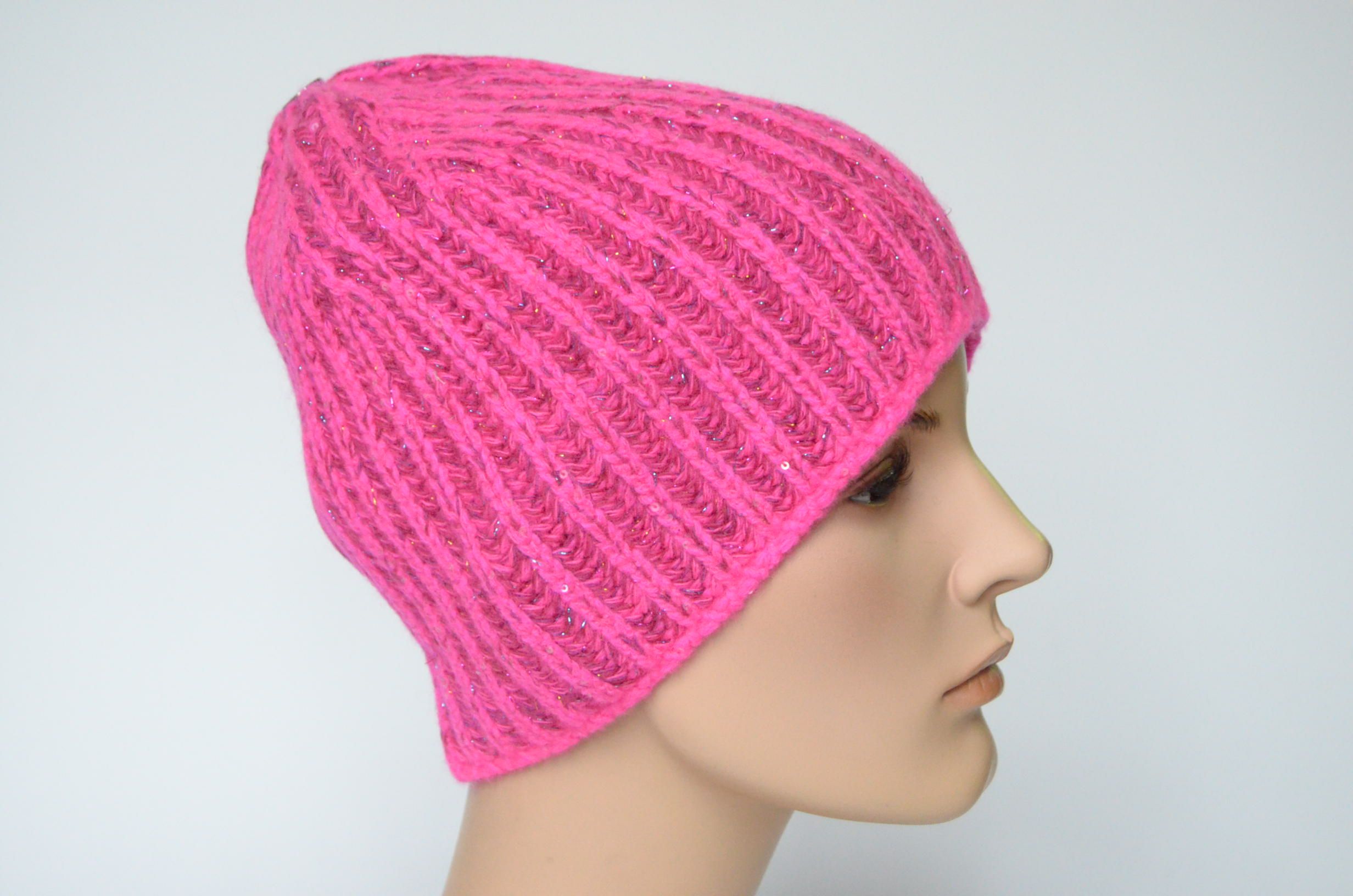 Шапка вязаная из кашемира ярко - розового цвета с украшением зима 2023 - 2024